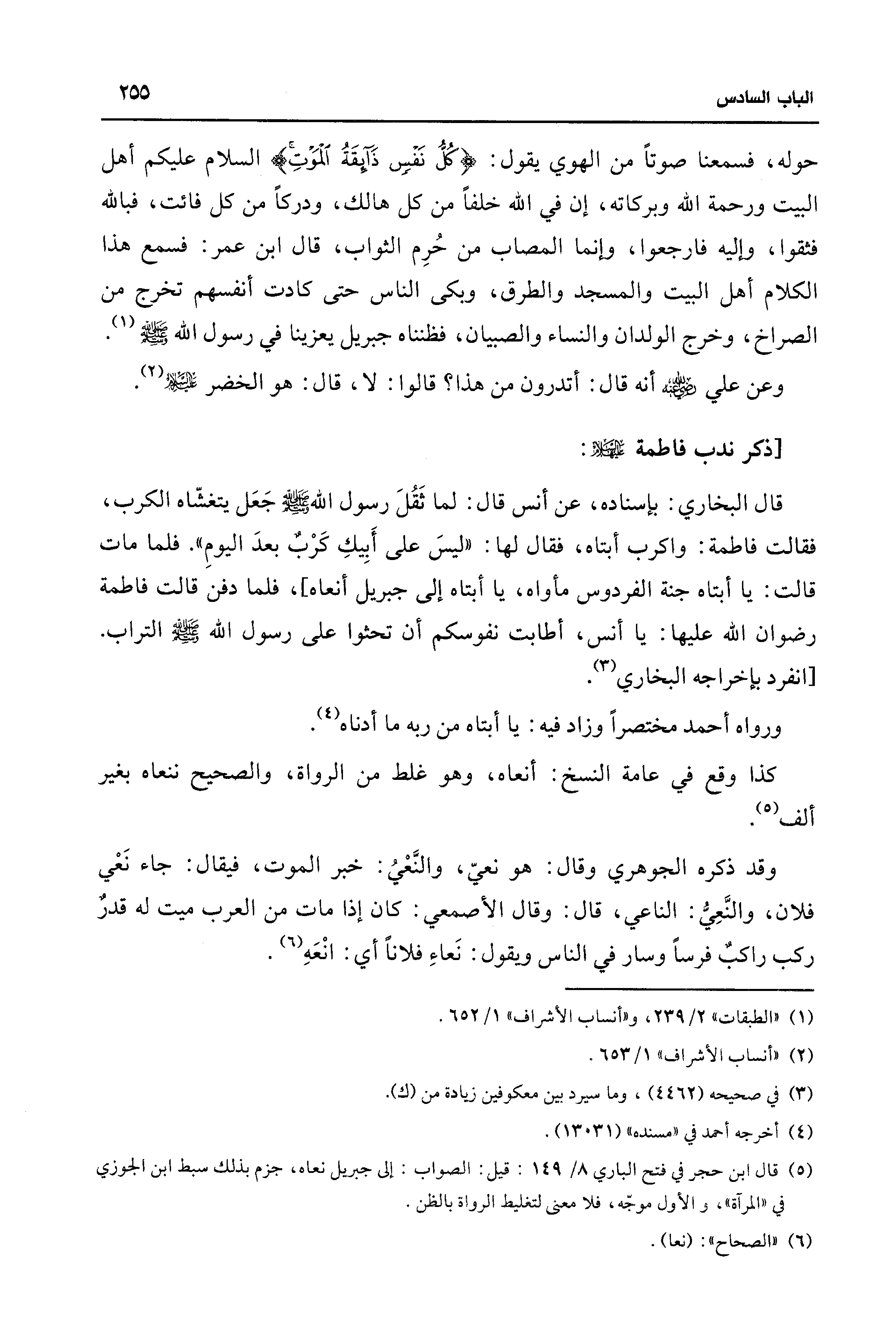 قال البخاري: بإسناده، عن أنس قال: لما ثَقُلَ رسول الله - صلى الله عليه وسلم - جَعَل يتغشّاه الكرب، فقالت فاطمة: واكرب أبتاه، فقال لها: "ليسَ على أَبِيكِ كَرْبٌ بعدَ اليومِ". فلما مات قالت: يا أبتاه جنة الفردوس مأواه، يا أبتاه إلى جبريل أنعاه]، فلما دفن قالت فاطمة رضوان الله عليها: يا أنس، أطابت نفوسكم أن تحثوا على رسول الله - صلى الله عليه وسلم - التراب. [انفرد بإخراجه البخاري (¬3).