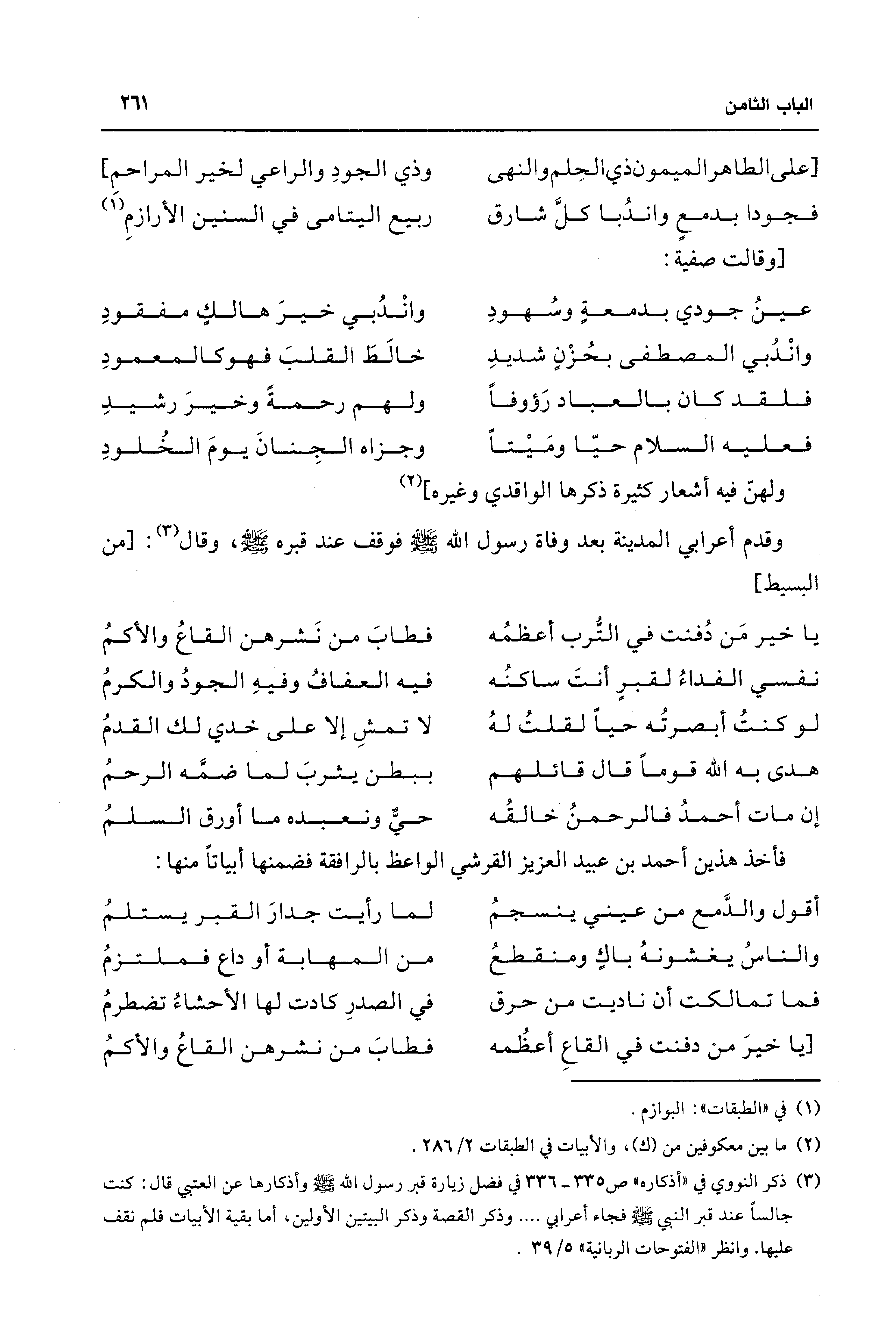 (¬3) ذكر النووي في "أذكاره" ص 335 - 336 في فضل زيارة قبر رسول الله - صلى الله عليه وسلم - وأذكارها عن العتبي قال: كنت جالسًا عند قبر النبي - صلى الله عليه وسلم - فجاء أعرابي .... وذكر القصة وذكر البيتين الأولين، أما بقية الأبيات فلم نقف عليها. وانظر "الفتوحات الربانية" 5/ 39.