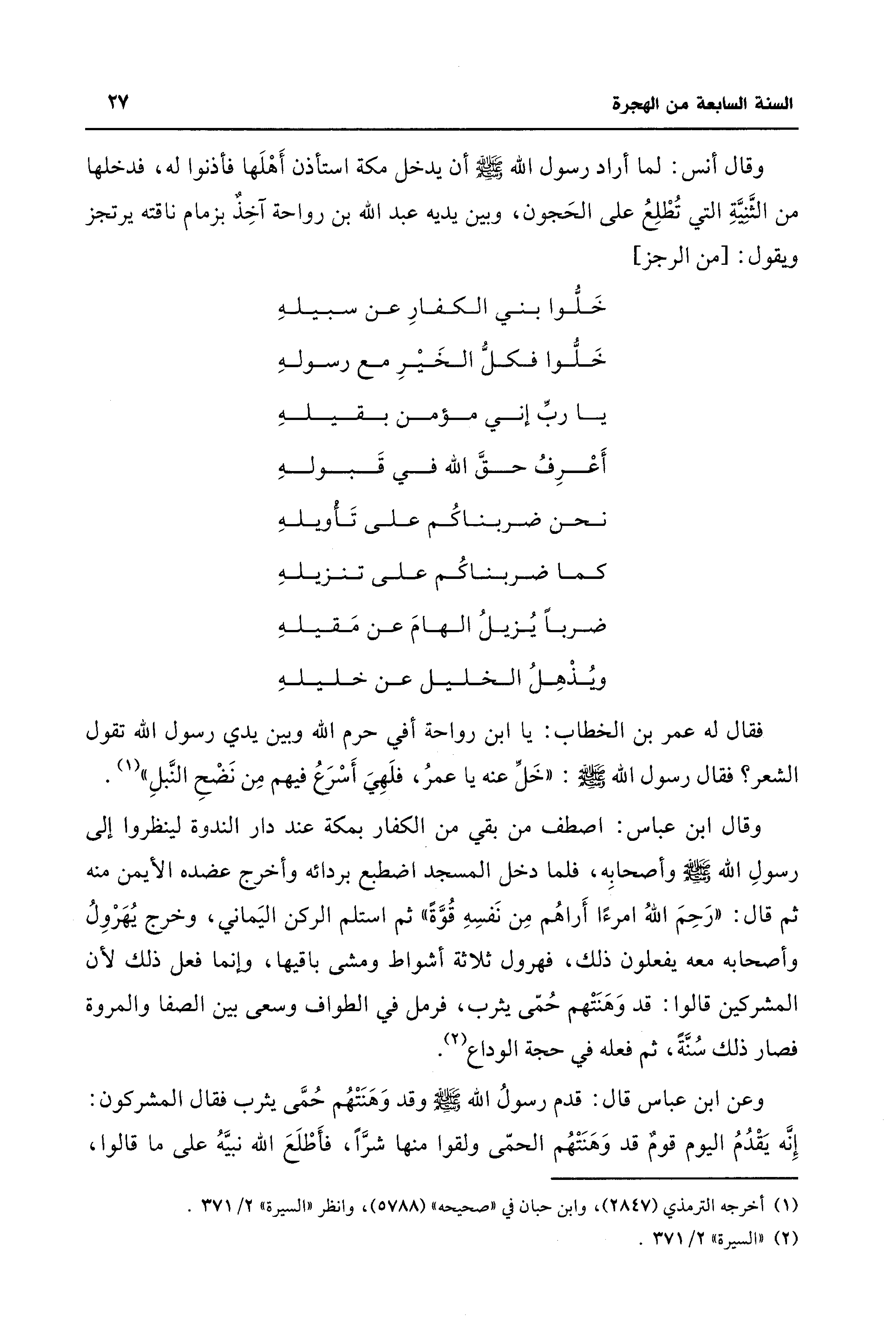 فقال له عمر بن الخطاب: يا ابن رواحة أفي حرم الله وبين يدي رسول الله تقول الشعر؟ فقال رسول الله - صلى الله عليه وسلم -: "خَلِّ عنه يا عمرُ، فلَهِيَ أَسْرَعُ فيهم مِن نَضْحِ النَّبلِ" (¬1).