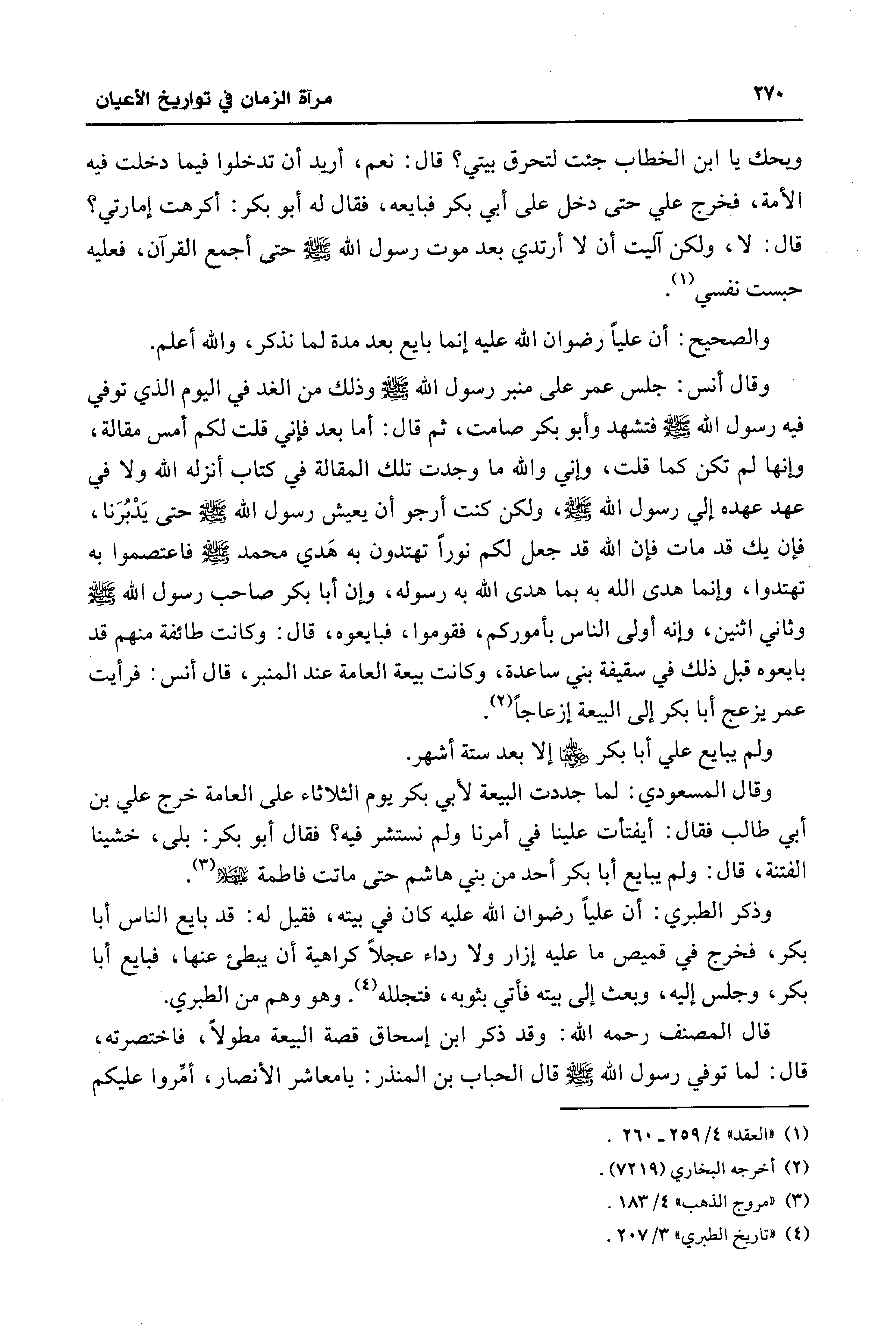 وقال المسعودي: لما جددت البيعة لأبي بكر يوم الثلاثاء على العامة خرج علي بن أبي طالب فقال: أيفتأت علينا في أمرنا ولم نستشر فيه؟ فقال أبو بكر: بلى، خشينا الفتنة، قال: ولم يبايع أبا بكر أحد من بني هاشم حتى ماتت فاطمة - عليها السلام - (¬3).