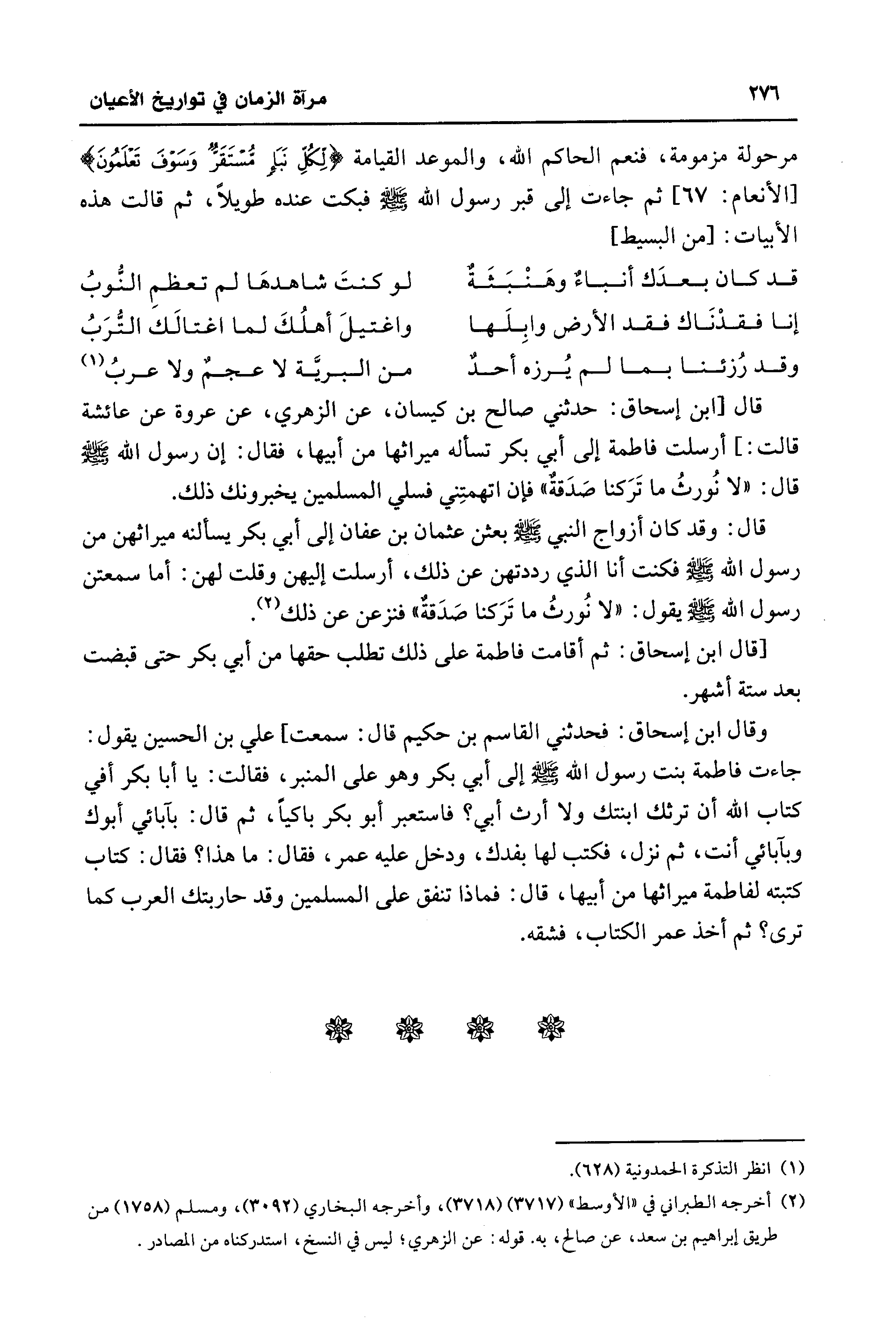 قال: وقد كان أزواج النبي - صلى الله عليه وسلم - بعثن عثمان بن عفان إلى أبي بكر يسألنه ميراثهن من رسول الله - صلى الله عليه وسلم - فكنت أنا الذي رددتهن عن ذلك، أرسلت إليهن وقلت لهن: أما سمعتن رسول الله - صلى الله عليه وسلم - يقول: "لا نُورثُ ما تَرَكنا صَدَقةٌ" فنزعن عن ذلك (¬2).