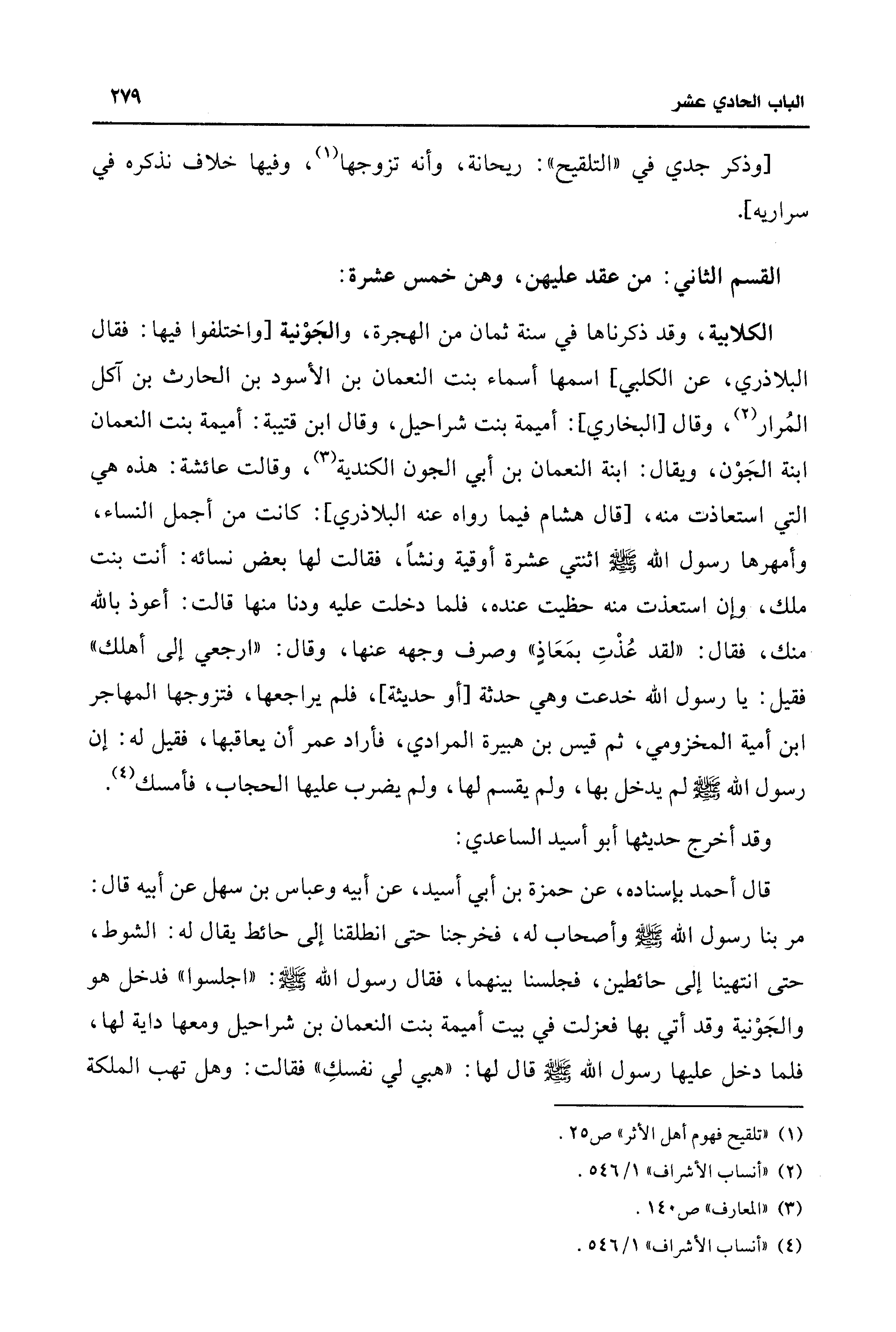 الكلابية، وقد ذكرناها في سنة ثمان من الهجرة، والجَوْنية [واختلفوا فيها: فقال البلاذري، عن الكلبي] اسمها أسماء بنت النعمان بن الأسود بن الحارث بن آكل المُرار (¬2)، وقال [البخاري]: أميمة بنت شراحيل، وقال ابن قتيبة: أميمة بنت النعمان ابنة الجَوْن، ويقال: ابنة النعمان بن أبي الجون الكندية (¬3)، وقالت عائشة: هذه هي التي استعاذت منه، [قال هشام فيما رواه عنه البلاذري]: كانت من أجمل النساء، وأمهرها رسول الله - صلى الله عليه وسلم - اثنتي عشرة أوقية ونشًا، فقالت لها بعض نسائه: أنت بنت ملك، وإن استعذت منه حظيت عنده، فلما دخلت عليه ودنا منها قالت: أعوذ بالله منك، فقال: "لقد عُذْتِ بمَعَاذٍ" وصرف وجهه عنها، وقال: "ارجعي إلى أهلك" فقيل: يا رسول الله خدعت وهي حدثة [أو حديثة]، فلم يراجعها، فتزوجها المهاجر ابن أمية المخزومي، ثم قيس بن هبيرة المرادي، فأراد عمر أن يعاقبها، فقيل له: إن رسول الله - صلى الله عليه وسلم - لم يدخل بها، ولم يقسم لها، ولم يضرب عليها الحجاب، فأمسك (¬4).
