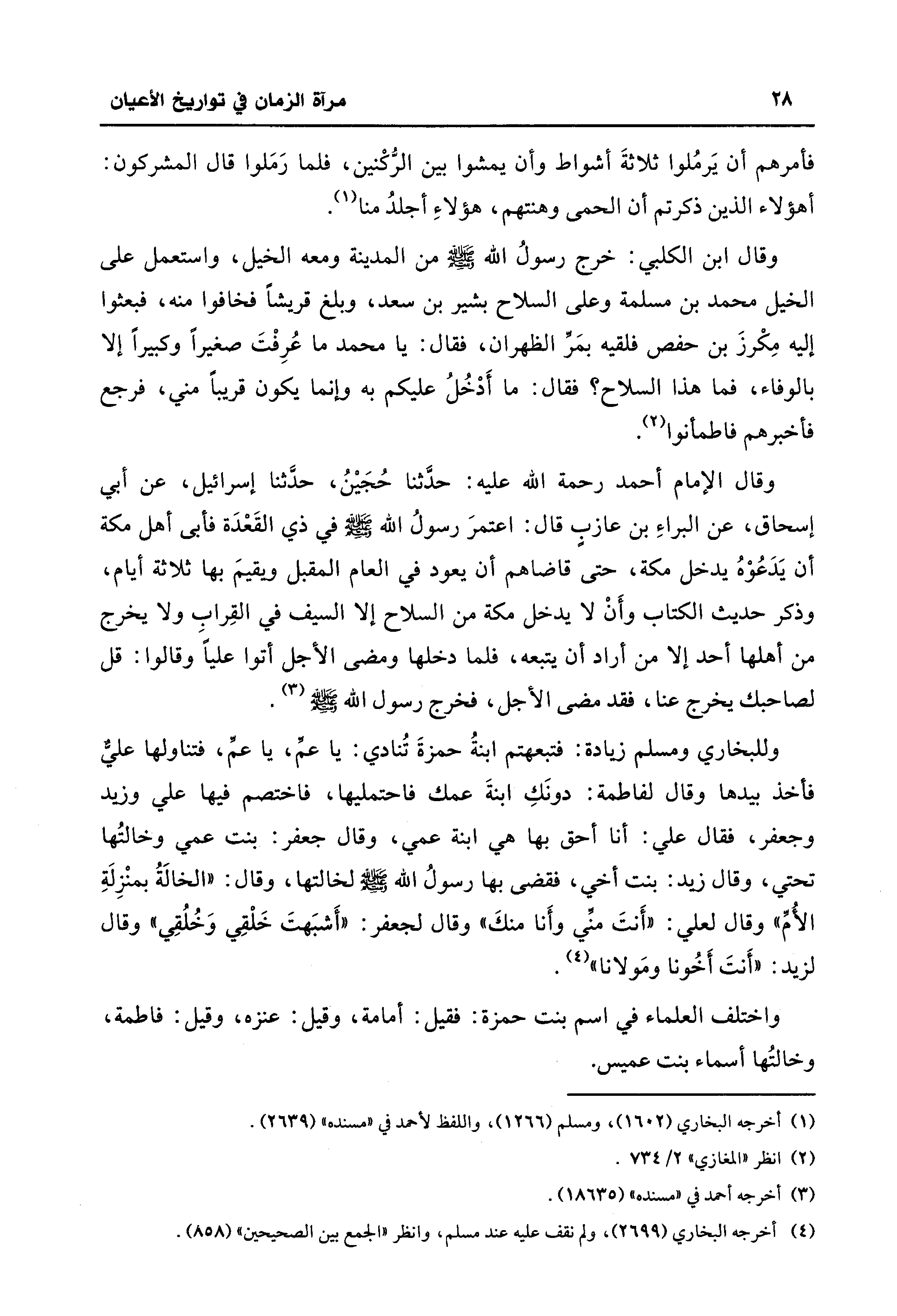 وقال الإمام أحمد رحمة الله عليه: حدَّثنا حُجَيْنُ، حدَّثنا إسرائيل، عن أبي إسحاق، عن البراءِ بن عازبٍ قال: اعتمرَ رسولُ الله - صلى الله عليه وسلم - في ذي القَعْدَة فأبى أهل مكة أن يَدَعُوْهُ يدخل مكة، حتى قاضاهم أن يعود في العام المقبل ويقيمَ بها ثلاثة أيام، وذكر حديث الكتاب وأَنْ لا يدخل مكة من السلاح إلا السيف في القِرابِ ولا يخرج من أهلها أحد إلا من أراد أن يتبعه، فلما دخلها ومضى الأجل أتوا عليًا وقالوا: قل لصاحبك يخرج عنا، فقد مضى الأجل، فخرج رسول الله - صلى الله عليه وسلم - (¬3).