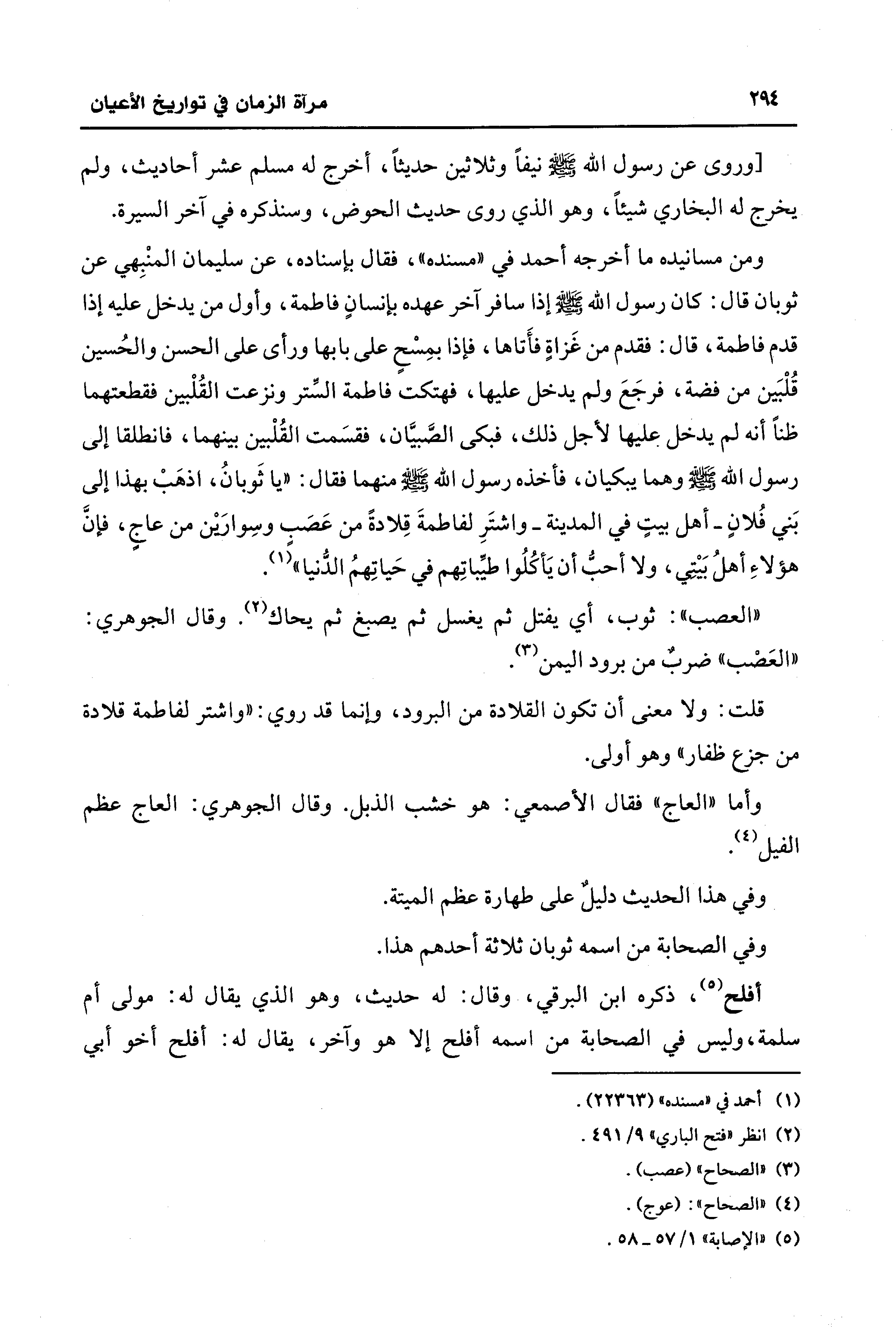 ومن مسانيده ما أخرجه أحمد في "مسنده"، فقال بإسناده، عن سليمان المنْبِهي عن ثوبان قال: كان رسول الله - صلى الله عليه وسلم - إذا سافر آخر عهده بإنسانٍ فاطمة، وأول من يدخل عليه إذا قدم فاطمة، قال: فقدم من غَزاةٍ فأَتاها، فإذا بمِسْحٍ على بابها ورأى على الحسن والحُسين قُلْبَين من فضة، فرجَعَ ولم يدخل عليها، فهتكت فاطمة السِّتر ونزعت القُلْبين فقطعتهما ظنًا أنه لم يدخل عليها لأجل ذلك، فبكى الصَّبيَّان، فقسَمت القُلْبين بينهما، فانطلقا إلى رسول الله - صلى الله عليه وسلم - وهما يبكيان، فأخذه رسول الله - صلى الله عليه وسلم - منهما فقال: "يا ثَوبانُ، اذهَبْ بهذا إلى بَني فُلانٍ - أهل بيتٍ في المدينة - واشتَرِ لفاطمةَ قِلادةً من عَصَب وسِوارَيْن من عاجٍ، فإنَّ هؤلاءِ أهلُ بَيْتِي، ولا أحبُّ أن يَأكُلُوا طيِّباتِهم في حَياتِهمُ الدُّنيا" (¬1).