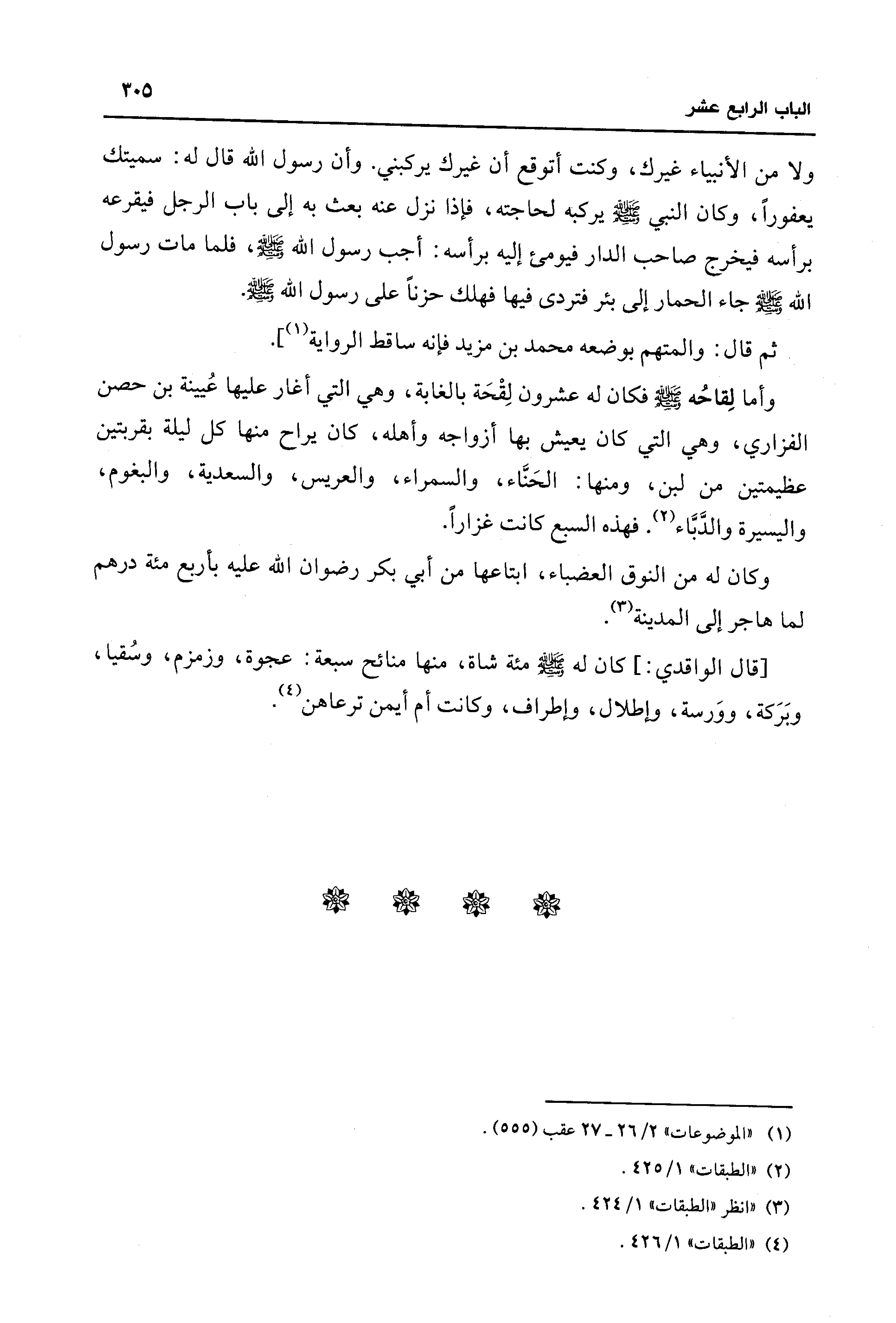 وكان له من النوق العضباء، ابتاعها من أبي بكر رضوان الله عليه باربع مئة درهم لما هاجر إلى المدينة (¬3).