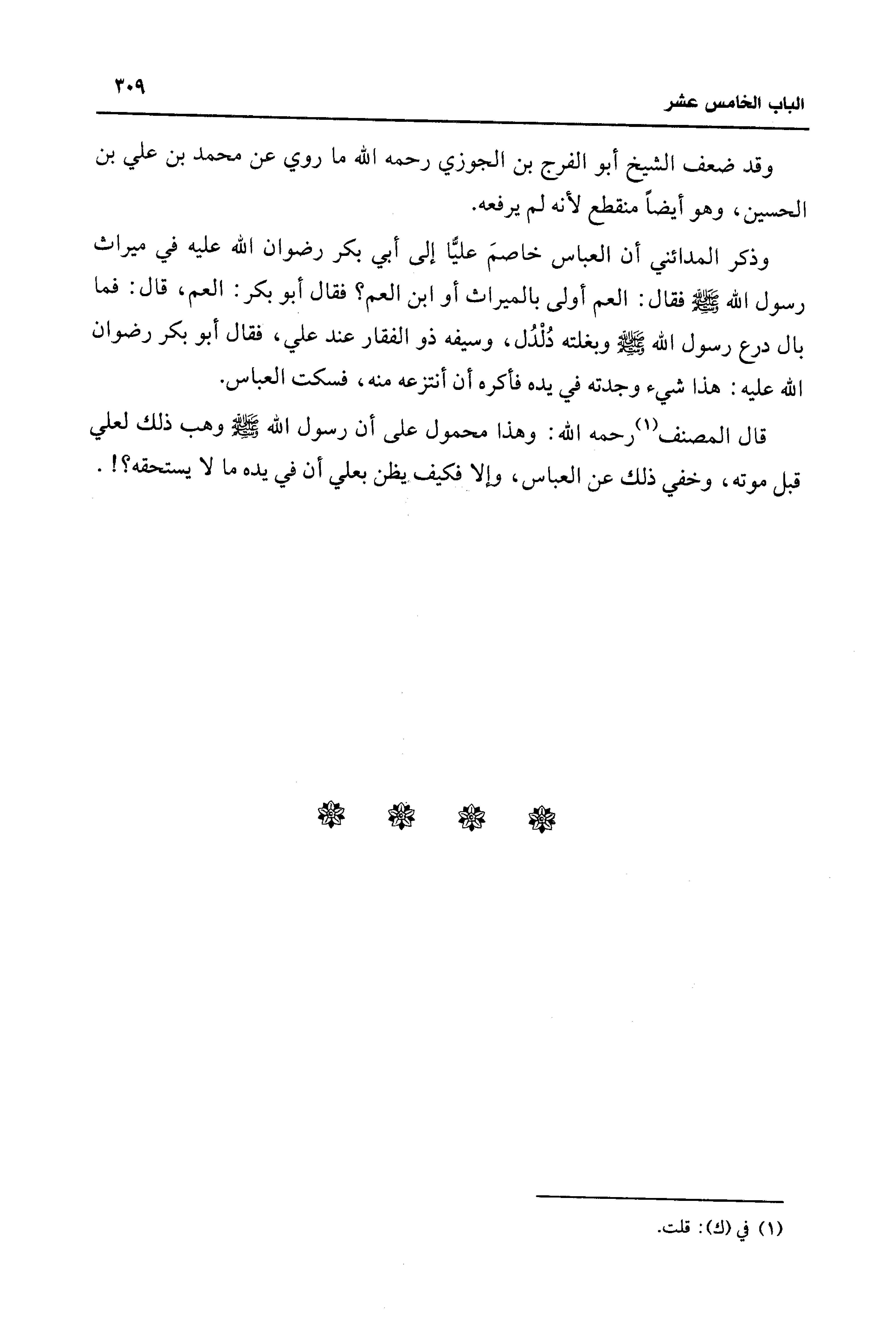وذكر المدائني أن العباس خاصمَ عليًّا إلى أبي بكر رضوان الله عليه في ميراث رسول الله - صلى الله عليه وسلم - فقال: العم أولى بالميراث أو ابن العم؟ فقال أبو بكر: العم، قال: فما بال درع رسول الله - صلى الله عليه وسلم - وبغلته دُلْدُل، وسيفه ذو الفقار عند علي، فقال أبو بكر رضوان الله عليه: هذا شيء وجدته في يده فأكره أن أنتزعه منه، فسكت العباس.