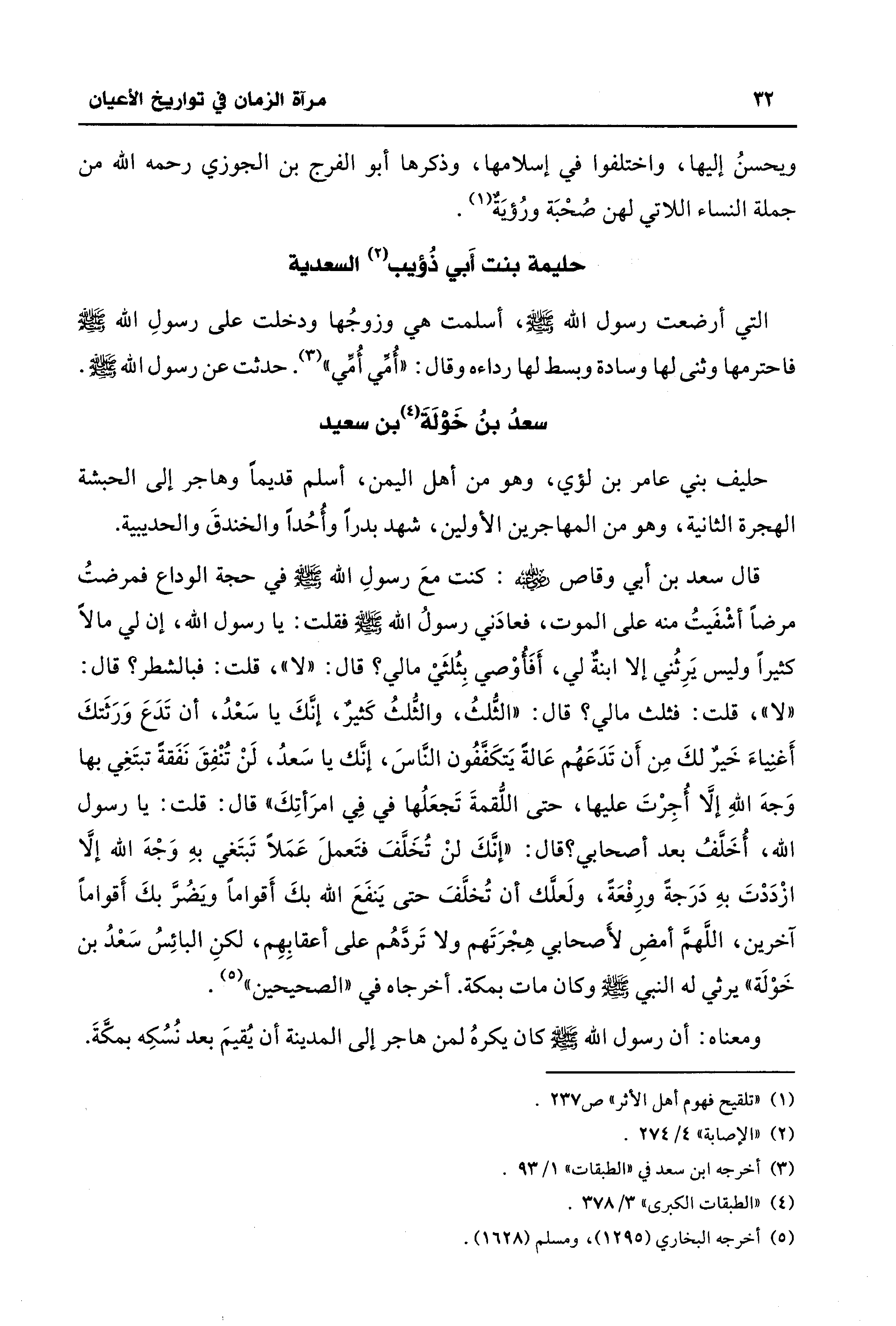 قال سعد بن أبي وقاص - رضي الله عنه -: كنت معَ رسولِ الله - صلى الله عليه وسلم - في حجة الوداع فمرضتُ مرضًا أشْفَيتُ منه على الموت، فعادَني رسولُ الله - صلى الله عليه وسلم - فقلت: يا رسول الله، إن لي مالًا كثيرًا وليس يَرِثُني إلا ابنةٌ لي، أَفَأُوْصي بِثُلثَيْ مالي؟ قال: "لا"، قلت: فبالشطر؟ قال: "لا"، قلت: فثلث مالي؟ قال: "الثُّلثُ، والثُّلثُ كَثيرٌ، إنَّكَ يا سَعْدُ، أن تَدَعَ وَرَثَتكَ أَغنِياءَ خَيرٌ لكَ مِن أَن تَدَعَهُم عَالةً يَتكَفَّفُون النَّاسَ، إنَّك يا سَعدُ، لَنْ تُنْفِقَ نَفَقةً تبتَغِي بها وَجهَ اللهِ إلَّا أُجِرْتَ عليها، حتى اللُّقمةَ تَجعَلُها في فِي امرَأتِكَ" قال: قلت: يا رسول الله، أُخَلَّفُ بعد أصحابي؟ قال: "إنَّكَ لنْ تُخَلَّفَ فتَعملَ عَمَلًا تَبتَغي بهِ وَجْهَ الله إلَّا ازْدَدْتَ بهِ دَرَجةً ورِفْعَةً، ولَعلَّك أن تُخلَّفَ حتى يَنفَعَ الله بكَ أَقوامًا ويَضُرَّ بكَ أَقوامًا آخرين، اللَّهمَّ أمضِ لأَصحابي هِجْرَتَهم ولا تَردَّهُم على أعقابِهِم، لكنِ البائِسُ سَعْدُ بن خَوْلَة" يرثي له النبي - صلى الله عليه وسلم - وكان مات بمكة. أخرجاه في "الصحيحين" (¬5).