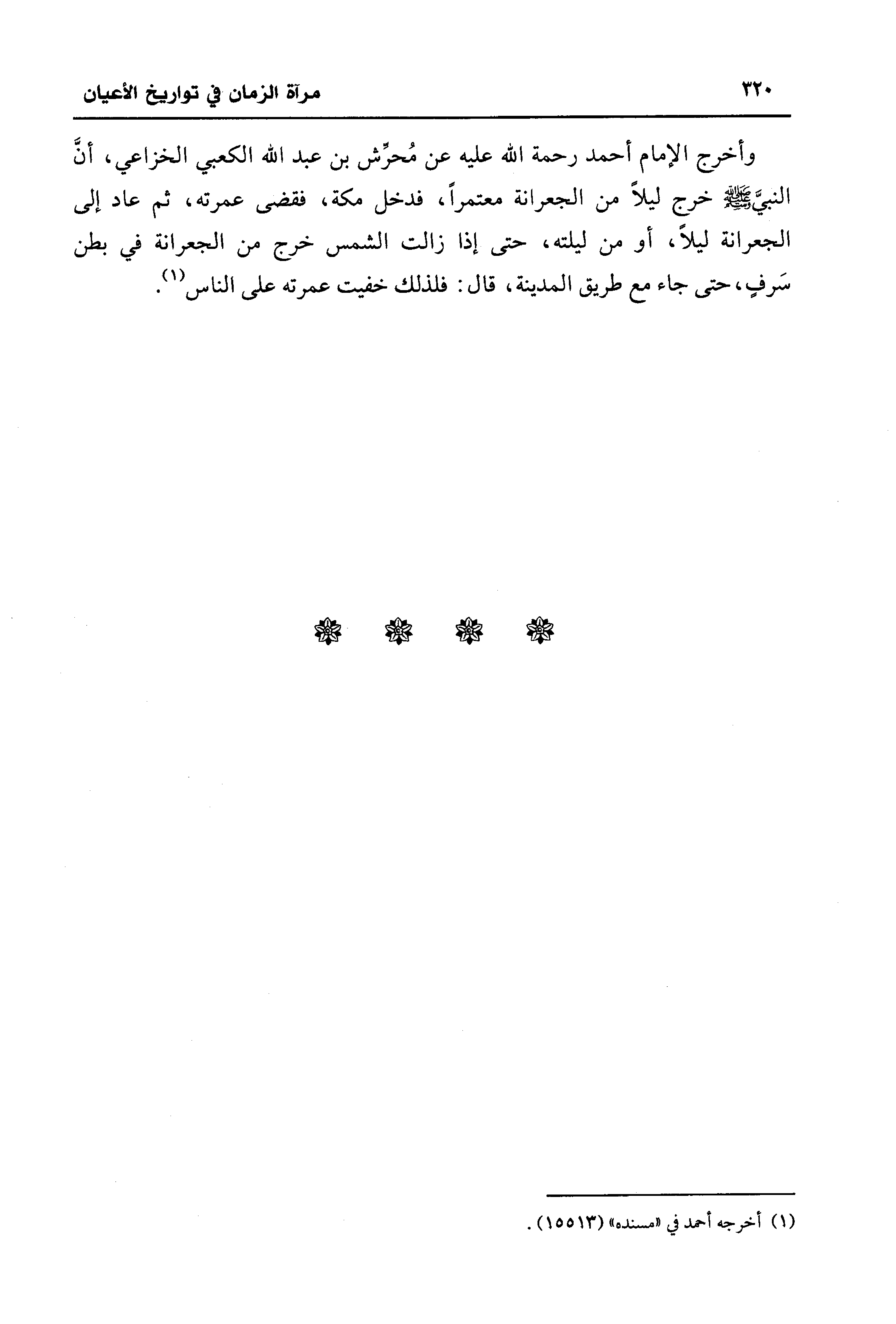 وأخرج الإمام أحمد رحمة الله عليه عن مُحرَّش بن عبد الله الكعبي الخزاعي، أنَّ النبيَّ - صلى الله عليه وسلم - خرج ليلًا من الجعرانة معتمرًا، فدخل مكة، فقضى عمرته، ثم عاد إلى الجعرانة ليلًا، أو من ليلته، حتى إذا زالت الشمس خرج من الجعرانة في بطن سَرفٍ، حتى جاء مع طريق المدينة، قال: فلذلك خفيت عمرته على الناس (¬1).