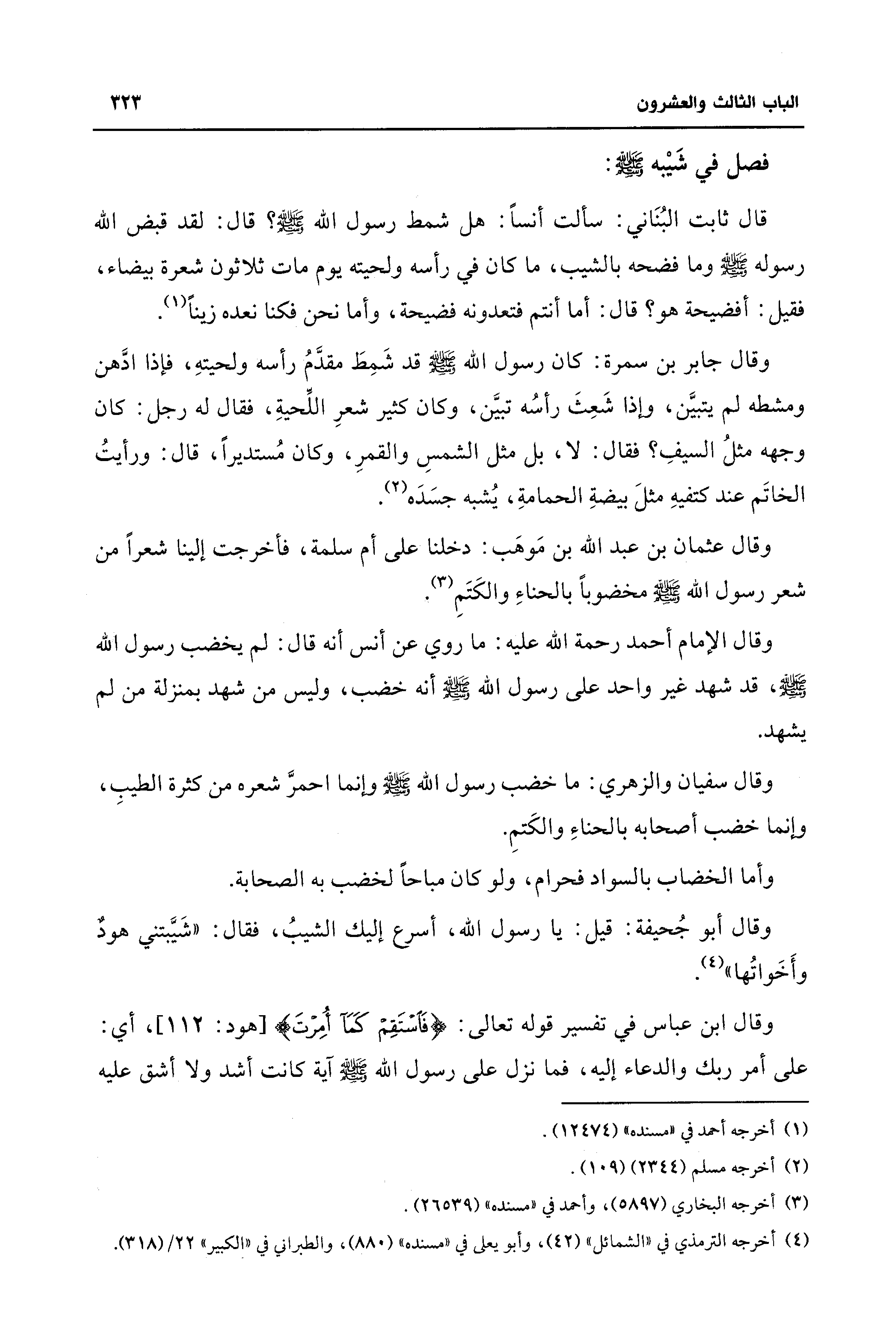 وقال الإمام أحمد رحمة الله عليه: ما روي عن أنس أنه قال: لم يخضب رسول الله - صلى الله عليه وسلم -، قد شهد غير واحد على رسول الله - صلى الله عليه وسلم - أنه خضب، وليس من شهد بمنزلة من لم يشهد.