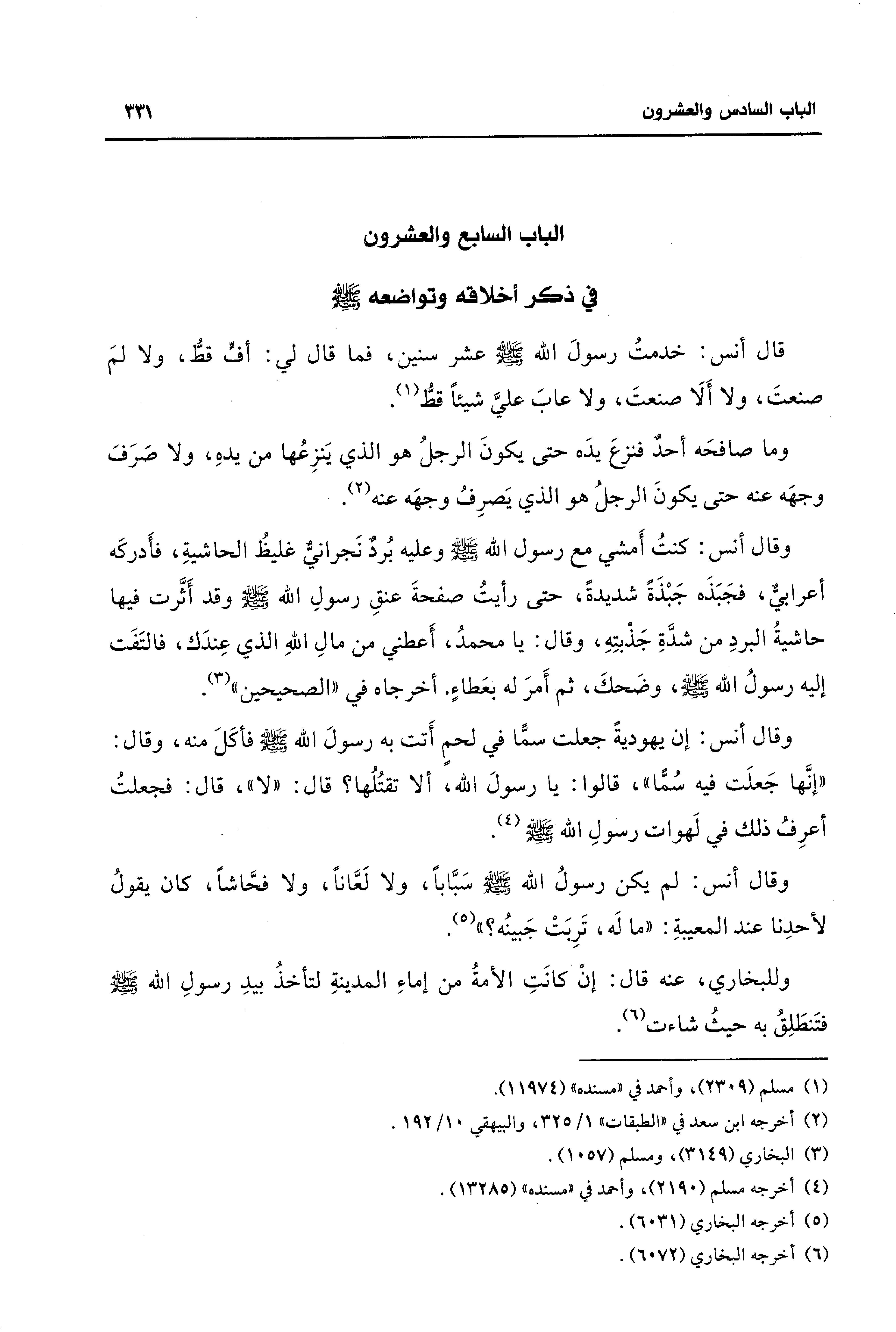 وللبخاري، عنه قال: إنْ كانَتِ الأمةُ من إماءِ المدينةِ لتأخذُ بيدِ رسولِ الله - صلى الله عليه وسلم - فتَنطَلِقُ به حيثُ شاءت (¬6).
