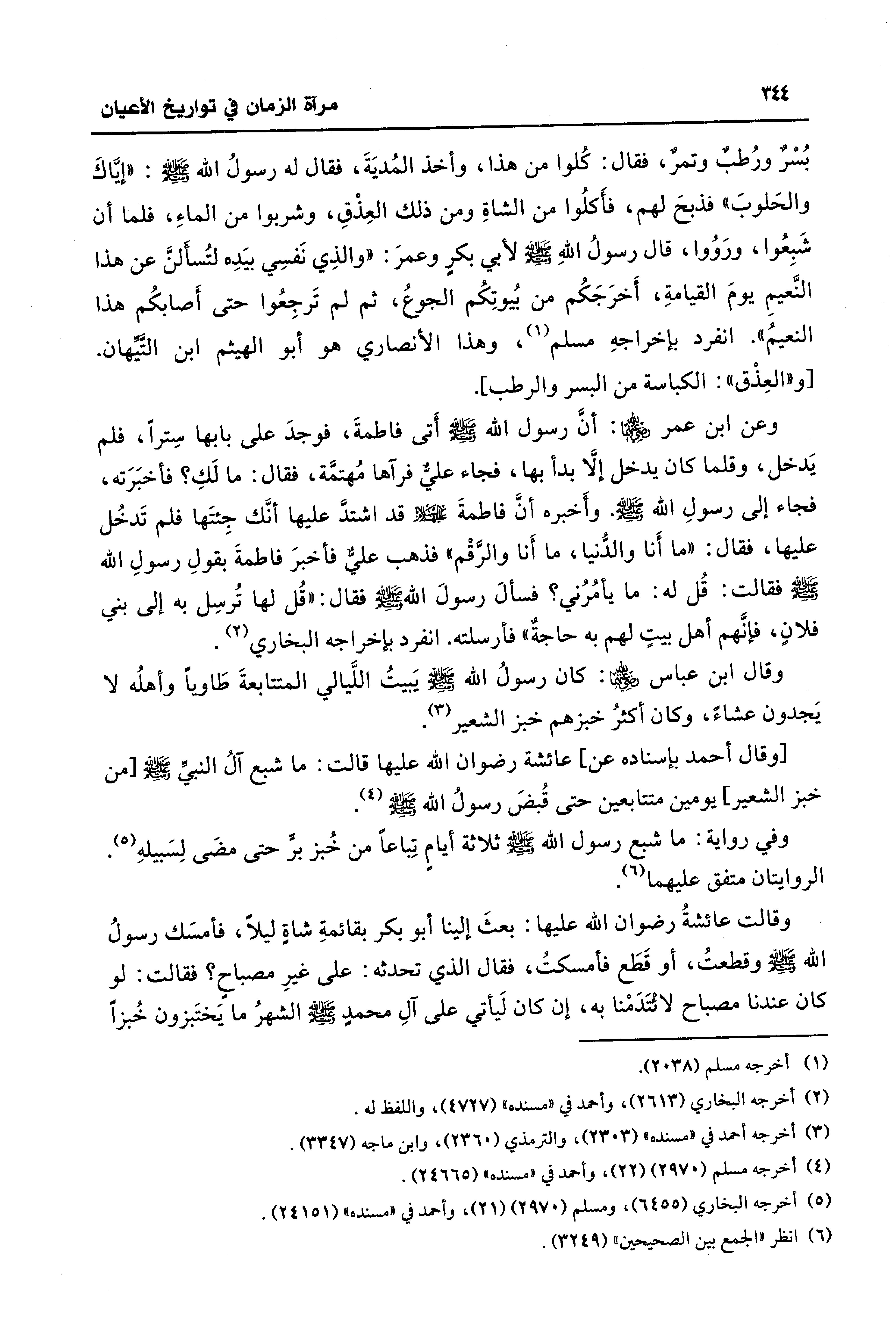 وفي رواية: ما شبع رسول الله - صلى الله عليه وسلم - ثلاثة أيام تِباعًا من خُبز برًّ حتى مضَى لِسَبيلهِ (¬5). الروايتان متفق عليهما (¬6).