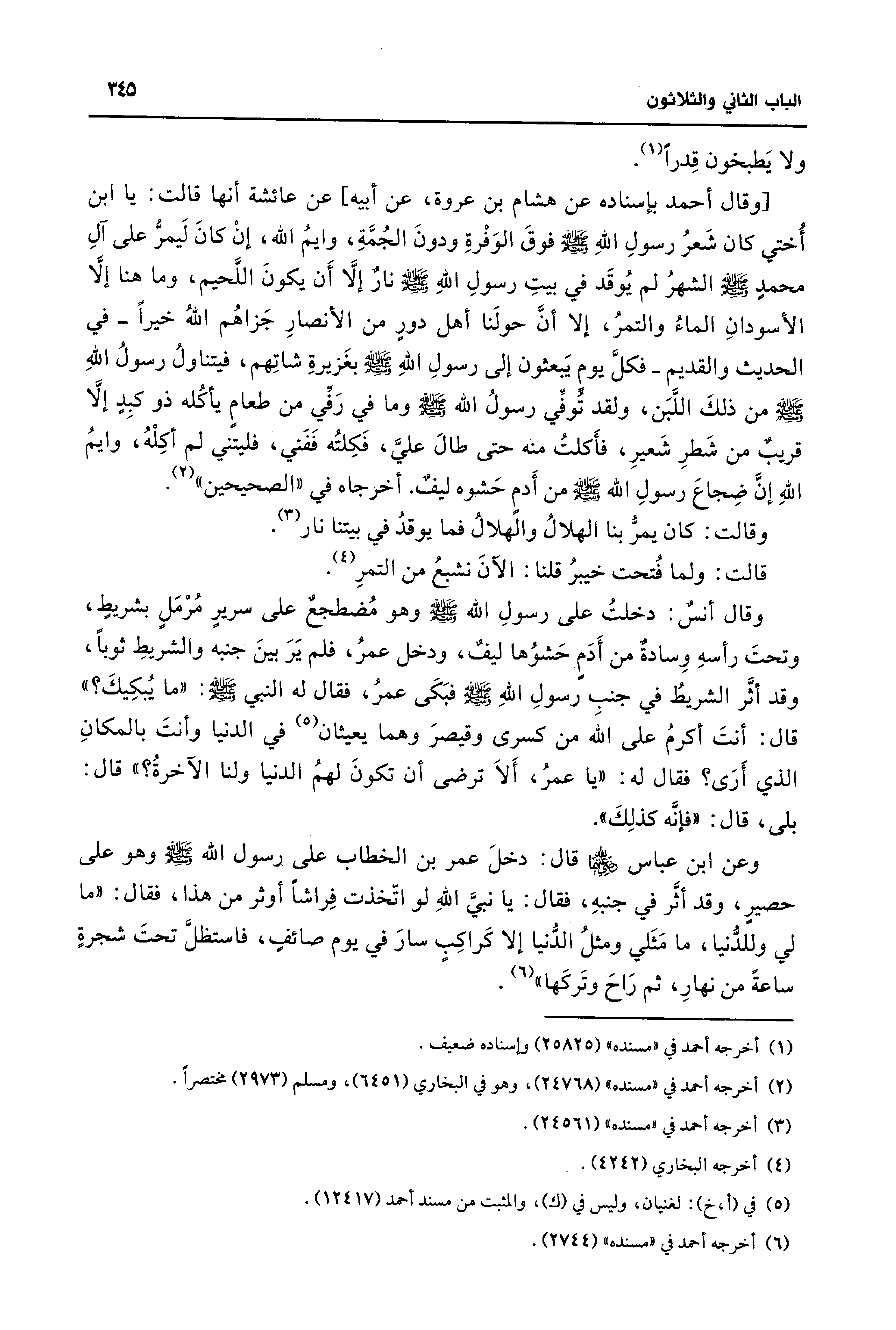 [وقال أحمد بإسناده عن هشام بن عروة، عن أبيه] عن عائشة أنها قالت: يا ابن أُختي كان شَعرُ رسولِ اللهِ - صلى الله عليه وسلم - فوقَ الوَفْرةِ ودونَ الجُمَّةِ، وايمُ الله، إنْ كانَ لَيمرُّ على آلِ محمدٍ - صلى الله عليه وسلم - الشهرُ لم يُوقَد في بيتِ رسولِ اللهِ - صلى الله عليه وسلم - نارٌ إلَّا أَن يكونَ اللَّحيم، وما هنا إلَّا الأسودانِ الماءُ والتمرُ، إلا أنَّ حولَنا أهل دورٍ من الأنصارِ جَزاهُم اللهُ خيرًا - في الحديث والقديم - فكلَّ يومٍ يَبعثون إلى رسولِ اللهِ - صلى الله عليه وسلم - بغَزيرةِ شاتِهم، فيتناولُ رسولُ اللهِ - صلى الله عليه وسلم - من ذلكَ اللَّبَن، ولقد تُوفِّي رسولُ الله - صلى الله عليه وسلم - وما في رَفِّي من طعام يأكُله ذو كبِدٍ إلَّا قريبٌ من شَطرِ شَعيرِ، فأَكلتُ منه حتى طالَ عليَّ، فَكِلتُه فَفَني، فليتني لم أكِلْهُ، وايمُ اللهِ إنَّ ضِجاعَ رسولِ الله - صلى الله عليه وسلم - من أَدمٍ حَشوه ليفٌ. أخرجاه في "الصحيحين" (¬2).