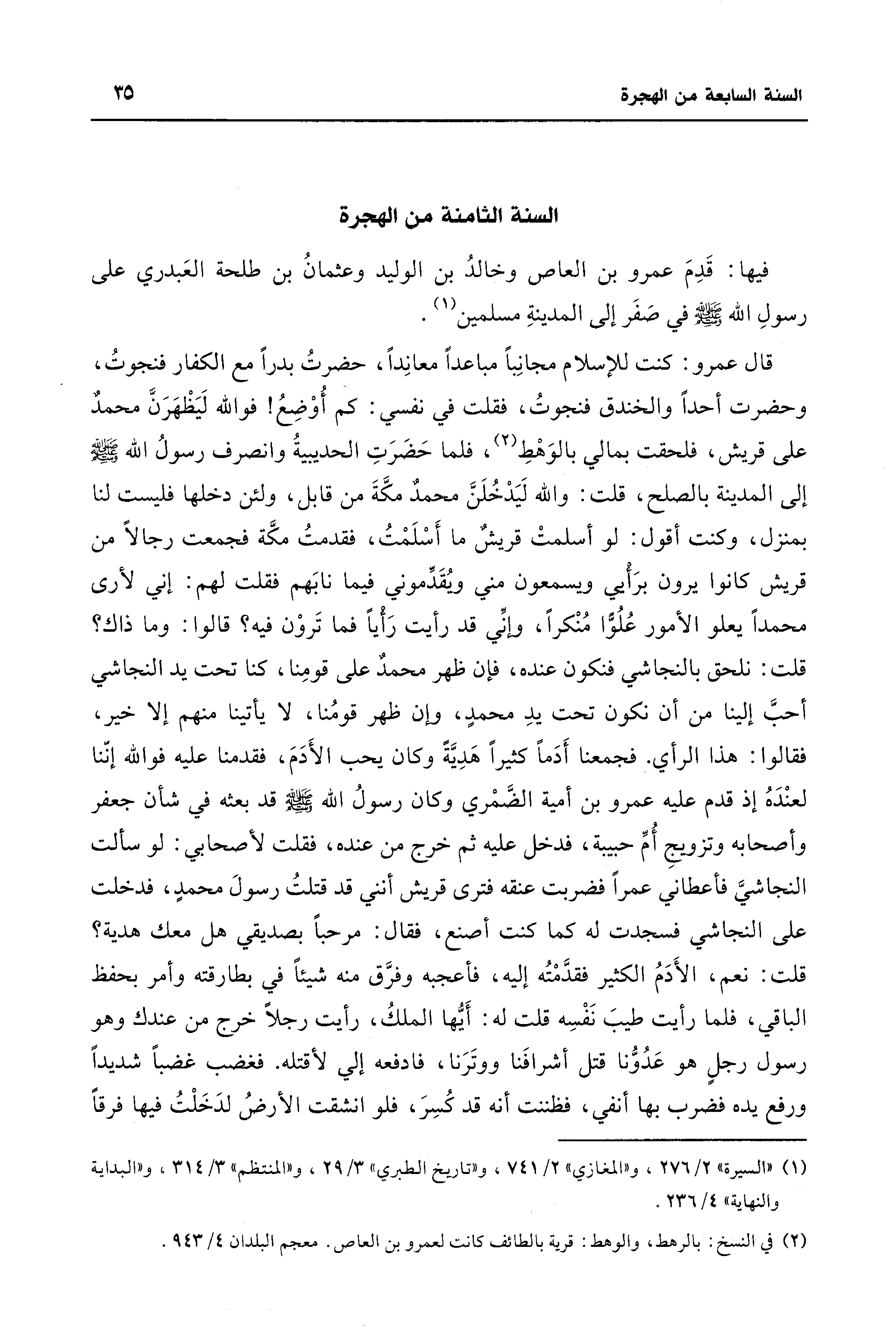 فيها: قَدِمَ عمرو بن العاص وخالدُ بن الوليد وعثمانُ بن طلحة العَبدري على رسولِ الله - صلى الله عليه وسلم - في صَفَر إلى المدينةِ مسلمين (¬1).