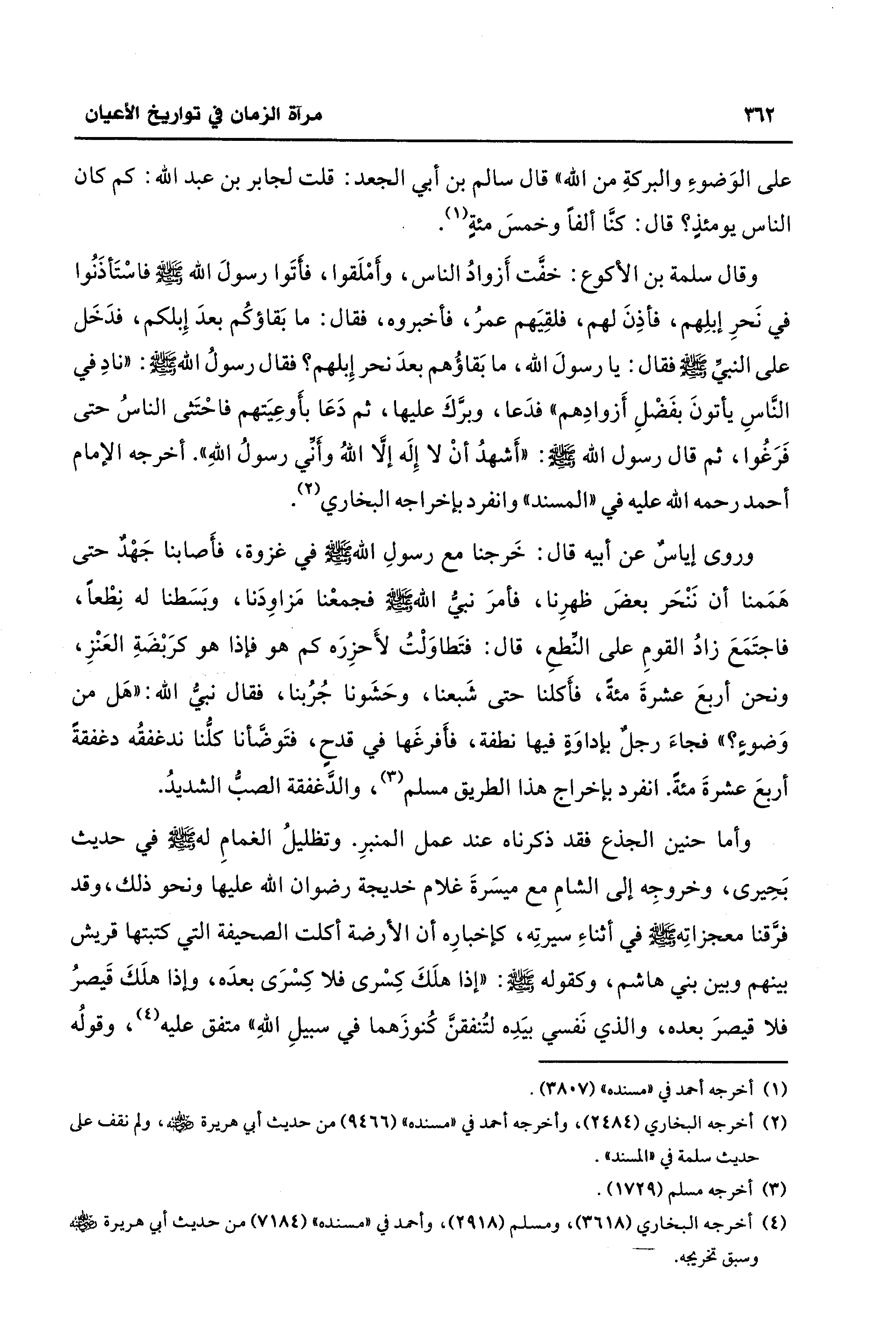 وقال سلمة بن الأكوع: خفَّت أَزوادُ الناس، وأَمْلَقوا، فأتَوا رسولَ الله - صلى الله عليه وسلم - فاسْتَأذَنُوا في نَحرِ إبلِهم، فأذِنَ لهم، فلقِيَهم عمرُ، فأخبروه، فقال: ما بَقاؤكُم بعدَ إِبلكم، فدَخَل على النبيَّ - صلى الله عليه وسلم - فقال: يا رسولَ الله، ما بَقاؤُهم بعدَ نحر إِبلهم؟ فقال رسولُ الله - صلى الله عليه وسلم -: "نادِ في النَّاسِ يأتونَ بفَضْلِ أَزوادِهم" فدَعا، وبرَّكَ عليها، ثم دَعَا بأَوعِيَتهم فاحْتَثى الناسُ حتى فَرَغُوا، ثم قال رسول الله - صلى الله عليه وسلم -: "أَشهدُ أنْ لا إِلَه إلَّا اللهُ وأَنِّي رسولُ اللهِ". أخرجه الإمام أحمد رحمة الله عليه في "المسند" وانفرد بإخراجه البخاري (¬2).