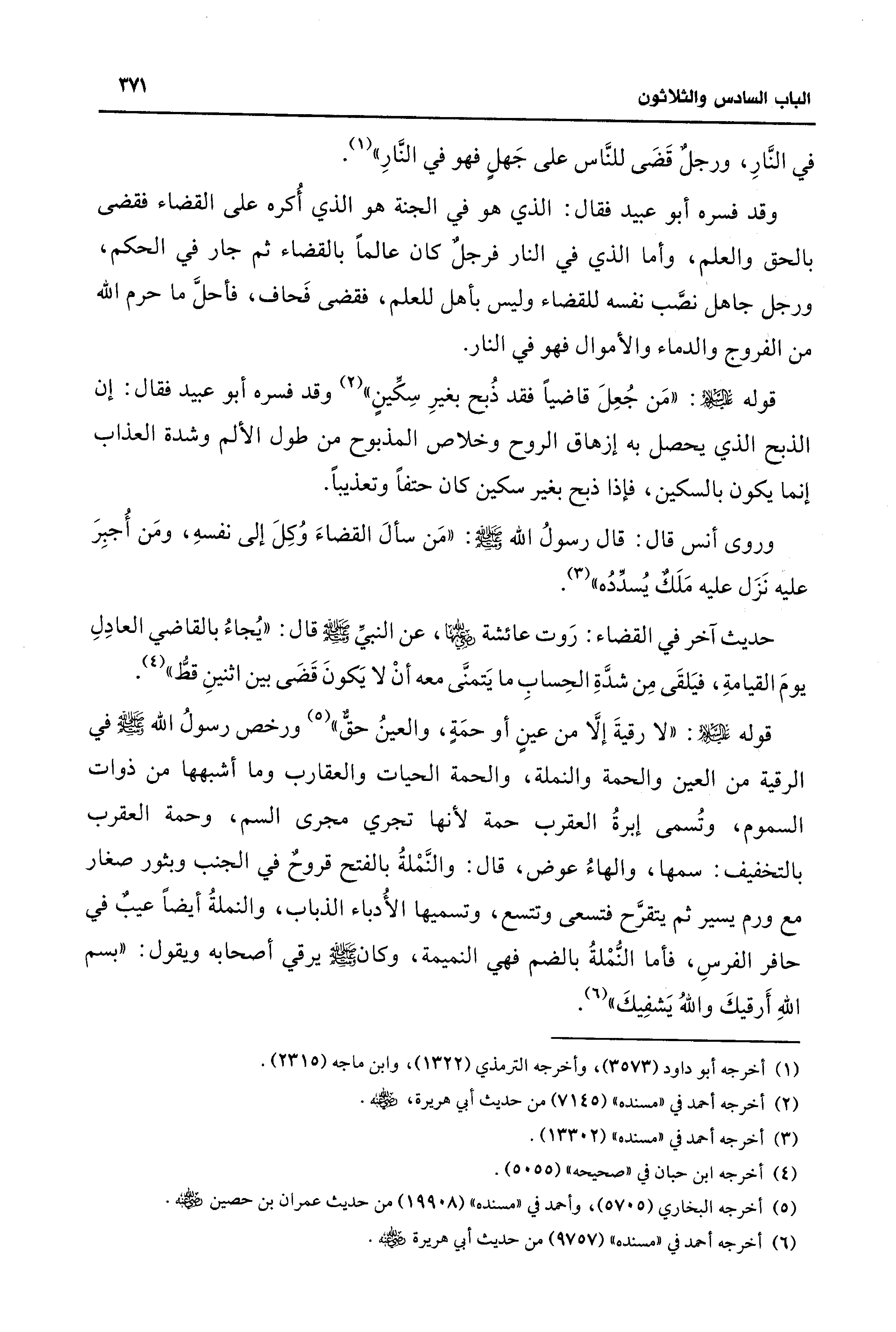 وقد فسره أبو عبيد فقال: الذي هو في الجنة هو الذي أُكره على القضاء فقضى بالحق والعلم، وأما الذي في النار فرجلٌ كان عالمًا بالقضاء ثم جار في الحكم، ورجل جاهل نصَّب نفسه للقضاء وليس بأهل للعلم، فقضى فَحاف، فأحلَّ ما حرم الله من الفروج والدماء والأموال فهو في النار.