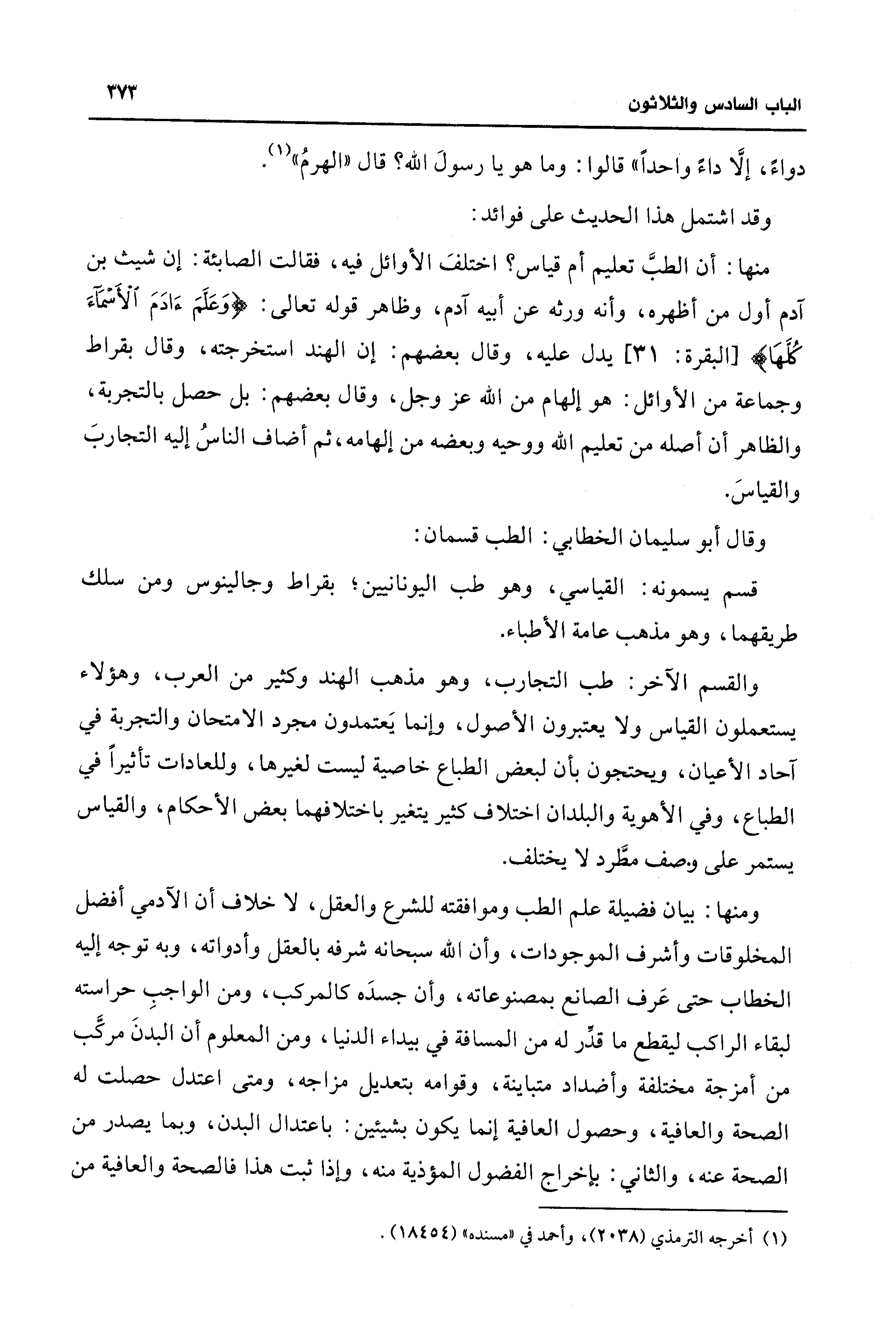 منها: أن الطبَّ تعليم أم قياس؟ اختلفَ الأوائل فيه، فقالت الصابئة: إن شيث بن آدم أول من أظهره، وأنه ورثه عن أبيه آدم، وظاهر قوله تعالى: {وَعَلَّمَ آدَمَ الْأَسْمَاءَ كُلَّهَا} [البقرة: 31] يدل عليه، وقال بعضهم: إن الهند استخرجته، وقال بقراط وجماعة من الأوائل: هو إلهام من الله عز وجل، وقال بعضهم: بل حصل بالتجربة، والظاهر أن أصله من تعليم الله ووحيه وبعضه من إلهامه، ثم أضاف الناسُ إليه التجاربَ والقياسَ.