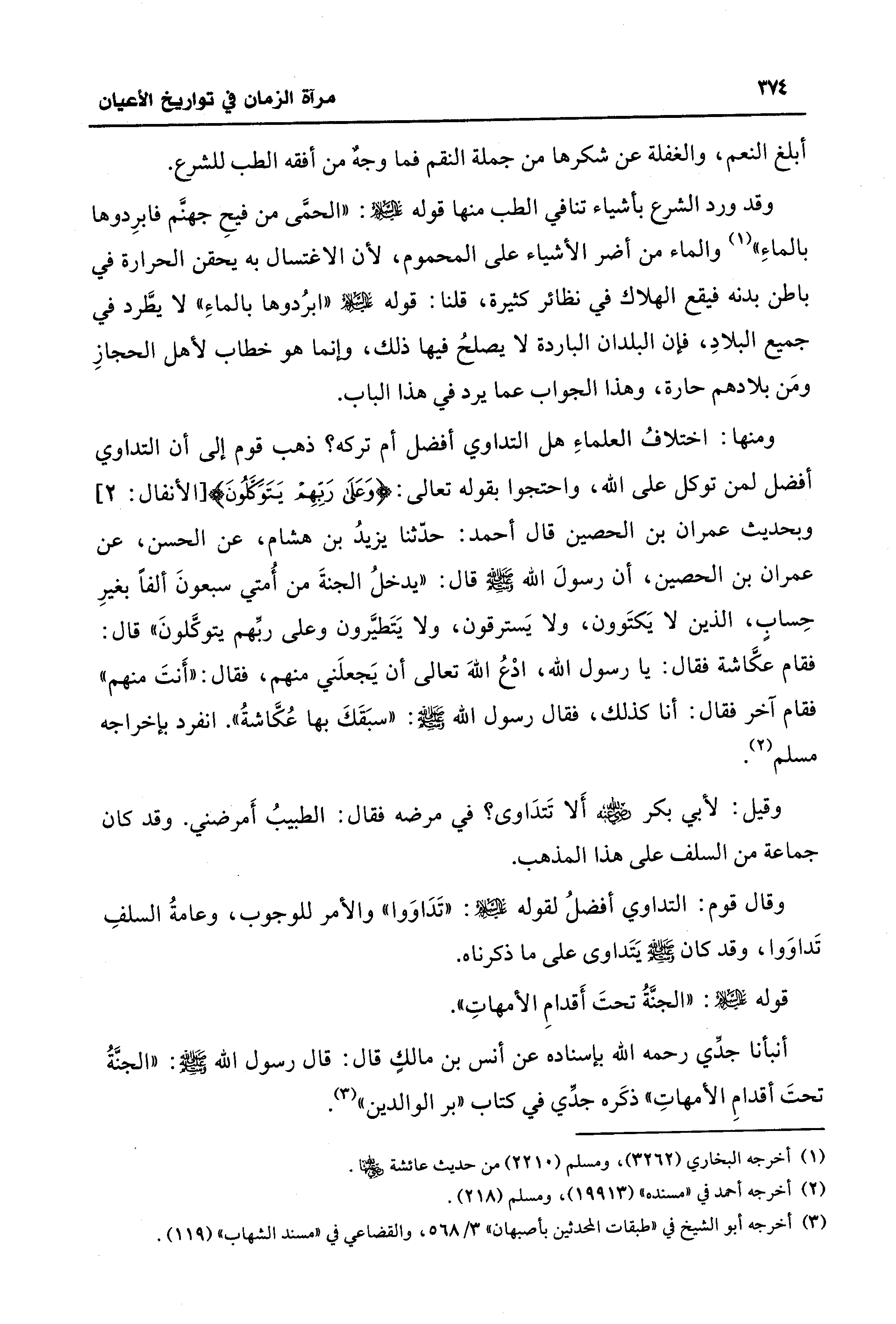ومنها: اختلافُ العلماءِ هل التداوي أفضل أم تركه؟ ذهب قوم إلى أن التداوي أفضل لمن توكل على الله، واحتجوا بقوله تعالى: {وَعَلَى رَبِّهِمْ يَتَوَكَّلُونَ} [الأنفال: 2] وبحديث عمران بن الحصين قال أحمد: حدّثنا يزيدُ بن هشام، عن الحسن، عن عمران بن الحصين، أن رسولَ الله - صلى الله عليه وسلم - قال: "يدخلُ الجنةَ من أُمتي سبعونَ ألفًا بغيرِ حِسابٍ، الذين لا يَكتَوون، ولا يَسترقون، ولا يَتَطيَّرون وعلى ربِّهم يتوكَّلونَ" قال: فقام عكَّاشة فقال: يا رسول الله، ادْعُ الله تعالى أن يَجعلَني منهم، فقال: "أَنتَ منهم" فقام آخر فقال: أنا كذلك، فقال رسول الله - صلى الله عليه وسلم -: "سبَقَكَ بها عُكَّاشةُ". انفرد بإخراجه مسلم (¬2).