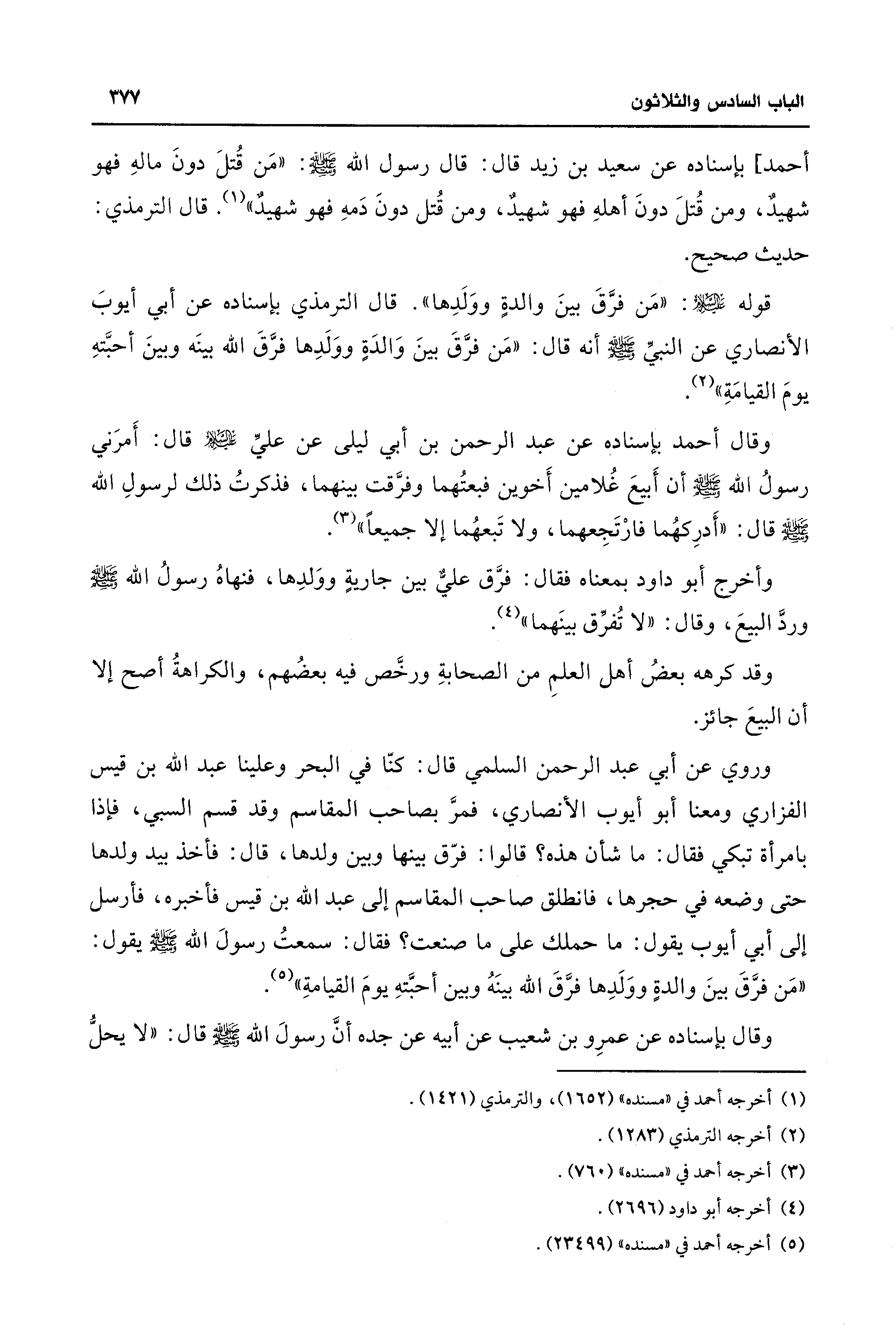 وقال أحمد بإسناده عن عبد الرحمن بن أبي ليلى عن عليَّ - عليه السلام - قال: أَمرَني رسولُ الله - صلى الله عليه وسلم - أن أَبيعَ غُلامين أَخوين فبعتُهما وفرَّقت بينهما، فذكرتُ ذلك لرسولِ الله - صلى الله عليه وسلم - قال: "أَدرِكهُما فارْتَجِعهما، ولا تَبعهُما إلا جميعًا" (¬3).