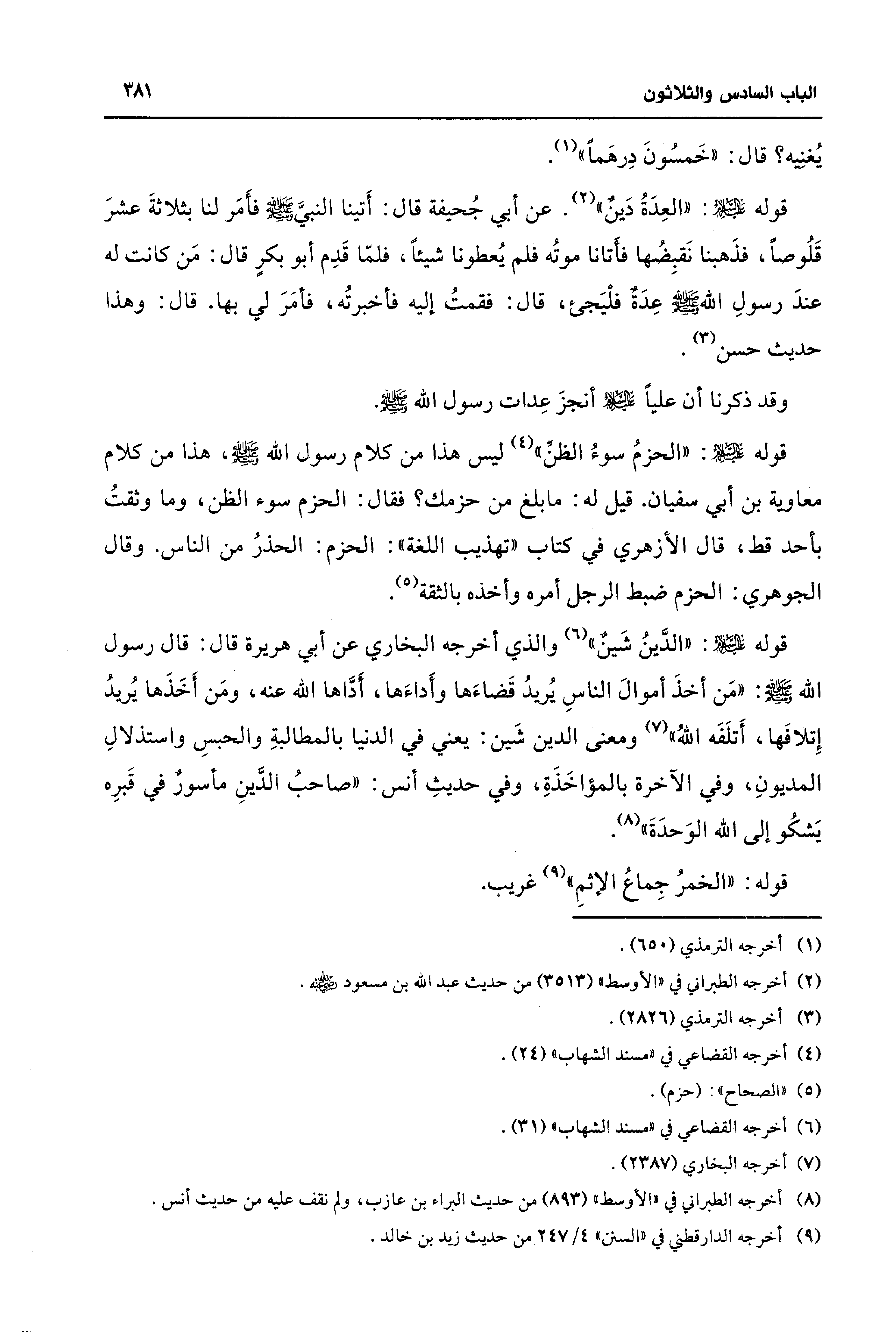 قوله - عليه السلام -: "العِدَةُ دَينٌ" (¬2). عن أبي جُحيفة قال: أَتينا النبيَّ - صلى الله عليه وسلم - فأَمَر لنا بثلاثةَ عشرَ قَلُوصًا، فذَهبنا نَقبِضُها فأَتانا موتُه فلم يُعطونا شيئًا، فلمّا قَدِم أبو بكرٍ قال: مَن كانت له عندَ رسولِ الله - صلى الله عليه وسلم - عِدةٌ فلْيَجئ، قال: فقمتُ إليه فأخبرتُه، فأمَرَ لي بها. قال: وهذا حديث حسن (¬3).