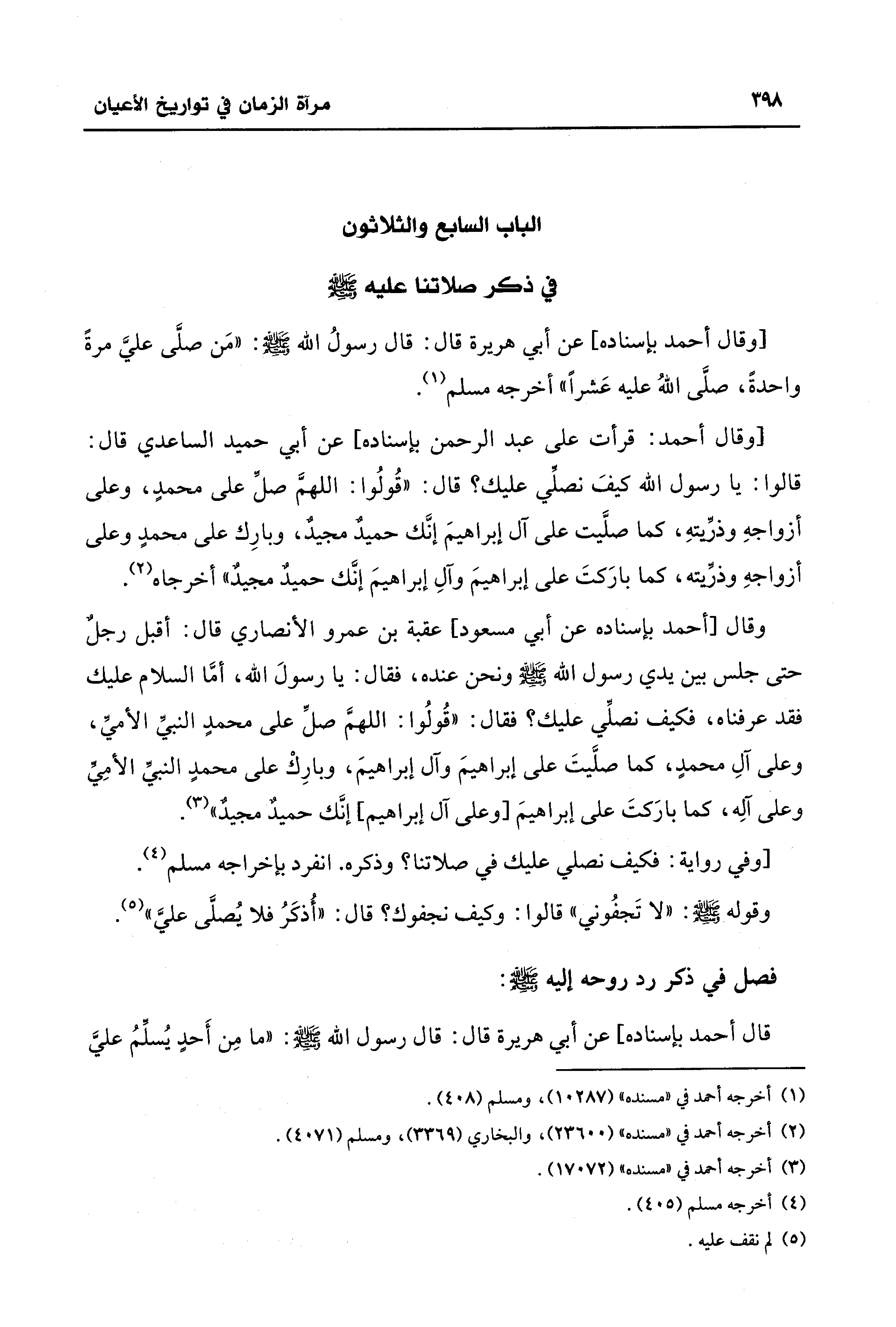 وقال [أحمد بإسناده عن أبي مسعود] عقبة بن عمرو الأنصاري قال: أقبل رجلٌ حتى جلس بين يدي رسول الله - صلى الله عليه وسلم - ونحن عنده، فقال: يا رسولَ الله، أمَّا السلام عليك فقد عرفناه، فكيف نصلِّي عليك؟ فقال: "قُولُوا: اللهمَّ صلِّ على محمدٍ النبيَّ الأميِّ، وعلى آلِ محمدٍ، كما صلَّيتَ على إبراهيمَ وآل إبراهيمَ، وبارِكْ على محمدٍ النبيَّ الأمِيِّ وعلى آلِه، كما بارَكتَ على إبراهيمَ [وعلى آل إبراهيم] إنَّك حميدٌ مجيدٌ" (¬3).