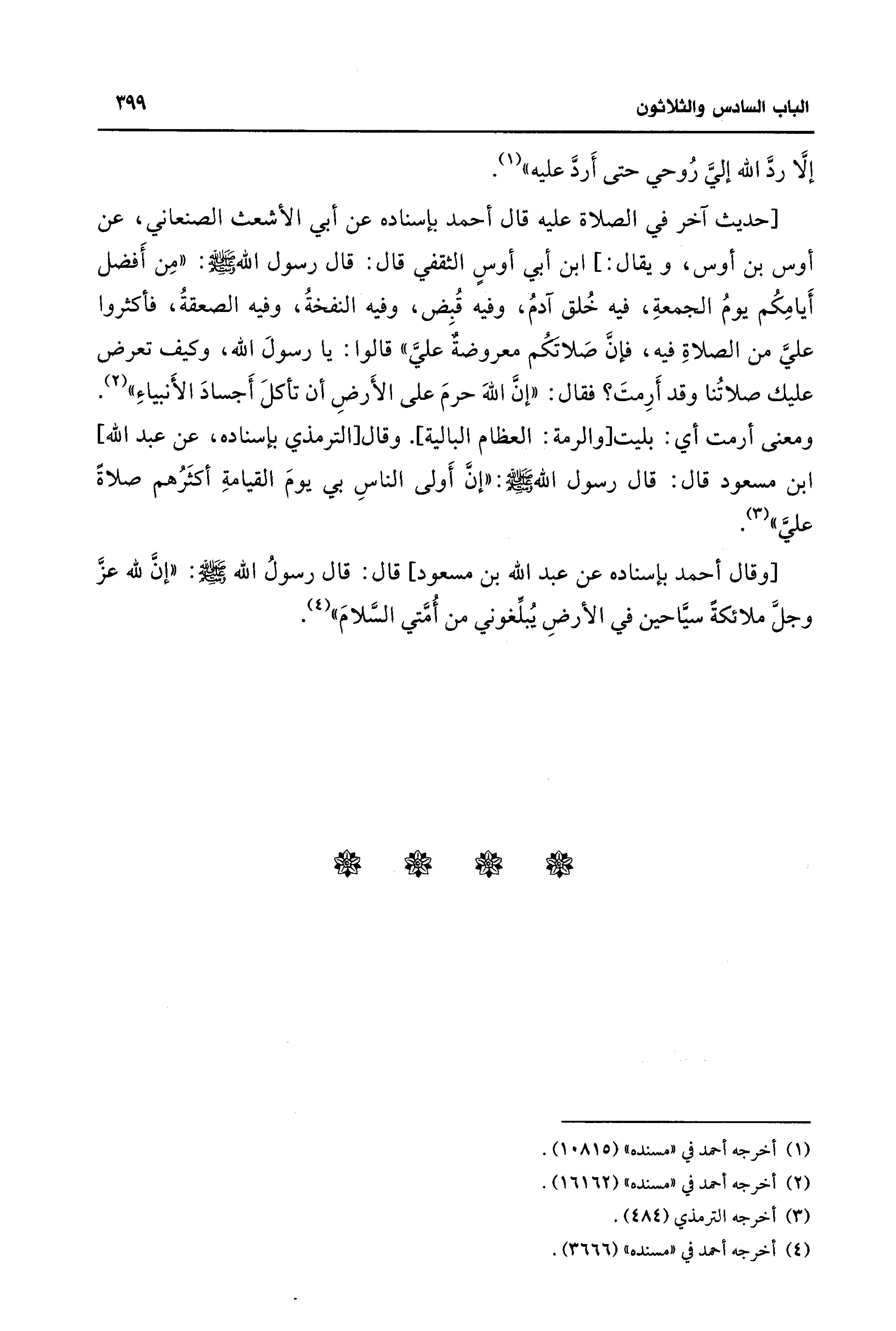 [وقال أحمد بإسناده عن عبد الله بن مسعود] قال: قال رسولُ الله - صلى الله عليه وسلم -: "إنَّ لله عزَّ وجلَّ ملائكةً سيَّاحين في الأرضِ يُبلِّغوني من أُمَّتي السَّلامَ" (¬4).