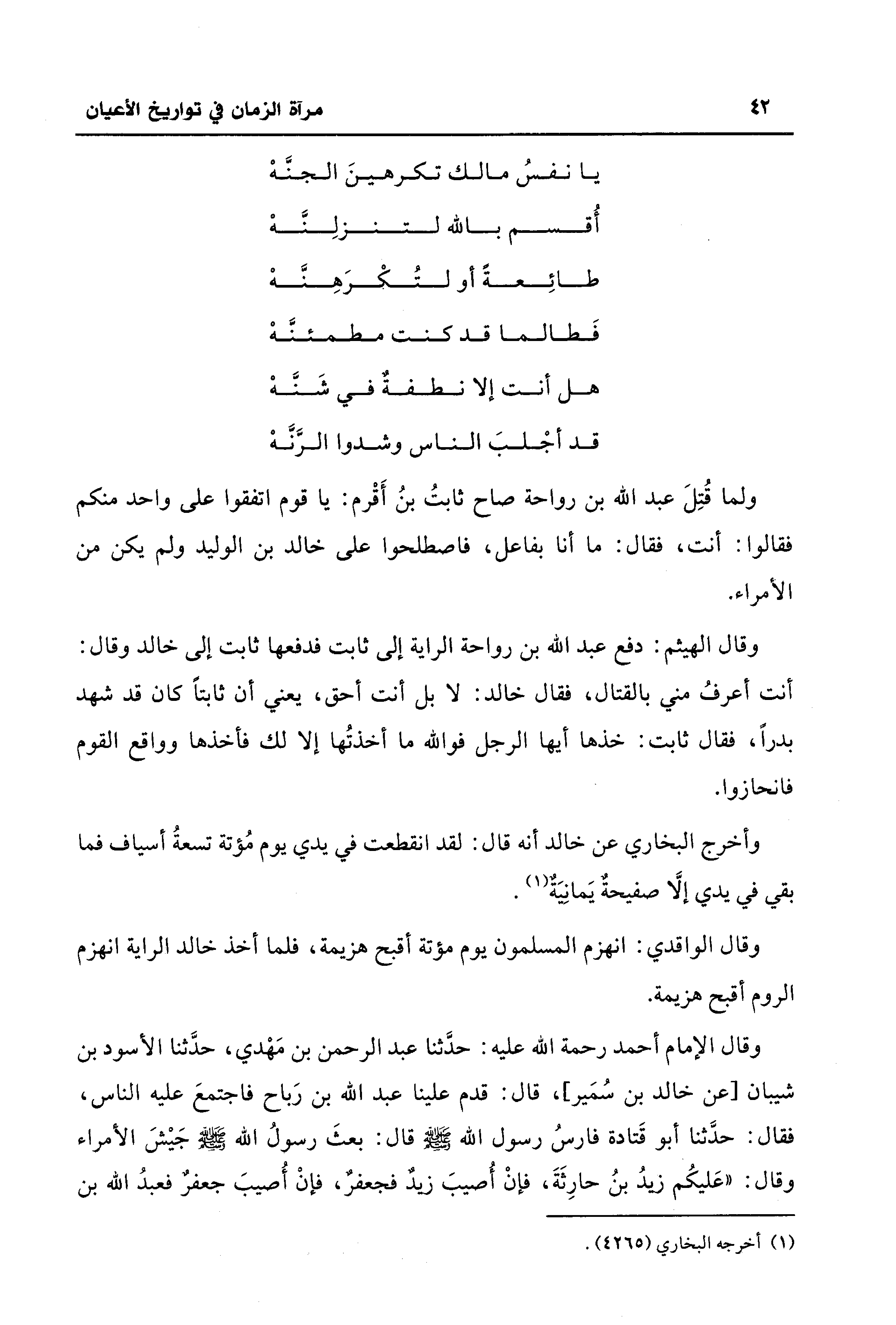 وأخرج البخاري عن خالد أنه قال: لقد انقطعت في يدي يوم مُؤتة تسعةُ أسياف فما بقي في يدي إلَّا صفيحةٌ يَمانِيَةٌ (¬1).