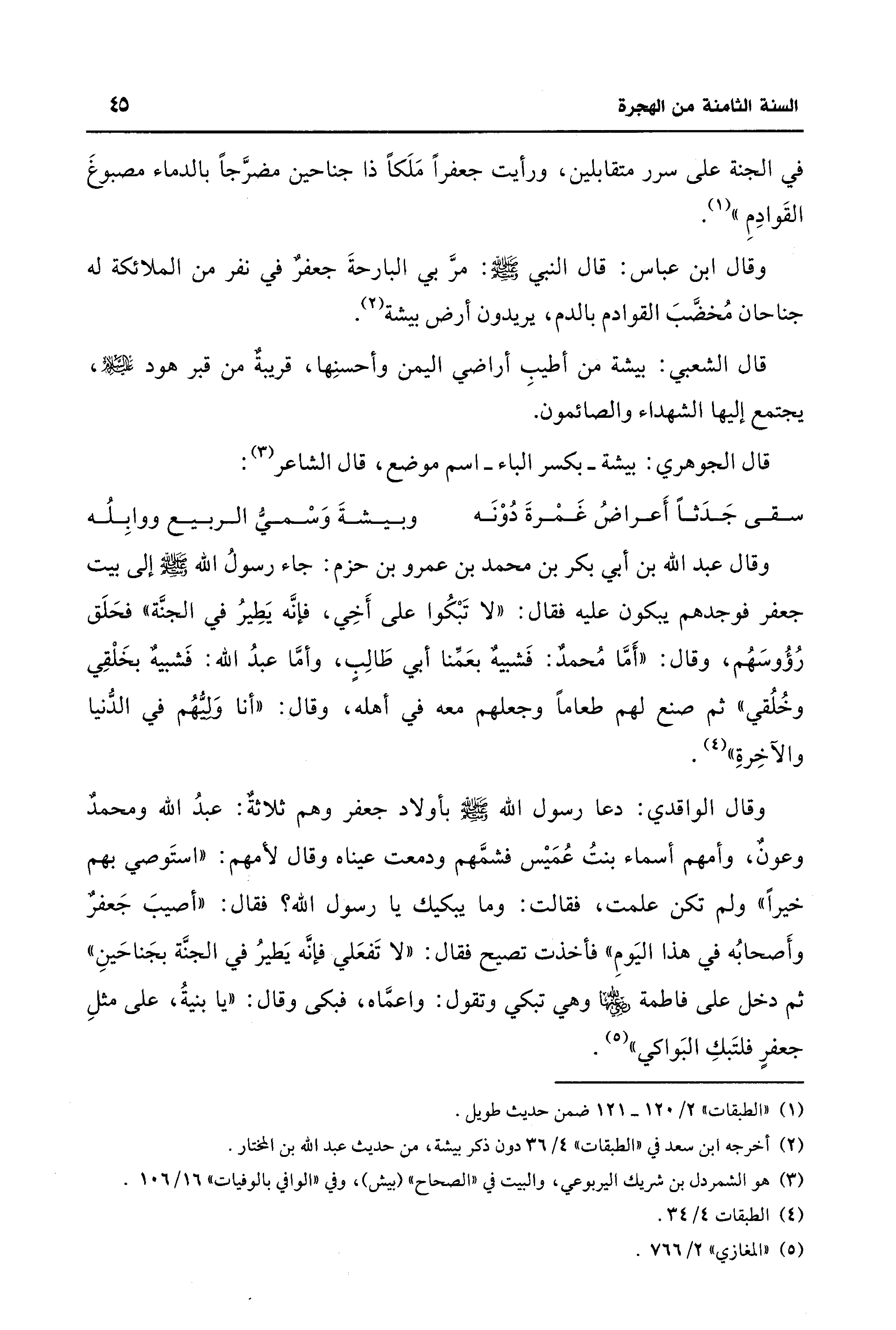 وقال ابن عباس: قال النبي - صلى الله عليه وسلم -: مرَّ بي البارحةَ جعفرٌ في نفر من الملائكة له جناحان مُخضَّبَ القوادم بالدم، يريدون أرض بيشة (¬2).