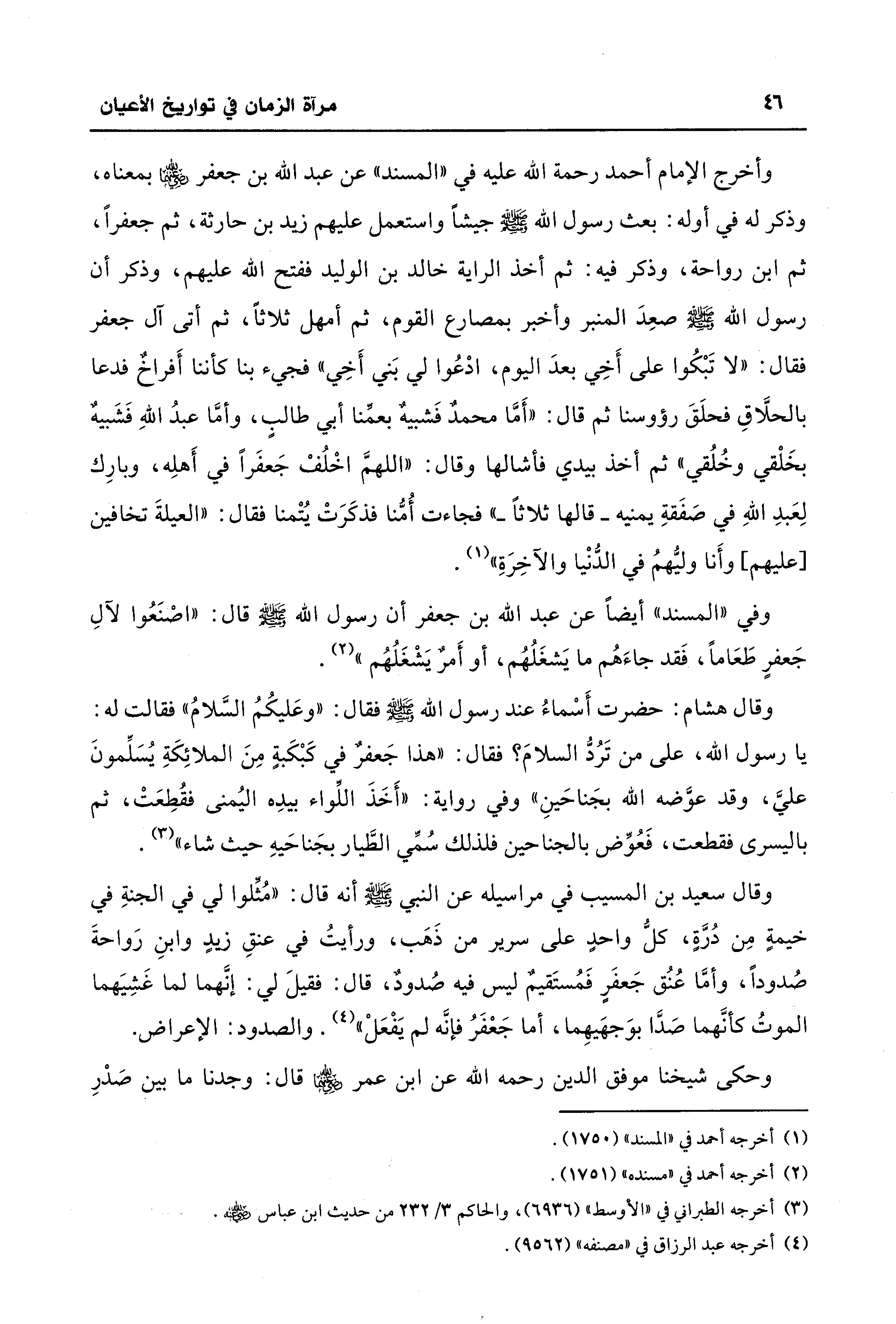 وأخرج الإمام أحمد رحمة الله عليه في "المسند" عن عبد الله بن جعفر - رضي الله عنهما - بمعناه، وذكر له في أوله: بعث رسول الله - صلى الله عليه وسلم - جيشًا واستعمل عليهم زيد بن حارثة، ثم جعفرًا، ثم ابن رواحة، وذكر فيه: ثم أخذ الراية خالد بن الوليد ففتح الله عليهم، وذكر أن رسول الله - صلى الله عليه وسلم - صعِدَ المنبر وأخبر بمصارع القوم، ثم أمهل ثلاثًا، ثم أتى آل جعفر فقال: "لا تَبْكُوا على أَخِي بعدَ اليوم، ادْعُوا لي بَني أَخِي" فجيء بنا كأننا أَفراخٌ فدعا بالحلَّاقِ فحلَقَ رؤوسنا ثم قال: "أَمَّا محمدٌ فَشبيهٌ بعمِّنا أبي طالبٍ، وأمَّا عبدُ اللهِ فَشَبيهٌ بخَلْقي وخُلُقي" ثم أخذ بيدي فأشالها وقال: "اللهمَّ اخْلُفْ جَعفَرًا في أَهلِه، وبارِك لِعَبدِ اللهِ في صَفَقةِ يمنيه - قالها ثلاثًا -" فجاءت أُمُّنا فذكَرَتْ يُتْمنا فقال: "العيلةَ تخافين [عليهم] وأَنا وليُّهمُ في الدُّنْيا والآخِرَةِ" (¬1).