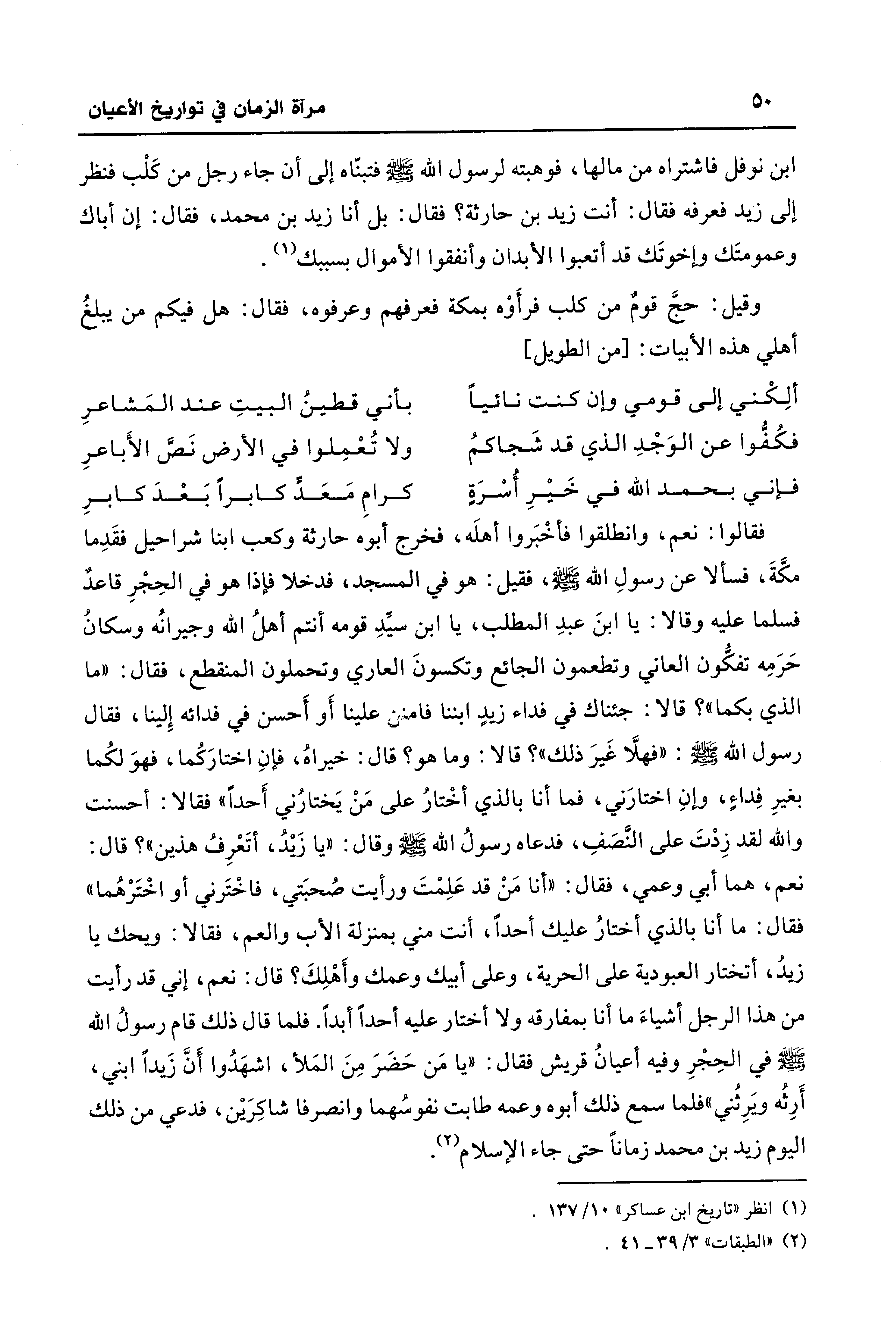 فقالوا: نعم، وانطلقوا فأخْبَروا أهلَه، فخرج أبوه حارثة وكعب ابنا شراحيل فقَدِما مكَّةَ، فسألا عن رسولِ الله - صلى الله عليه وسلم -، فقيل: هو في المسجد، فدخلا فإذا هو في الحِجْرِ قاعدٌ فسلما عليه وقالا: يا ابنَ عبدِ المطلب، يا ابن سيَّدِ قومه أنتم أهلُ الله وجيرانُه وسكانُ حَرَمِه تفكُّون العاني وتطعمون الجائع وتكسونَ العاري وتحملون المنقطع، فقال: "ما الذي بكما"؟ قالا: جئناك في فداء زيدٍ ابننا فامنن علينا أَو أَحسن في فدائه إِلينا، فقال رسول الله - صلى الله عليه وسلم -: "فهلَّا غَيرَ ذلك"؟ قالا: وما هو؟ قال: خيراهُ، فإنِ اختارَكُما، فهوَ لكُما بغيرِ فِداءٍ، وإنِ اختارَني، فما أنا بالذي أخْتارُ على مَنْ يَختارُني أَحدًا" فقالا: أحسنت والله لقد زِدْتَ على النِّصَفِ، فدعاه رسولُ الله - صلى الله عليه وسلم - وقال: "يا زَيْدُ، أتَعْرِفُ هذين"؟ قال: نعم، هذا أبي وعمي، فقال: "أنا مَنْ قد عَلِمْتَ ورأيت صُحبَتي، فاخْتَرني أو اخْتَرْهُما" فقال: ما أنا بالذي أختارُ عليك أحدًا، أنت مني بمنزلة الأب والعم، فقالا: ويحك يا زيدُ، أتختار العبودية على الحرية، وعلى أبيك وعمك وأَهْلِكَ؟ قال: نعم، إني قد رأيت من هذا الرجل أشياءَ ما أنا بمفارقه ولا أختار عليه أحدًا أبدًا. فلما قال ذلك قام رسولُ الله - صلى الله عليه وسلم - في الحِجْرِ وفيه أعيانُ قريش فقال: "يا مَن حَضَرَ مِنَ المَلأ، اشهَدُوا أَنَّ زَيدًا ابني، أَرِثُه ويَرِثُني" فلما سمع ذلك أبوه وعمه طابت نفوسُهما وانصرفا شاكِرَيْن، فدعي من ذلك اليوم زيد بن محمد زمانًا حتى جاء الإسلام (¬2).