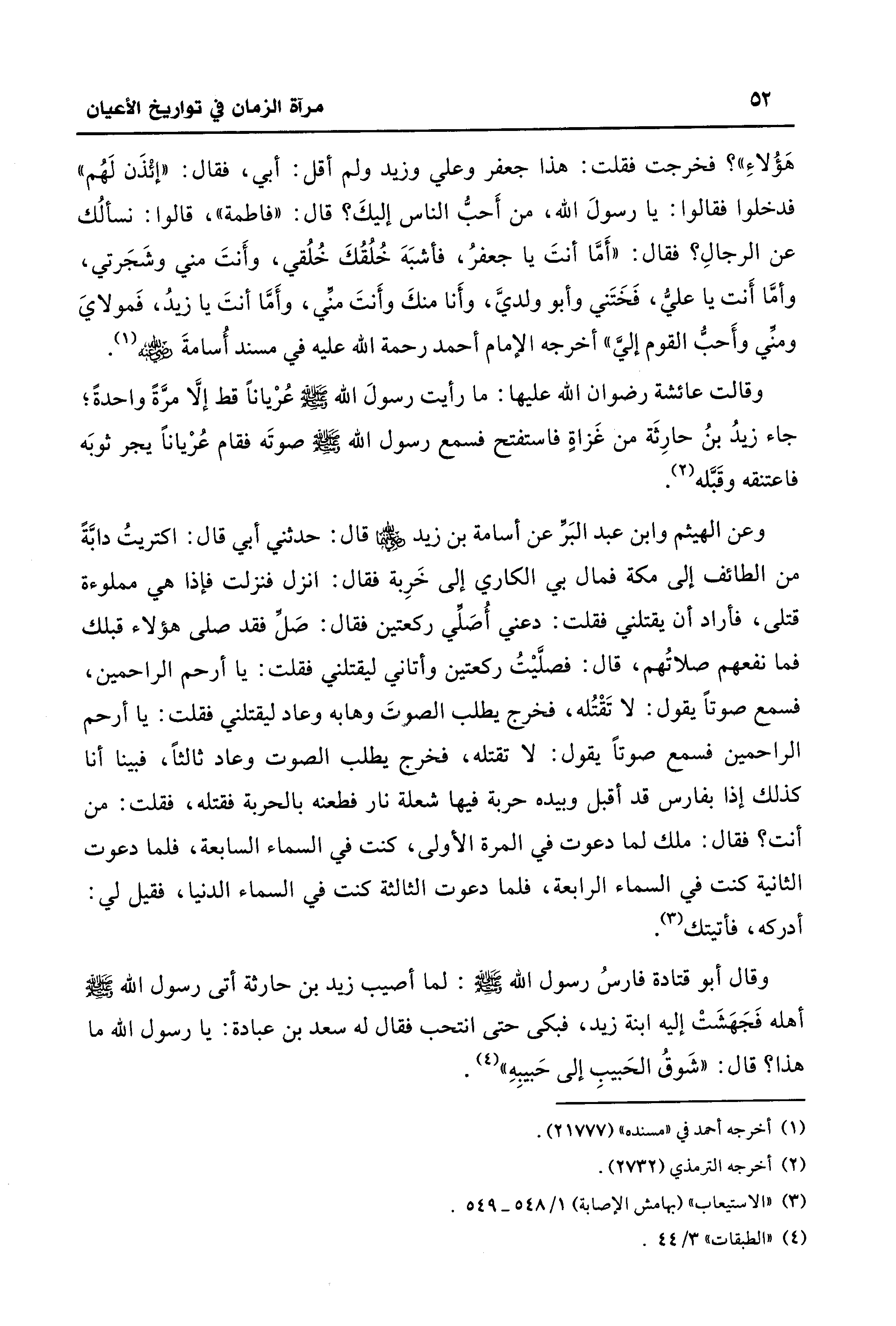 هَؤُلاءِ"؟ فخرجت فقلت: هذا جعفر وعلي يزيد ولم أقل: أبي، فقال: "إئْذَن لَهُم" فدخلوا فقالوا: يا رسولَ الله، من أَحبُّ النَّاس إليكَ؟ قال: "فاطمة"، قالوا: نسألُك عن الرجالِ؟ فقال: "أَمَّا أنتَ يا جعفرُ، فأشبَهَ خُلُقُكَ خُلُقي، وأَنتَ مني وشَجَرتي، وأمَّا أَنت يا عليُّ، فَخَتَني وأبو ولديَّ، وأَنا منكَ وأَنتَ منِّي، وأَمَّا أنتَ يا زيدُ، فَمولايَ ومنِّي وأَحبُّ القوم إليَّ" أخرجه الإمام أحمد رحمة الله عليه في مسند أُسامةَ - رضي الله عنه - (¬1).