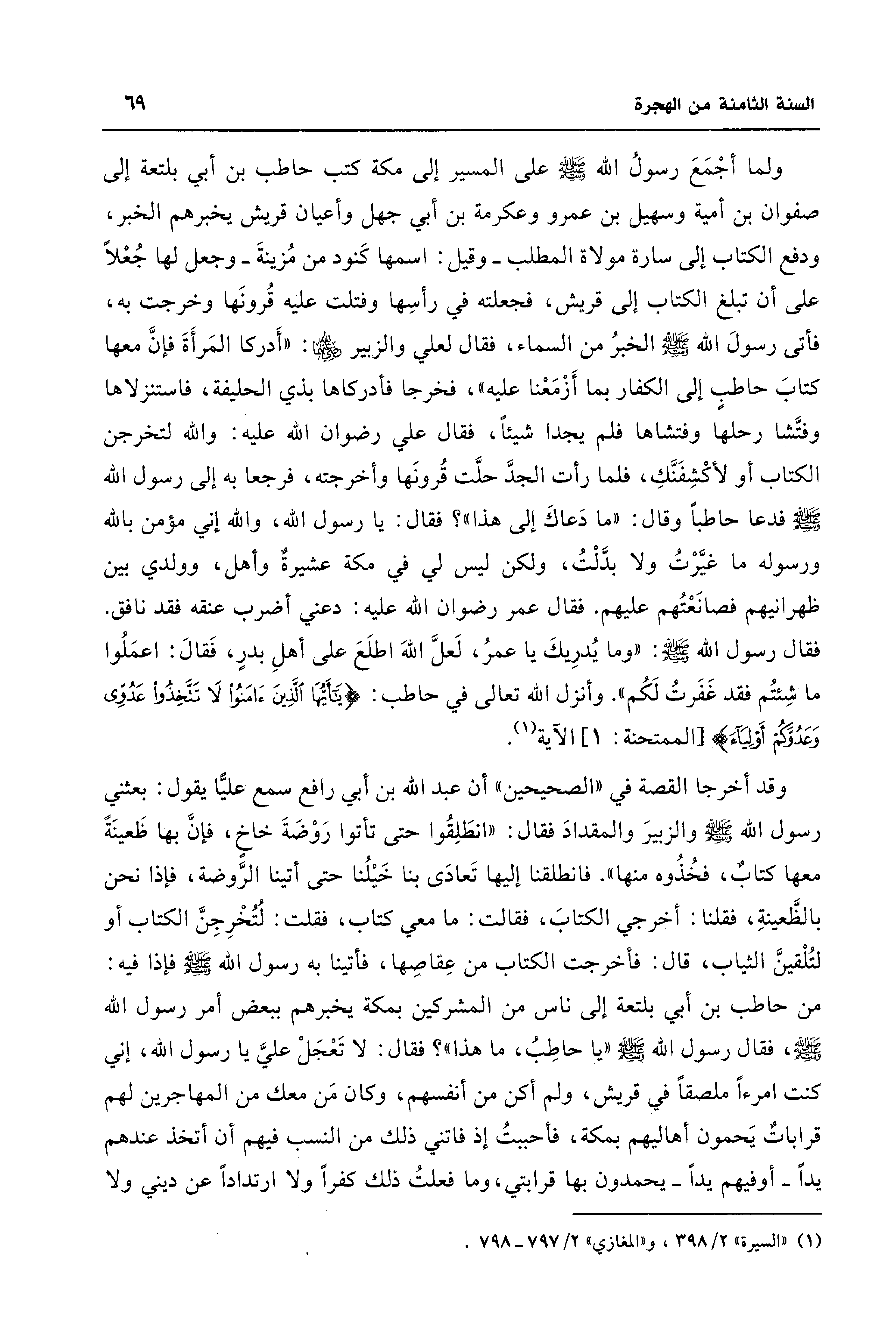 وقد أخرجا القصة في "الصحيحين" أن عبد الله بن أبي رافع سمع عليًّا يقول: بعثني رسول الله - صلى الله عليه وسلم - والزبيرَ والمقدادَ فقال: "انطَلِقُوا حتَّى تأتوا رَوْضَةَ خاخٍ، فإنَّ بها ظَعينَةً معها كتابٌ، فخُذُوه منها". فانطلقنا إليها تَعادَى بنا خَيْلُنا حتَّى أتينا الرَّوضة، فإذا نحن بالظَّعينةِ، فقلنا: أخرجي الكتابَ، فقالت: ما معي كتاب، فقلت: لُتُخْرِجِنَّ الكتاب أو لتُلْقينَّ الثياب، قال: فأخرجت الكتاب من عِقاصِها، فأتينا به رسول الله - صلى الله عليه وسلم - فإذا فيه: من حاطب بن أبي بلتعة إلى ناس من المشركين بمكة يخبرهم ببعض أمر رسول الله - صلى الله عليه وسلم -، فقال رسول الله - صلى الله عليه وسلم - "يا حاطِبُ، ما هذا"؟ فقال: لا تَعْجَلْ عليَّ يا رسول الله، إنِّي كنت امرءًا ملصقًا في قريش، ولم أكن من أنفسهم، وكان مَن معك من المهاجرين لهم قراباتٌ يَحمون أهاليهم بمكة، فأحببتُ إذ فاتني ذلك من النسب فيهم أن أتخذ عندهم يدًا - أو فيهم يدًا - يحمدون بها قرابتي، وما فعلتُ ذلك كفرًا ولا ارتدادًا عن ديني ولا