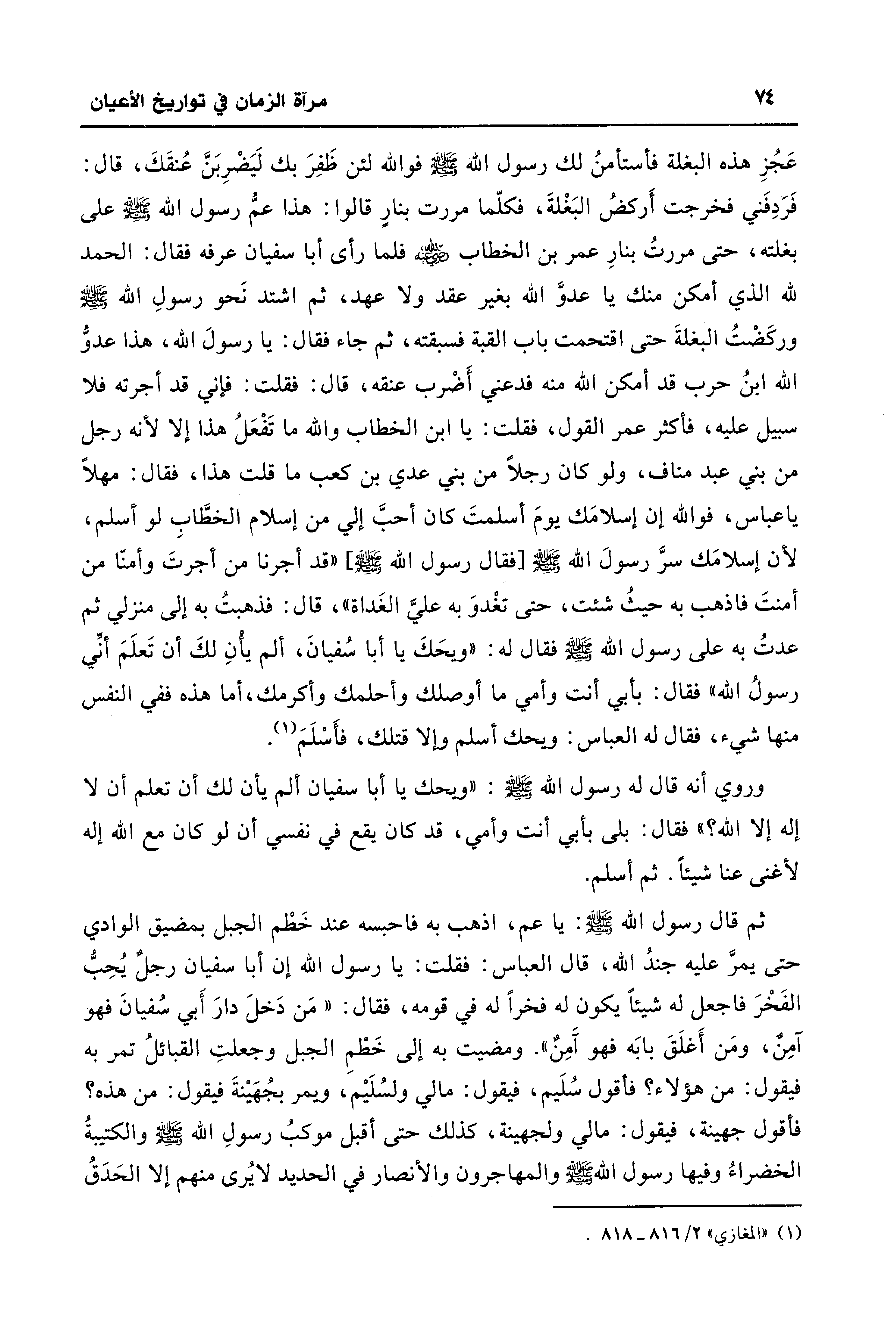 عَجُزِ هذه البغلة فأستأمنُ لك رسول الله - صلى الله عليه وسلم - فوالله لئن ظَفِرَ بك لَيَضْرِبَنَّ عُنقَكَ، قال: فَرَدِفَني فخرجت أَركضُ البَغْلةَ، فكلّما مررت بنارٍ قالوا: هذا عمُّ رسول الله - صلى الله عليه وسلم - على بغلته، حتَّى مررتُ بنارِ عمر بن الخطاب - رضي الله عنه - فلما رأى أبا سفيان عرفه فقال: الحمد لله الذي أمكن منك يا عدوَّ الله بغير عقد ولا عهد، ثم اشتد نَحو رسولِ الله - صلى الله عليه وسلم - وركَضْتُ البغلةَ حتى اقتحمت باب القبة فسبقته، ثم جاء فقال: يا رسولَ الله، هذا عدوُّ الله ابنُ حرب قد أمكن الله منه فدعني أَضْرب عنقه، قال: فقلت: فإني قد أجرته فلا سبيل عليه، فأكثر عمر القول، فقلت: يا ابن الخطاب والله ما تَفْعَلُ هذا إلا لأنه رجل من بني عبد مناف، ولو كان رجلًا من بني عدي بن كعب ما قلت هذا، فقال: مهلاً يا عباس، فوالله إن إسلامَك يومَ أسلمتَ كان أحبَّ إلي من إسلام الخطَّابِ لو أسلم، لأنَّ إسلامَك سرَّ رسولَ الله - صلى الله عليه وسلم -[فقال رسول الله - صلى الله عليه وسلم -] "قد أجرنا من أجرتَ وأمنّا من أمنتَ فاذهب به حيثُ شئت، حتَّى تغْدوَ به عليَّ الغَداة"، قال: فذهبتُ به إلى منزلي ثم عدتُ به على رسول الله - صلى الله عليه وسلم - فقال له: "ويحَكَ يا أبا سُفيانَ، ألم يأْنِ لكَ أن تَعلَمَ أنِّي رسولُ الله" فقال: بأبي أنت وأمي ما أوصلك وأحلمك وأكرمك، أما هذه ففي النَّفس منها شيء، فقال له العباس: ويحك أسلم وإلا قتلك، فأَسْلَمَ (¬1).