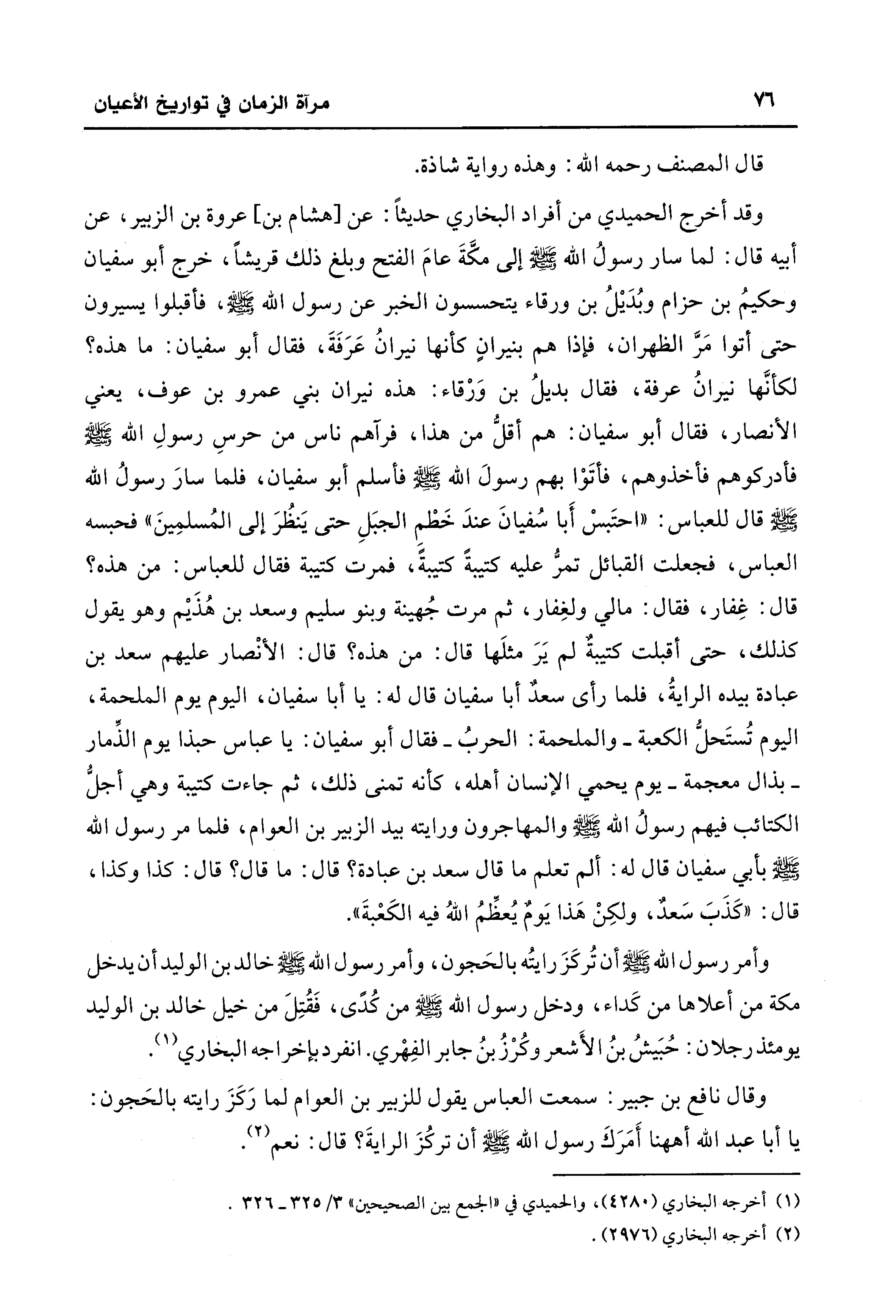 وقد أخرج الحميدي من أفراد البخاري حديثًا: عن [هشام بن] عروة بن الزبير، عن أبيه قال: لما سار رسولُ الله - صلى الله عليه وسلم - إلى مكَّةَ عامَ الفتح وبلغ ذلك قريشًا، خرج أبو سفيان وحكيمُ بن حزام وبُدَيْلُ بن ورقاء يتحسسون الخبر عن رسول الله - صلى الله عليه وسلم -، فأقبلوا يسيرون حتى أتوا مَرَّ الظهران، فإذا هم بنيرانٍ كأنها نيرانُ عَرَفَةَ، فقال أبو سفيان: ما هذه؟ لكأنَّها نيرانُ عرفة، فقال بديلُ بن وَرْقاء: هذه نيران بني عمرو بن عوف، يعني الأنصار، فقال أبو سفيان: هم أقلُّ من هذا، فرآهم ناس من حرسِ رسولِ الله - صلى الله عليه وسلم - فأدركوهم فأخذوهم، فأتَوْا بهم رسولَ الله - صلى الله عليه وسلم - فأسلم أبو سفيان، فلما سارَ رسولُ الله - صلى الله عليه وسلم - قال للعباس: "احتَبسْ أَبا سُفيانَ عندَ خَطْمِ الجبَلِ حتَّى يَنظُرَ إلى المُسلمِينَ" فحبسه العباس، فجعلت القبائل تمرُّ عليه كتيبةً كتيبةً، فمرت كتيبة فقال للعباس: من هذه؟ قال: غِفار، فقال: مالي ولغِفار، ثم مرت جُهينة وبنو سليم وسعد بن هُذَيْم وهو يقول كذلك، حتَّى أقبلت كتيبةٌ لم يَرَ مثلَها قال: من هذه؟ قال: الأنْصار عليهم سعد بن عبادة بيده الرايةُ، فلما رأى سعدٌ أبا سفيان قال له: يا أبا سفيان، اليوم يوم الملحمة، اليوم تُستَحلُّ الكعبة - والملحمة: الحربُ - فقال أبو سفيان: يا عباس حبذا يوم الذِّمار - بذال معجمة - يوم يحمي الإنسان أهله، كأنه تمنى ذلك، ثم جاءت كتيبة وهي أجلُّ الكتائب فيهم رسولُ الله - صلى الله عليه وسلم - والمهاجرون ورايته بيد الزبير بن العوام، فلما مر رسول الله - صلى الله عليه وسلم - بأبي سفيان قال له: ألم تعلم ما قال سعد بن عبادة؟ قال: ما قال؟ قال: كذا وكذا، قال: "كَذَبَ سَعدٌ، ولكِنْ هَذا يَومٌ يُعظِّمُ اللهُ فيه الكَعْبةَ".