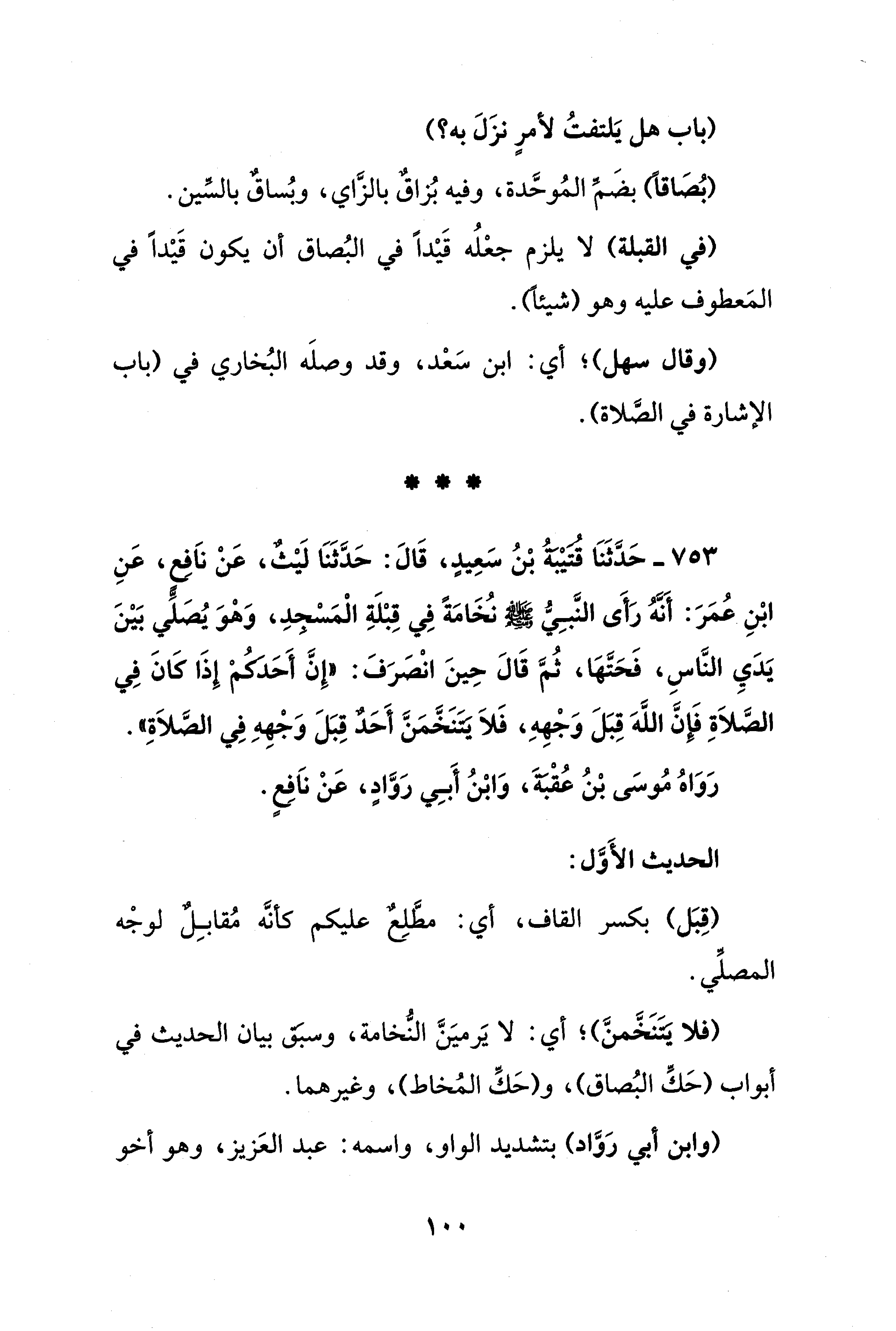 753 - حَدَّثَنَا قتيْبَةُ بْنُ سَعِيدٍ، قَالَ: حَدَّثَنَا لَيْثٌ، عَنْ ناَفِعٍ، عَنِ ابْنِ عُمَرَ: أَنَّهُ رَأَى النَّبِيُّ - صلى الله عليه وسلم - نُخَامَةً فِي قِبْلَةِ الْمَسْجدِ، وَهْوَ يُصَلِّي بَيْنَ يَدَيِ النَّاسِ، فَحَتَّهَا، ثُمَّ قَالَ حِينَ انْصَرَفَ: "إنَّ أَحَدَكُمْ إِذَا كَانَ فِي الصَّلاَةِ فَإِنَّ اللَّهَ قِبَلَ وَجْهِهِ، فَلاَ يَتَنَخَّمَنَّ أَحَدٌ قِبَلَ وَجْهِهِ فِي الصَّلاَةِ".
