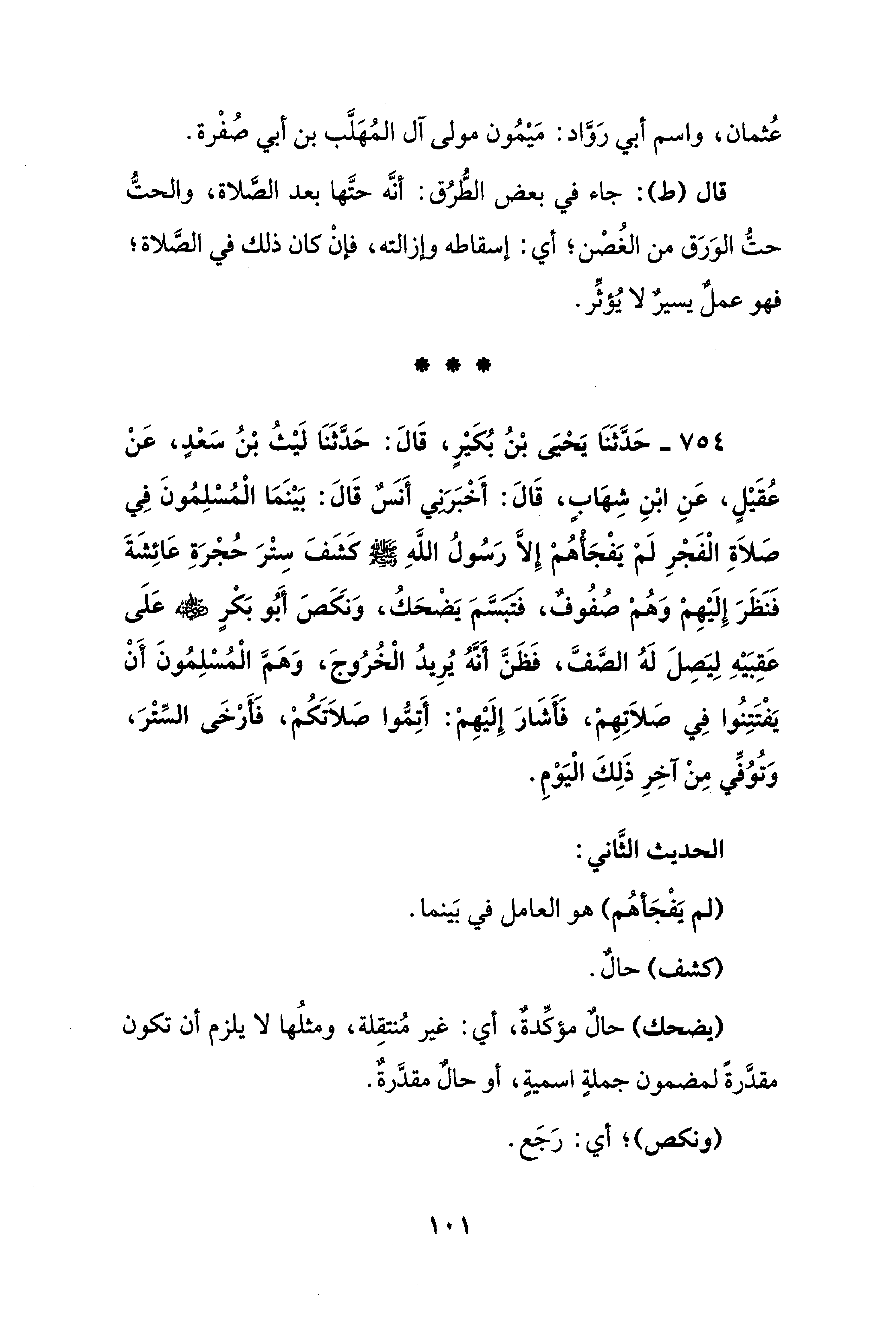 754 - حَدَّثَنَا يَحْيَى بْنُ بُكَيْرٍ، قَالَ: حَدَّثَنَا لَيْثُ بْنُ سَعْدٍ، عَنْ عُقَيْلٍ، عَنِ ابْنِ شهَابٍ، قَالَ: أَخْبَرَنِي أَنسٌ قَالَ: بَيْنَمَا الْمُسْلِمُونَ فِي صَلاَةِ الْفَجْرِ لَمْ يَفْجَأْهُمْ إِلَّا رَسُولُ اللَّهِ - صلى الله عليه وسلم - كَشَفَ سِتْرَ حُجْرَةِ عَائِشَةَ فَنَظَرَ إِلَيْهِمْ وَهُمْ صُفُوفٌ، فَتَبَسَّمَ يَضْحَكُ، وَنَكَصَ أَبُو بَكْرٍ - رضي الله عنه - عَلَى عَقِبَيْهِ لِيَصِلَ لَهُ الصَّفَّ، فَظَنَّ أَنَّهُ يُرِيدُ الْخُرُوجَ، وَهَمَّ الْمُسْلِمُونَ أَنْ يَفْتَتِنُوا فِي صَلاَتِهِمْ، فَأَشَارَ إِلَيْهِمْ: أَتِمُّوا صَلاَتَكُمْ، فَأَرْخَى السِّتْرَ، وَتُوُفِّي مِنْ آخِرِ ذَلِكَ الْيَوْمِ.