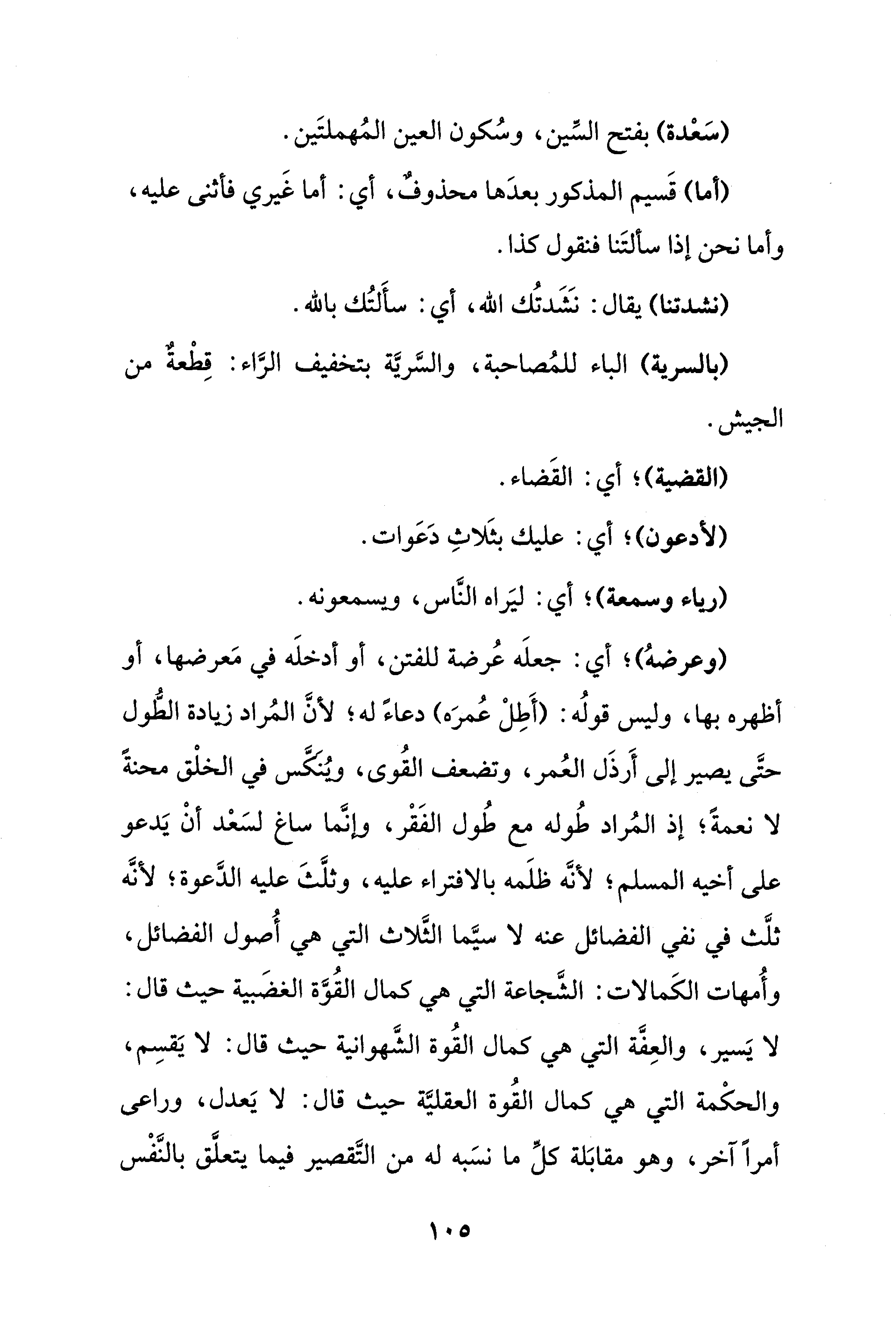 (وعرضهُ)؛ أي: جعلَه عُرضة للفتن، أو أدخلَه في مَعرضها، أو أظهره بها، وليس قولُه: (أَطِلْ عُمرَه) دعاءً له؛ لأنَّ المُراد زيادة الطُّول حتَّى يصير إلى أَرذَل العُمر، وتضعف القُوى، ويُنَكَّس في الخلْق محنةً لا نعمةً؛ إذ المُراد طُوله مع طُول الفَقْر، وإنَّما ساغ لسَعْد أنْ يَدعو على أخيه المسلم؛ لأنَّه ظلَمه بالافتراء عليه، وثلَّثَ عليه الدَّعوة؛ لأنَّه ثلَّث في نفي الفضائل عنه لا سيَّما الثَّلاث التي هي أُصول الفضائل، وأُمهات الكَمالات: الشَّجاعة التي هي كمال القُوَّة الغضَبية حيث قال: لا يَسير، والعِفَّة التي هي كمال القُوة الشَّهوانية حيث قال: لا يَقسِم، والحكْمة التي هي كمال القُوة العقليَّة حيث قال: لا يَعدل، وراعى أمرًا آخر، وهو مقابَلة كلِّ ما نسَبه له من التَّقصير فيما يتعلَّق بالنَّفْس