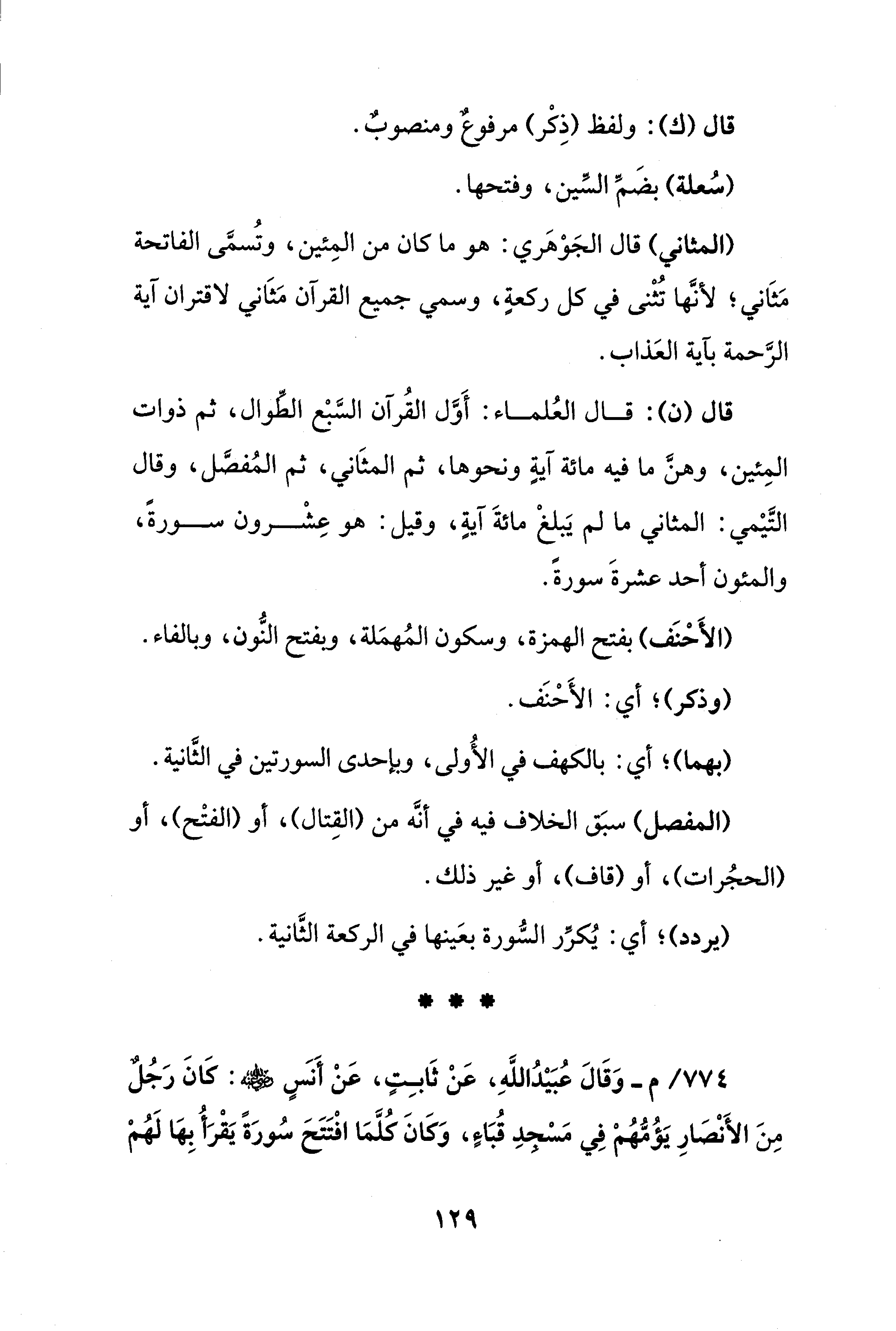 (المثاني) قال الجَوْهَري: هو ما كان من المِئين، وتُسمَّى الفاتحة مَثَاني؛ لأنَّها تُثْنى في كل ركعةٍ، وسمي جميع القرآن مَثَاني لاقتران آية الرَّحمة بآية العَذاب.