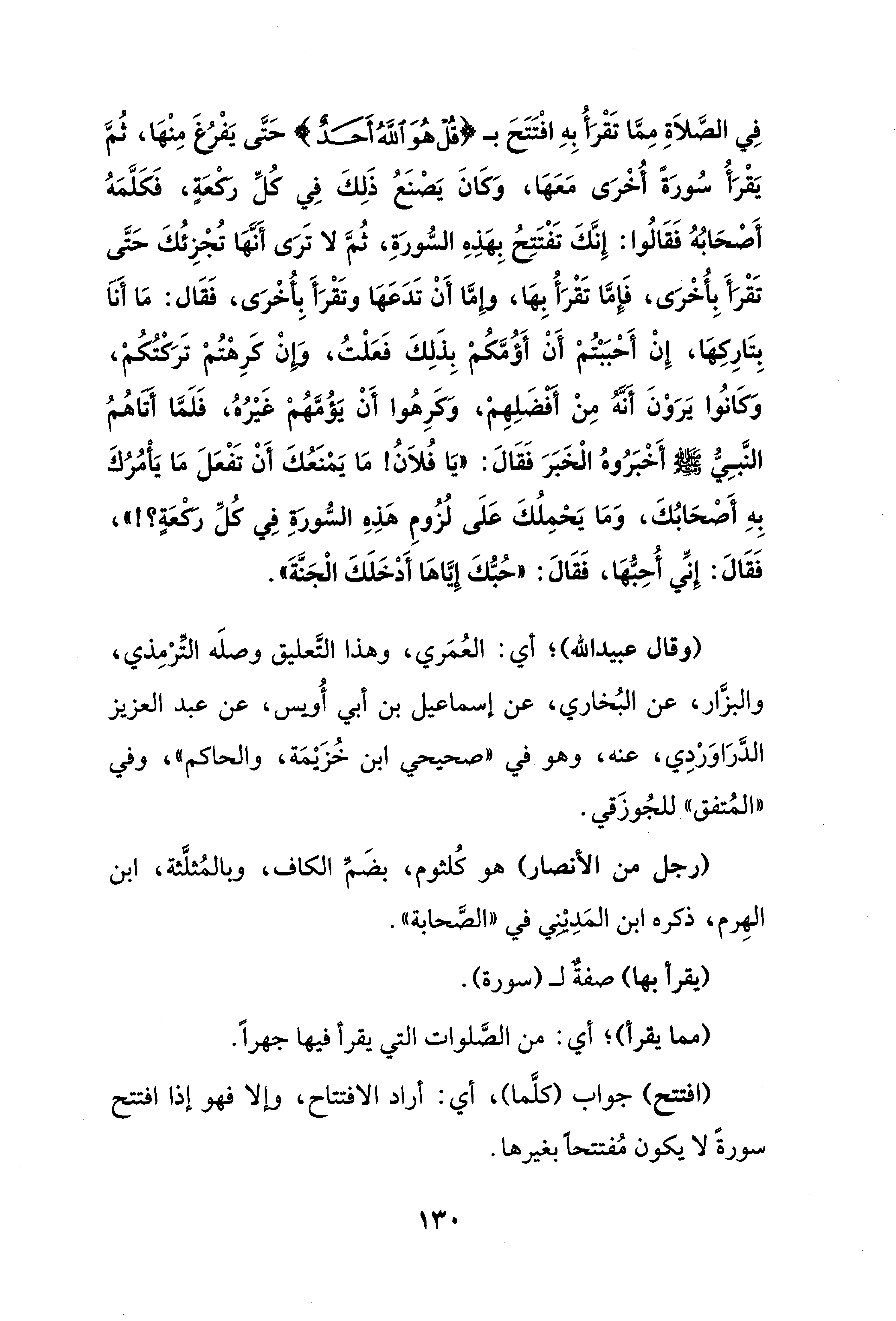 فِي الصَّلاَةِ مِمَّا تَقْرَأُ بِهِ افْتَتَحَ بـ {قُلْ هُوَ اللَّهُ أَحَدٌ} حَتَّى يَفْرُغَ مِنْهَا، ثُمَّ يَقْرَأُ سُورَةً أُخْرَى مَعَهَا، وَكَانَ يَصْنَعُ ذَلِكَ فِي كُلِّ رَكعَةٍ، فَكَلَّمَهُ أَصْحَابُهُ فَقَالُوا: إِنَّكَ تَفْتَتِحُ بِهَذِهِ السُّورَةِ، ثُمَّ لا تَرَى أنَّهَا تُجْزِئُكَ حَتَّى تَقْرَأَ بِأُخْرَى، فَإِمَّا تَقْرَأُ بِهَا، وإِمَّا أَنْ تَدَعَهَا وتَقْرَأَ بِأُخْرَى، فَقَال: مَا أَناَ بِتَارِكِهَا، إِنْ أَحْبَبْتُمْ أَنْ أَؤُمَّكُمْ بِذَلِكَ فَعَلْتُ، وَإِنْ كَرِهْتُمْ تَرَكْتُكُمْ، وَكَانُوا يَرَوْنَ أنَّهُ مِنْ أَفْضَلِهِمْ، وَكَرِهُوا أَنْ يَؤُمَّهُمْ غَيْرُهُ، فَلَمَّا أَتَاهُمُ النَّبِيُّ - صلى الله عليه وسلم - أَخْبَرُوهُ الْخَبَرَ فَقَالَ: "يَا فُلاَنُ! مَا يَمْنَعُكَ أَنْ تَفْعَلَ مَا يَأْمُرُكَ بِهِ أَصْحَابُكَ، وَمَا يَحْمِلُكَ عَلَى لُزُومِ هَذِهِ السُّورَةِ فِي كُلِّ رَكعَةٍ؟! "، فَقَالَ: إِنِّي أُحِبُّهَا، فَقَالَ: "حُبُّكَ إِيَّاهَا أَدْخَلَكَ الْجَنَّةَ".