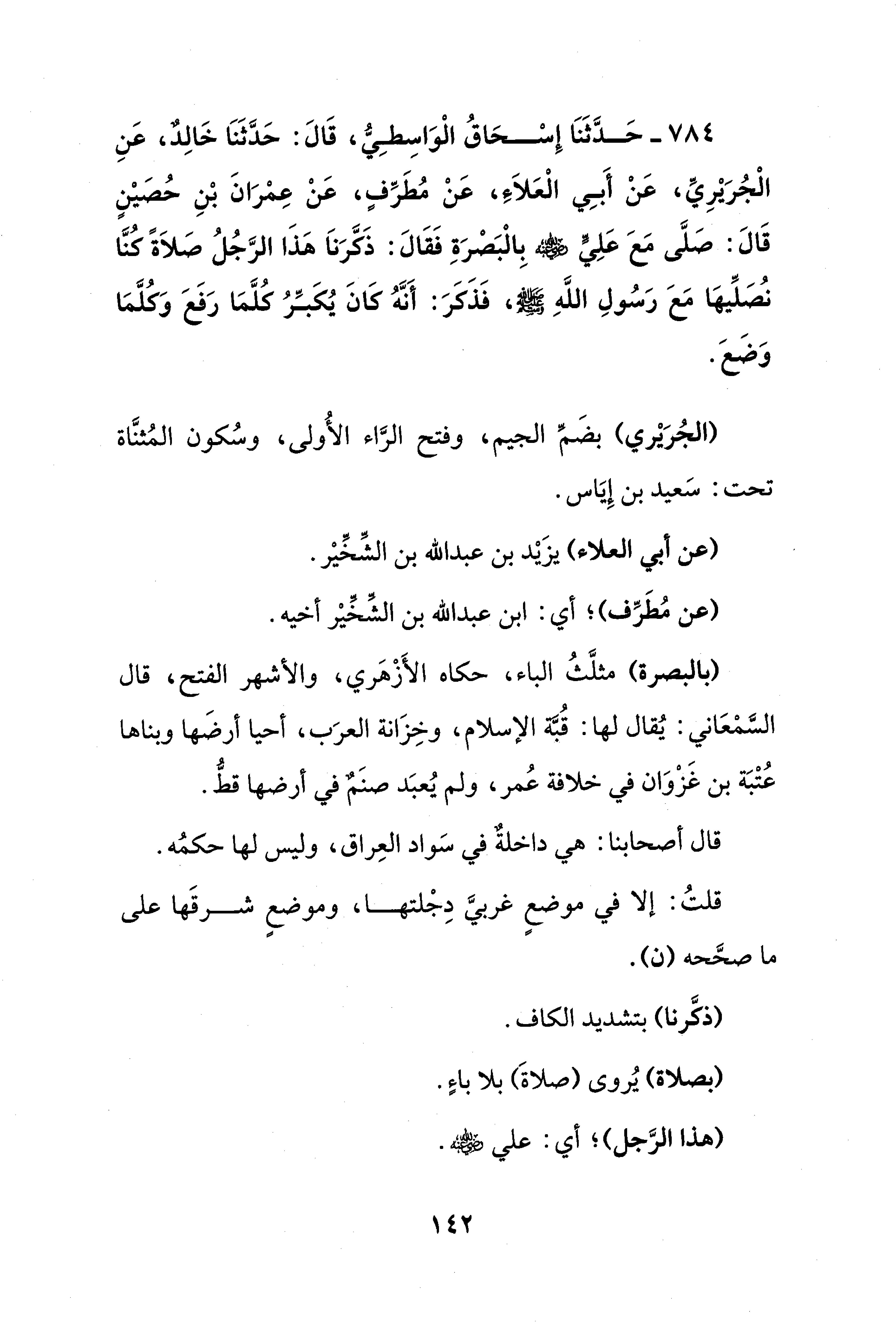 784 - حَدَّثَنَا إِسْحَاقُ الْوَاسِطِيُّ، قَالَ: حَدَّثَنَا خَالِدٌ، عَنِ الْجُرَيْرِيِّ، عَنْ أَبِي الْعَلاَءَ، عَنْ مُطَرِّفٍ، عَنْ عِمْرَانَ بْنِ حُصَيْنٍ قَالَ: صَلَّى مَعَ عَلِيٍّ - رضي الله عنه - بِالْبَصْرَةِ فَقَالَ: ذَكَّرَناَ هَذَا الرَّجُلُ صَلاَةً كنَّا نُصَلِّيهَا مَعَ رَسُولِ اللَّهِ - صلى الله عليه وسلم -، فَذَكَرَ: أَنَّهُ كَانَ يُكَبِّرُ كلَّمَا رَفَعَ وَكلَّمَا وَضَعَ.