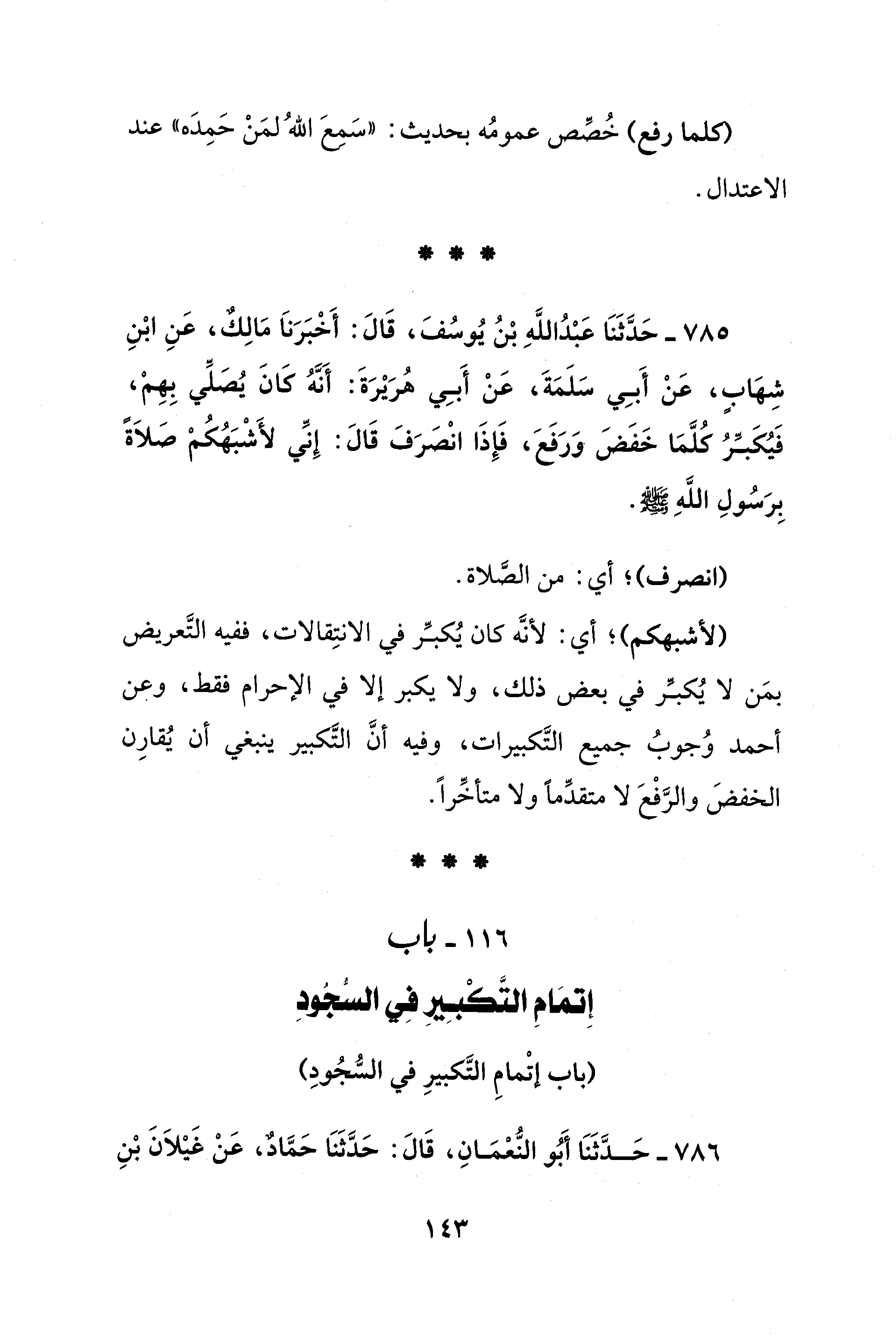 785 - حَدَّثَنَا عَبْدُ اللَّهِ بْنُ يُوسُفَ، قَالَ: أَخْبَرَنَا مَالِكٌ، عَنِ ابْنِ شِهَابٍ، عَنْ أَبِي سَلَمَةَ، عَنْ أَبِي هُرَيْرَةَ: أَنَّهُ كَانَ يُصَلِّي بِهِمْ، فَيُكَبِّرُ كُلَّمَا خَفَضَ وَرَفَعَ، فَإِذَا انْصَرَفَ قَالَ: إِنِّي لأَشْبَهُكُمْ صَلاَةً بِرَسُولِ اللَّهِ - صلى الله عليه وسلم -.