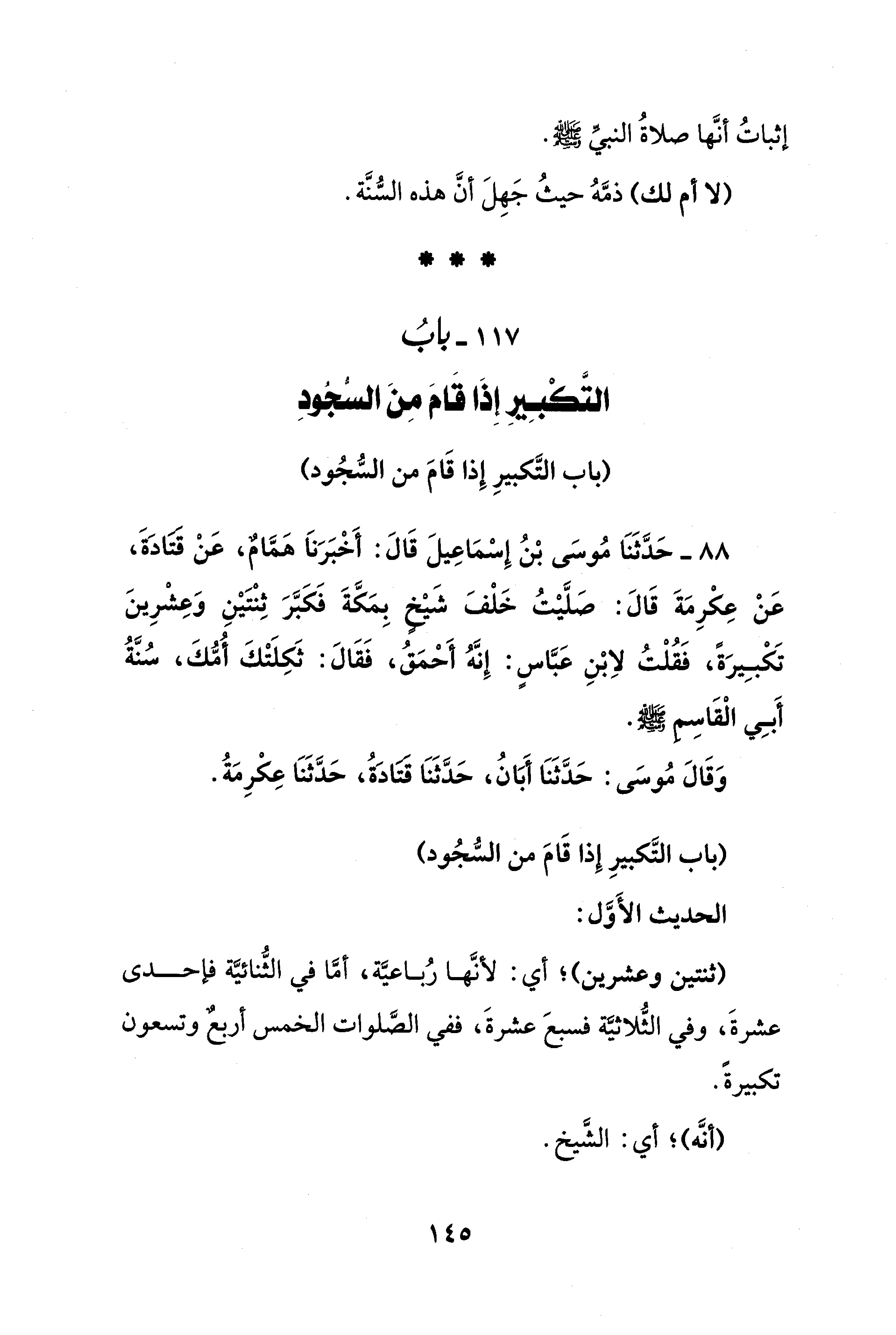 88 - حَدَّثَنَا مُوسَى بْنُ إِسْمَاعِيلَ قَالَ: أَخْبَرَناَ هَمَّامٌ، عَنْ قتادَةَ، عَنْ عِكْرِمَةَ قَالَ: صَلَّيْتُ خَلْفَ شَيْخٍ بِمَكَّةَ فَكَبَّرَ ثِنْتَيْنِ وَعِشْرِينَ تَكْبِيرَةً، فَقُلْتُ لاِبْنِ عَبَّاسٍ: إِنَّهُ أَحْمَقُ، فَقَالَ: ثَكِلَتْكَ أُمُّكَ، سُنَّةُ أَبِي الْقَاسِم - صلى الله عليه وسلم -.
