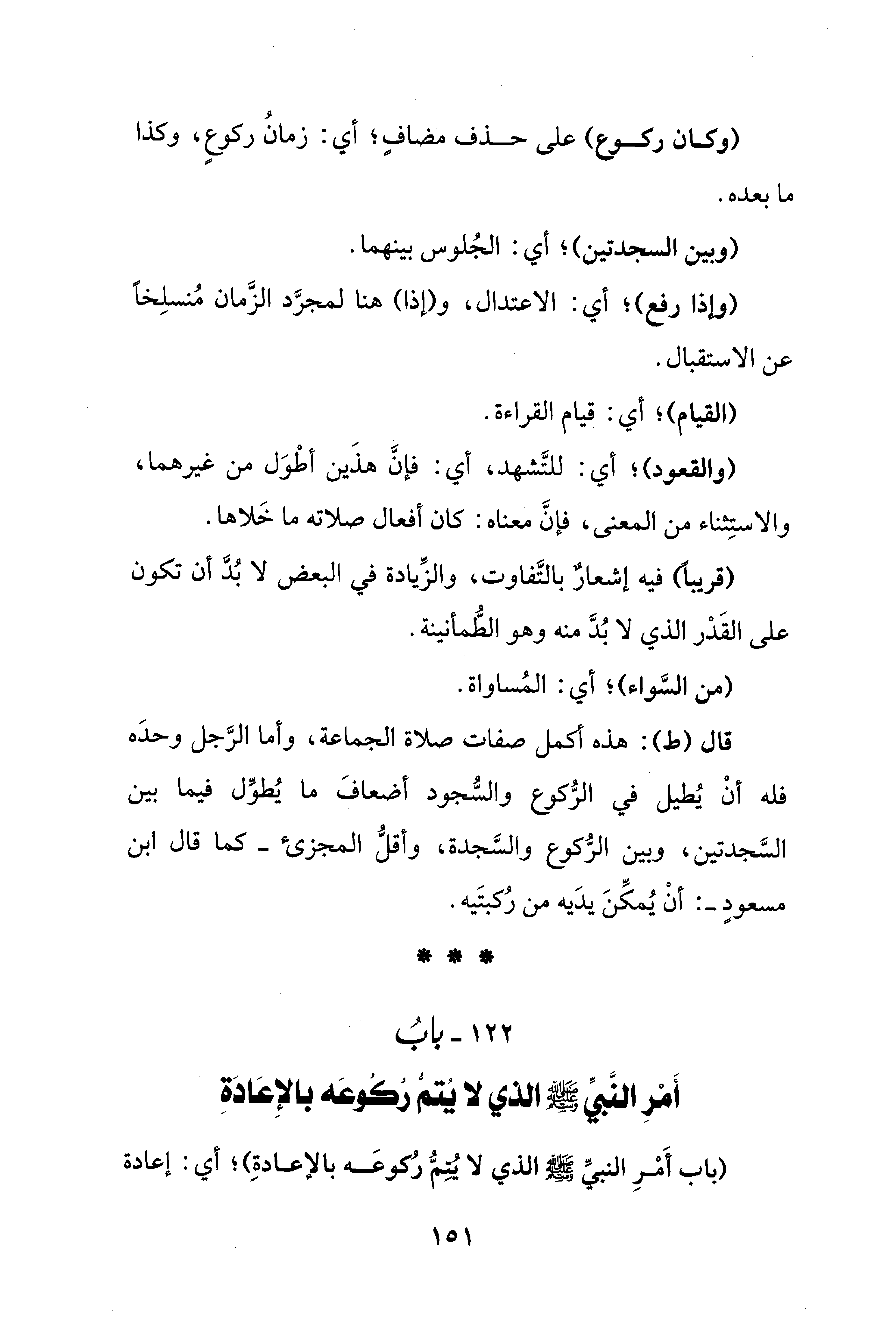 122 - بابُ أَمْرِ النَّبيِّ - صلى الله عليه وسلم - الذي لا يُتمُّ رُكُوعَه بالإِعَادَةِ