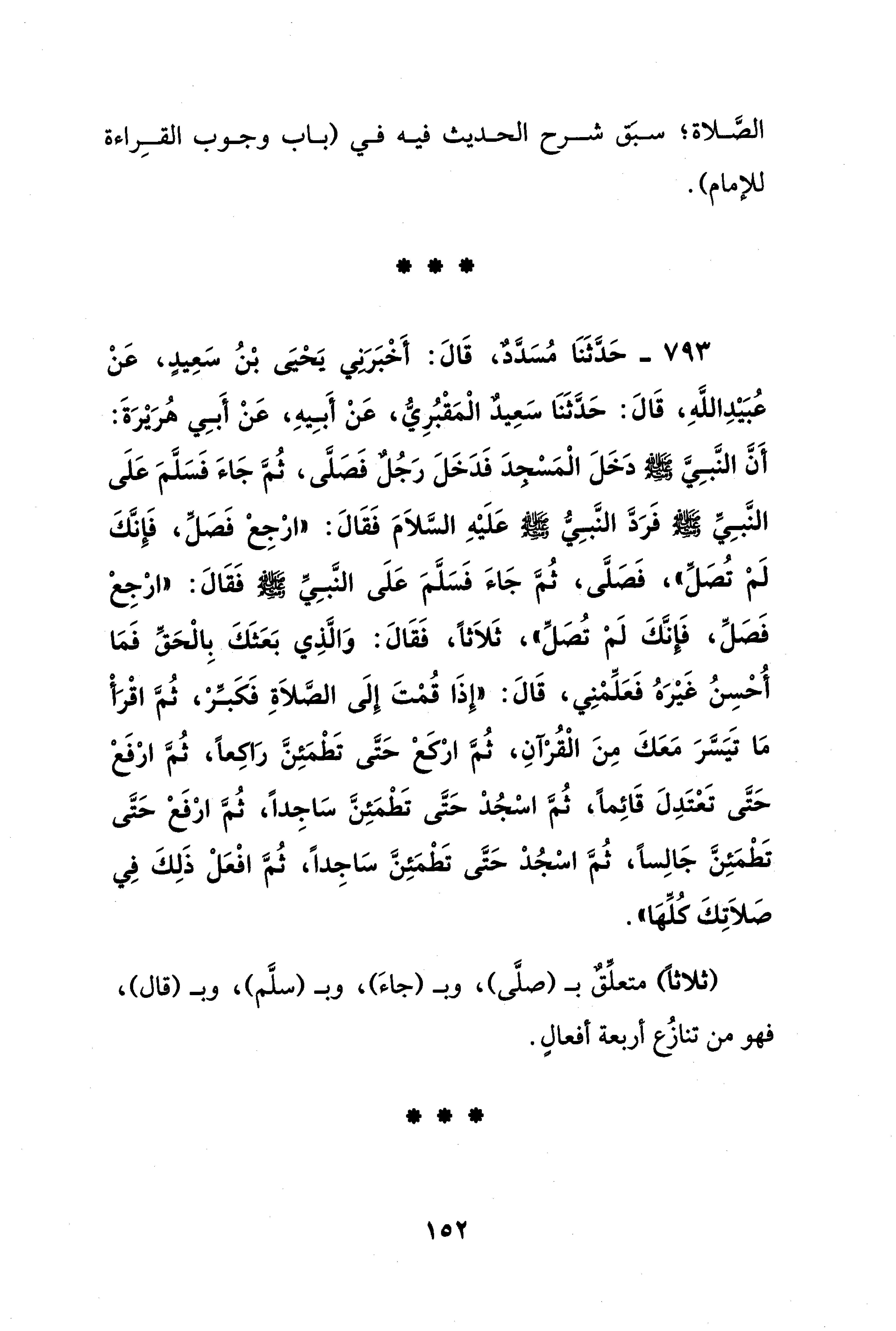 793 - حَدَّثَنَا مُسَدَّدٌ، قَالَ: أَخْبَرَنِي يَحْيَى بْنُ سَعِيدٍ، عَنْ عُبَيْدِ اللَّهِ، قَالَ: حَدَّثَنَا سَعِيدٌ الْمَقْبُرِيُّ، عَنْ أَبِيهِ، عَنْ أَبِي هُرَيْرَةَ: أَنَّ النَّبِيَّ - صلى الله عليه وسلم - دَخَلَ الْمَسْجدَ فَدَخَلَ رَجُلٌ فَصَلَّى، ثُمَّ جَاءَ فَسَلَّمَ عَلَى النَّبِيِّ - صلى الله عليه وسلم - فَرَدَّ النَّبِيُّ - صلى الله عليه وسلم - عَلَيْهِ السَّلاَمَ فَقَالَ: "ارْجِعْ فَصَلِّ، فَإِنَّكَ لَمْ تُصَلِّ"، فَصَلَّى، ثُمَّ جَاءَ فَسَلَّمَ عَلَى النَّبِيِّ - صلى الله عليه وسلم - فَقَالَ: "ارْجِعْ فَصَلِّ، فَإنَّكَ لَمْ تُصَلِّ"، ثَلاَثًا، فَقَالَ: وَالَّذِي بَعَثَكَ بِالْحَقِّ فَمَا أُحْسِنُ غَيْرَهُ فَعَلِّمْنِي، قَالَ: "إِذَا قُمْتَ إِلَى الصَّلاَةِ فَكَبِّرْ، ثُمَّ اقْرَأْ مَا تَيَسَّرَ مَعَكَ مِنَ الْقُرْآنِ، ثُمَّ ارْكَعْ حَتَّى تَطْمَئِنَّ رَاكِعًا، ثُمَّ ارْفَعْ حَتَّى تَعْتَدِلَ قَائِمًا، ثُمَّ اسْجُدْ حَتَّى تَطْمَئِنَّ سَاجِدًا، ثُمَّ ارْفَعْ حَتَّى تَطْمَئِنَّ جَالِسًا، ثُمَّ اسْجُدْ حَتَّى تَطْمَئِنَّ سَاجِدًا، ثُمَّ افْعَلْ ذَلِكَ فِي صَلاَتِكَ كلِّهَا".
