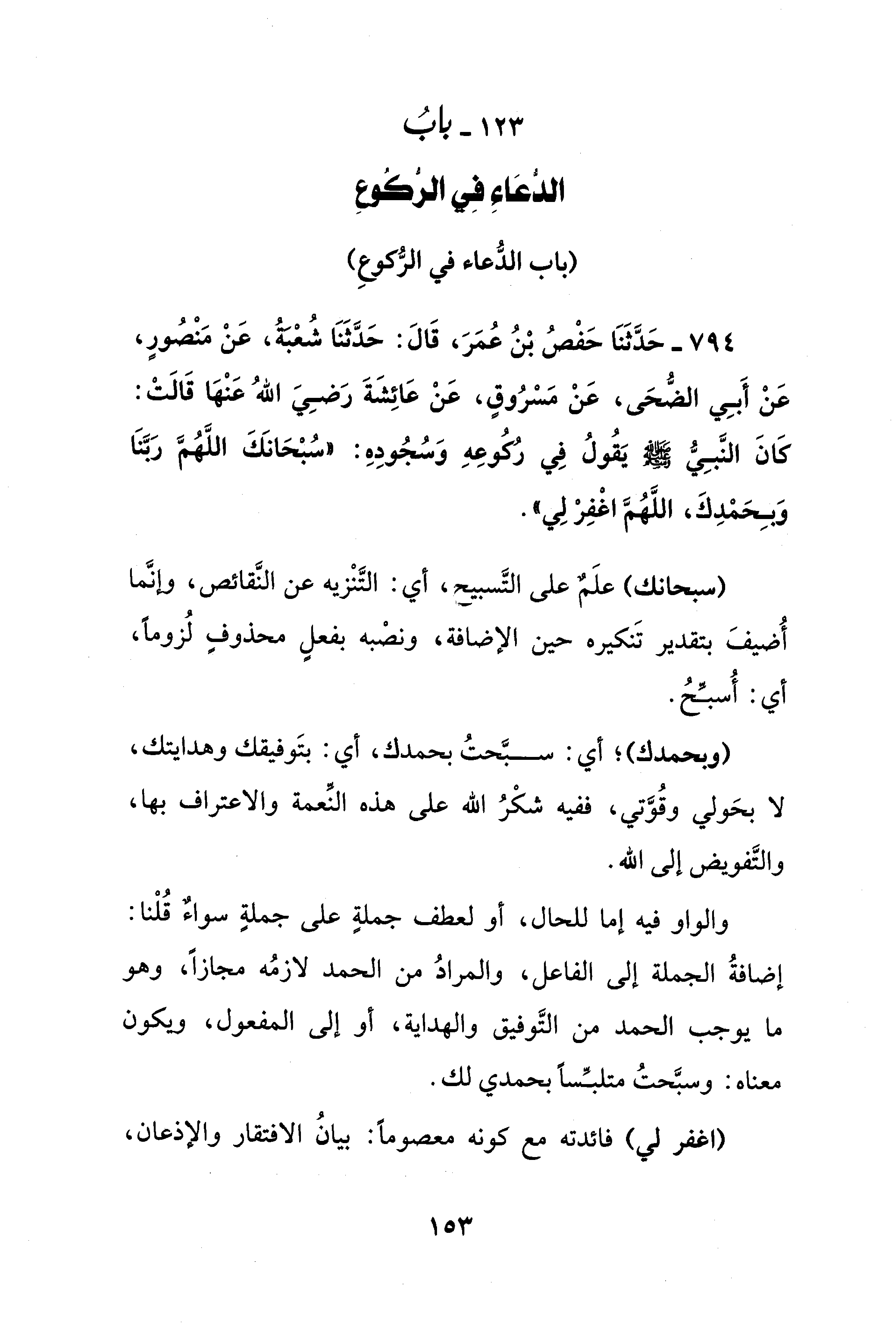 794 - حَدَّثَنَا حَفْصُ بْنُ عُمَرَ، قَالَ: حَدَّثَنَا شُعْبَةُ، عَنْ مَنْصُورٍ، عَنْ أَبِي الضُّحَى، عَنْ مَسْرُوقٍ، عَنْ عَائِشَةَ رَضِيَ اللهُ عَنْهَا قَالَتْ: كَانَ النَّبِيُّ - صلى الله عليه وسلم - يَقُولُ فِي رُكُوعِهِ وَسُجُودِهِ: "سُبْحَانَكَ اللَّهُمَّ رَبَّنَا وَبِحَمْدِكَ، اللَّهُمَّ اغْفِرْ لِي).