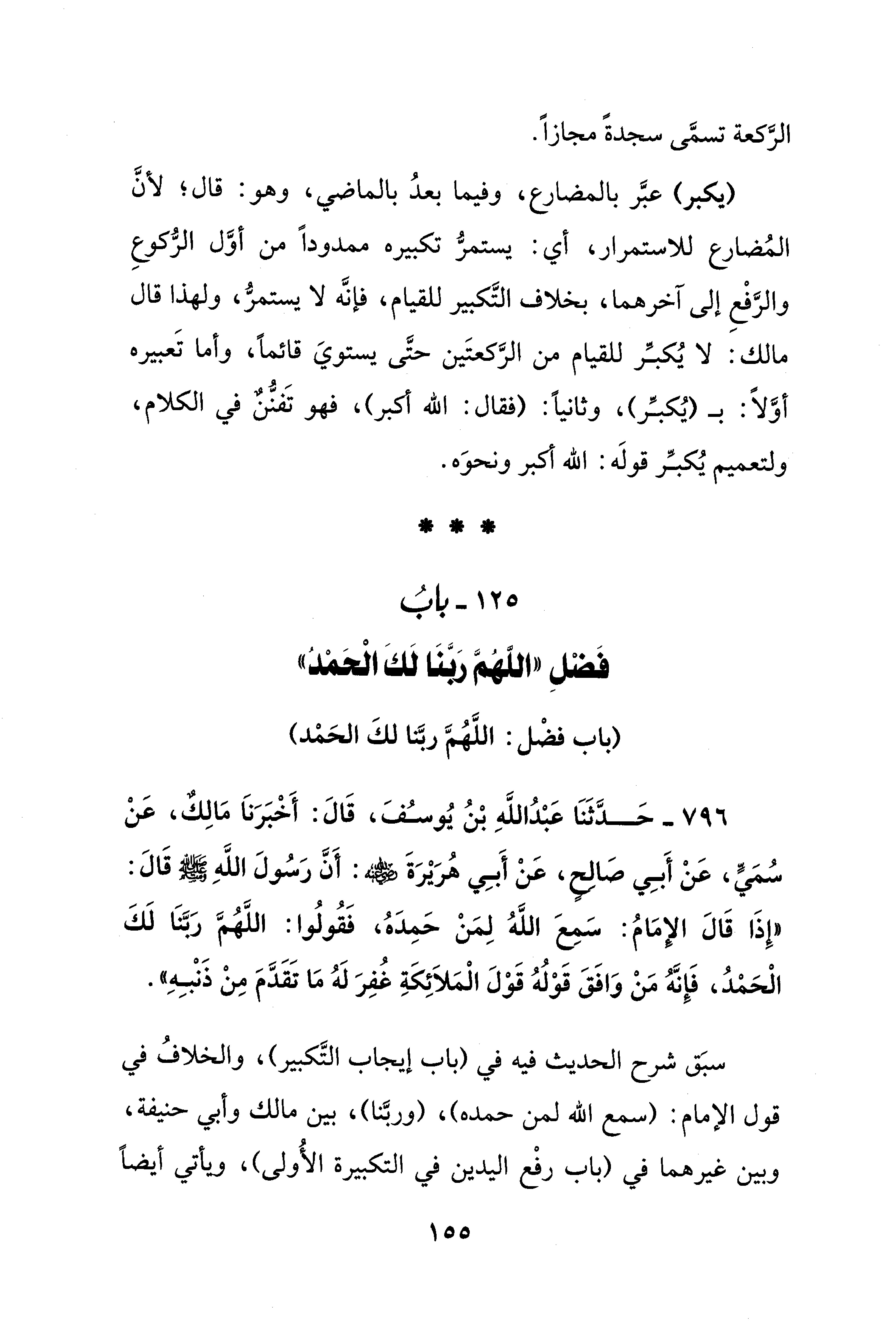 796 - حَدَّثَنَا عَبْدُ اللَّهِ بْنُ يُوسُفَ، قَالَ: أَخْبَرَناَ مَالِكٌ، عَنْ سُمَيٍّ، عَنْ أَبِي صَالِحٍ، عَنْ أَبِي هُرَيْرَةَ - رضي الله عنه -: أَنَّ رَسُولَ اللَّهِ - صلى الله عليه وسلم - قَالَ: "إِذَا قَالَ الإِمَامُ: سَمِعَ اللَّهُ لِمَنْ حَمِدَهُ، فَقُولُوا: اللَّهُمَّ رَبَّنَا لَكَ الْحَمْدُ، فَإِنَّهُ مَنْ وَافَقَ قَوْلُهُ قَوْلَ الْمَلاَئِكَةِ غُفِرَ لَهُ مَا تَقَدَّمَ مِنْ ذَنْبِهِ".