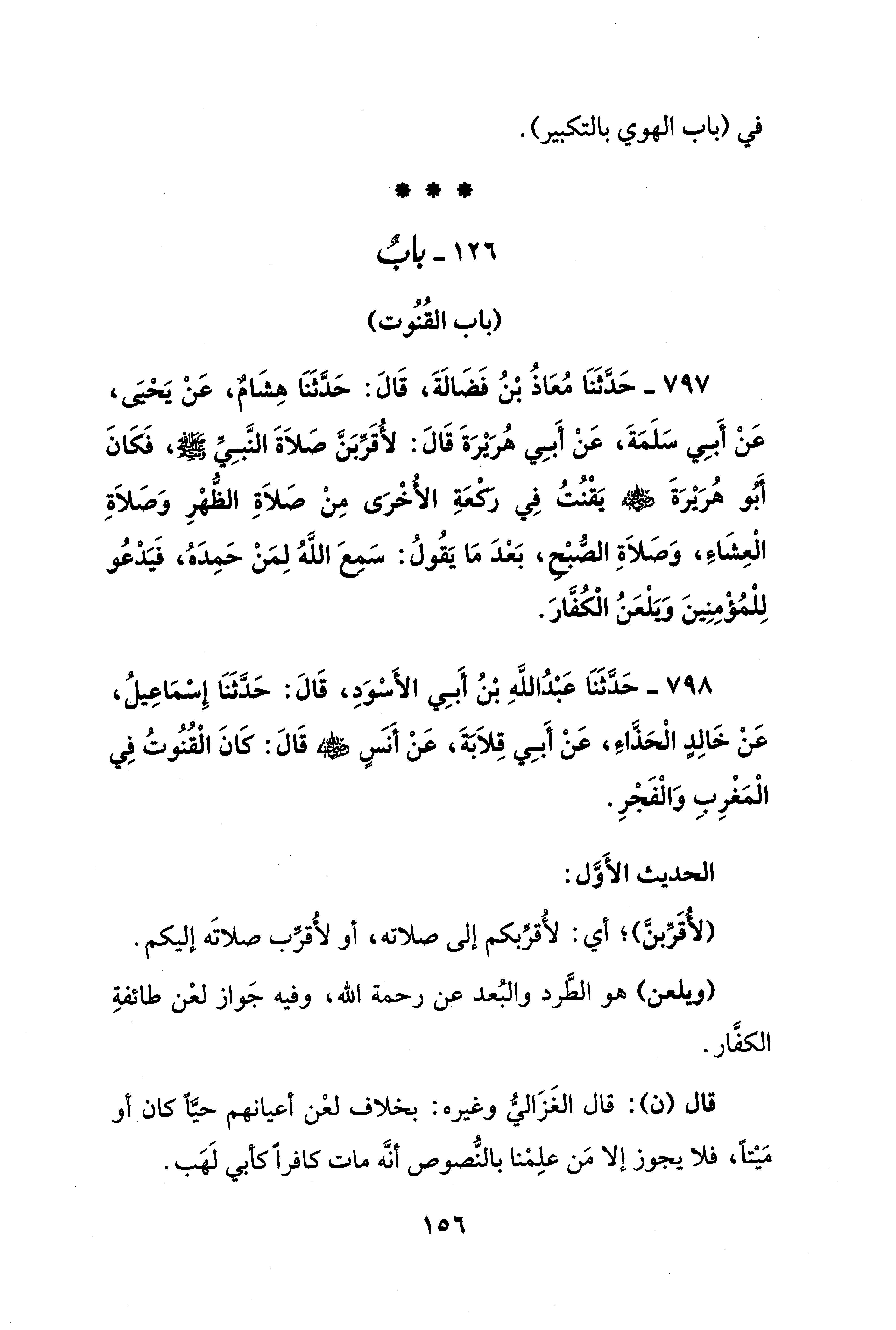 797 - حَدَّثَنَا مُعَاذُ بْنُ فَضَالَةَ، قَالَ: حَدَّثَنَا هِشَامٌ، عَنْ يَحْيَى، عَنْ أَبِي سَلَمَةَ، عَنْ أَبِي هُرَيْرَةَ قَالَ: لأقَرِّبَنَّ صَلاَةَ النَّبِيِّ - صلى الله عليه وسلم -، فَكَانَ أَبُو هُرَيْرَةَ - رضي الله عنه - يَقْنُتُ فِي رَكْعَةِ الأُخْرَى مِنْ صَلاَةِ الظُّهْرِ وَصَلاَةِ الْعِشَاءَ، وَصَلاَةِ الصُّبْح، بَعْدَ مَا يَقُولُ: سَمعَ اللَّهُ لِمَنْ حَمِدَهُ، فَيَدْعُو لِلْمُؤْمِنِينَ وَيَلْعَنُ الْكُفَّارَ.