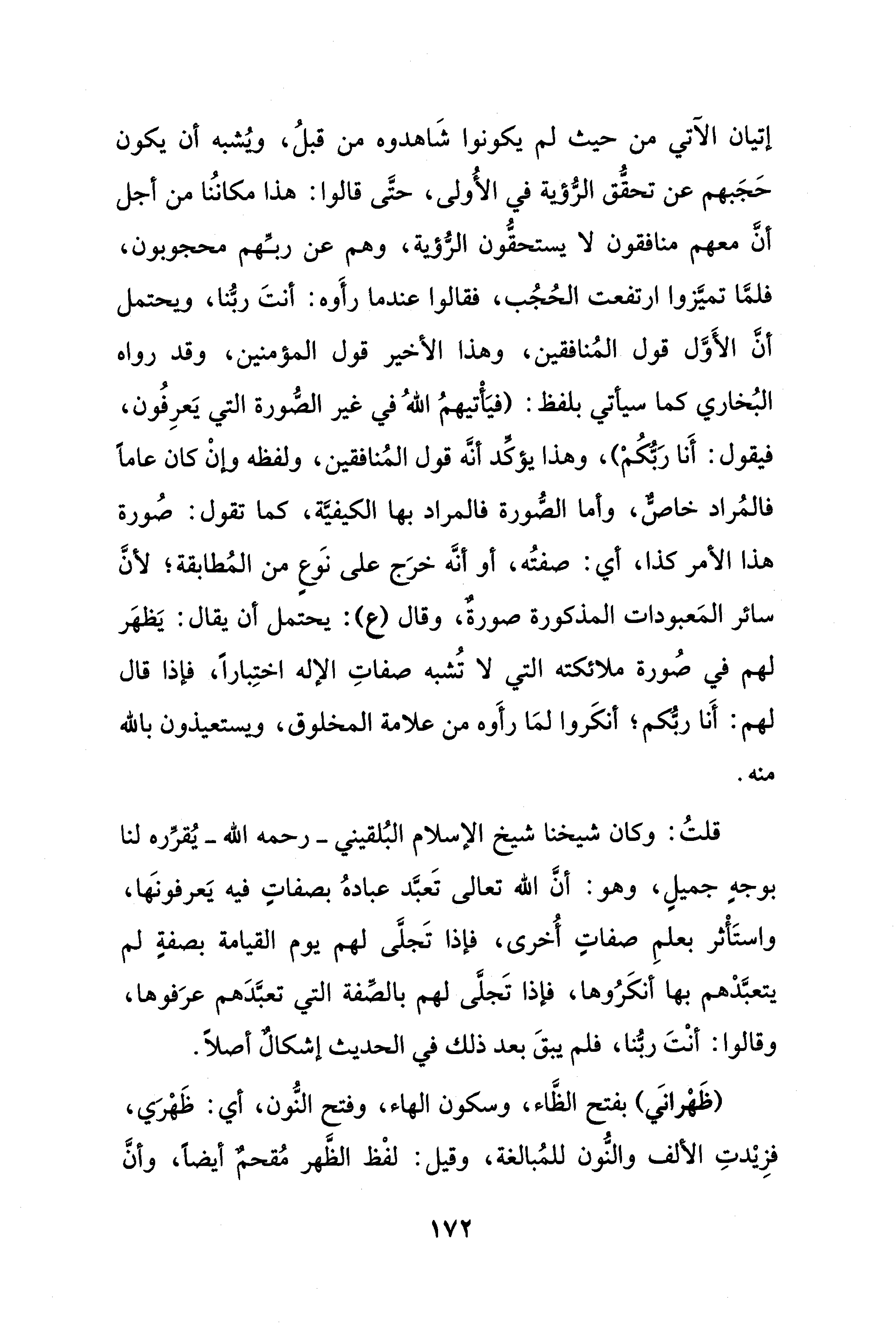 قلتُ: وكان شيخنا شيخ الإسلام البُلقيني -رحمه الله- يُقرِّره لنا بوجهٍ جميلٍ، وهو: أنَّ الله تعالى تَعبَّد عبادهُ بصفاتٍ فيه يَعرفونَها، واستَأْثر بعلمِ صفاتٍ أُخرى، فإذا تَجلَّى لهم يوم القيامة بصفةٍ لم يتعبَّدْهم بها أنكَرُوها، فإذا تَجلَّى لهم بالصِّفة التي تعبَّدَهم عرَفوها، وقالوا: أنْتَ ربنُّا، فلم يبقَ بعد ذلك في الحديث إشكالٌ أصلًا.