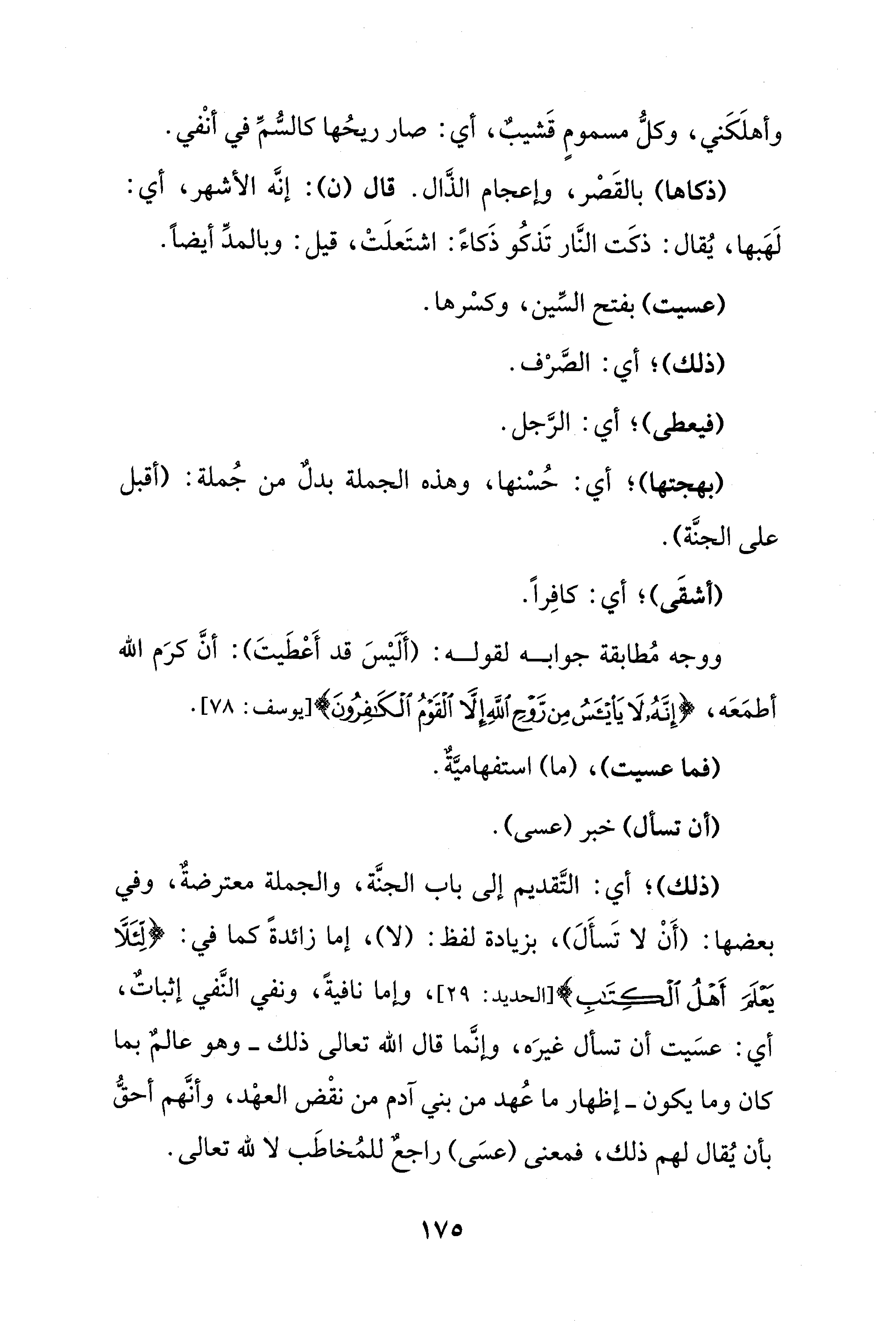 (ذكاها) بالقَصْر، وإعجام الذَّال. قال (ن): إنَّه الأشهر، أي: لَهَبها، يُقال: ذكَت النَّار تَذكُو ذَكاءً: اشتَعلَتْ، قيل: وبالمدِّ أيضًا.