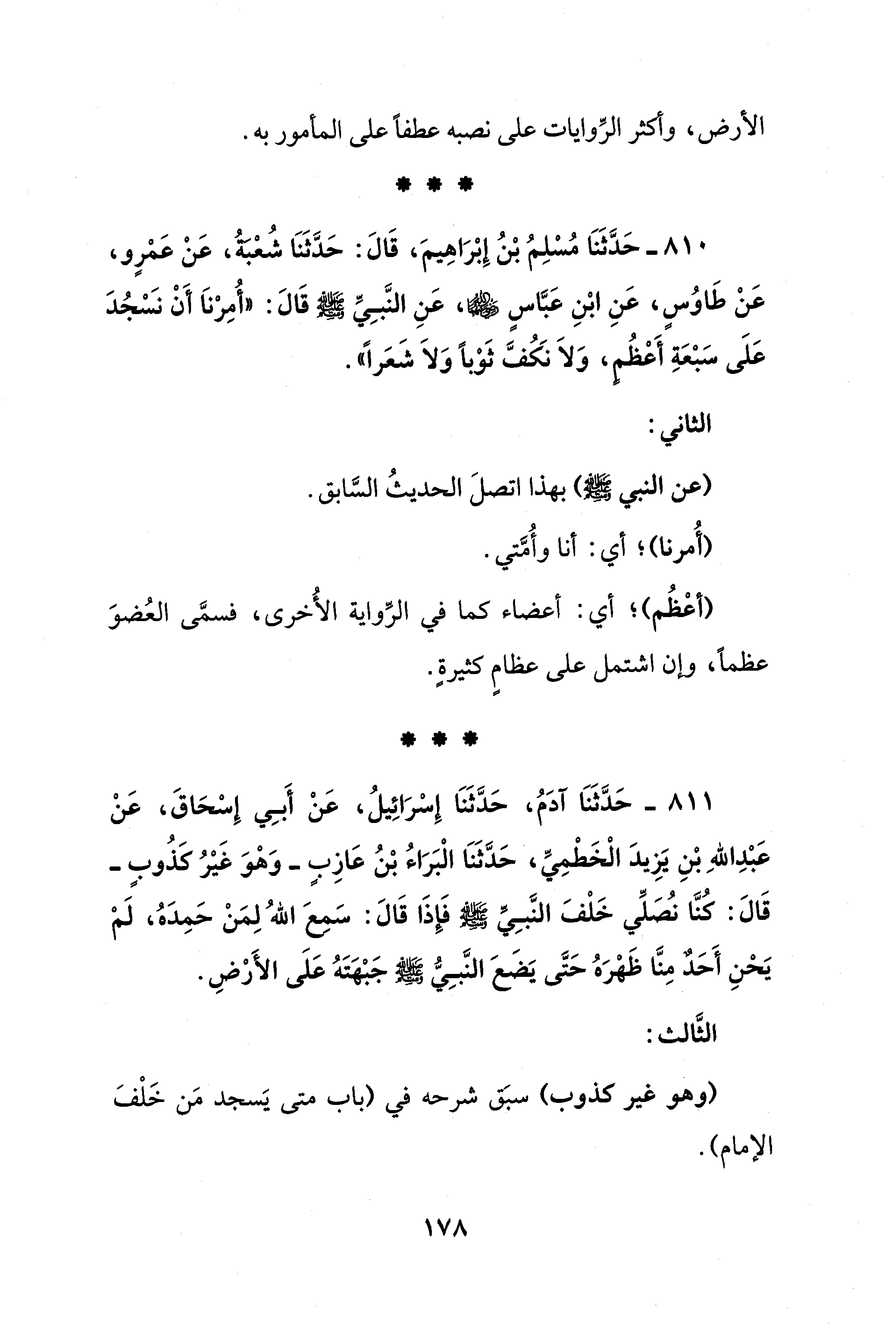 810 - حَدَّثَنَا مُسْلِمُ بْنُ إِبْرَاهِيمَ، قَالَ: حَدَّثَنَا شُعْبَةُ، عَنْ عَمْرٍو، عَنْ طَاوُسٍ، عَنِ ابْنِ عَبَّاسٍ - رضي الله عنهما -، عَنِ النَّبِيِّ - صلى الله عليه وسلم - قَالَ: "أُمِرْنَا أَنْ نسجُدَ عَلَى سَبْعَةِ أَعْظُمٍ، وَلَا نَكُفَّ ثَوْبًا وَلَا شَعَرًا".