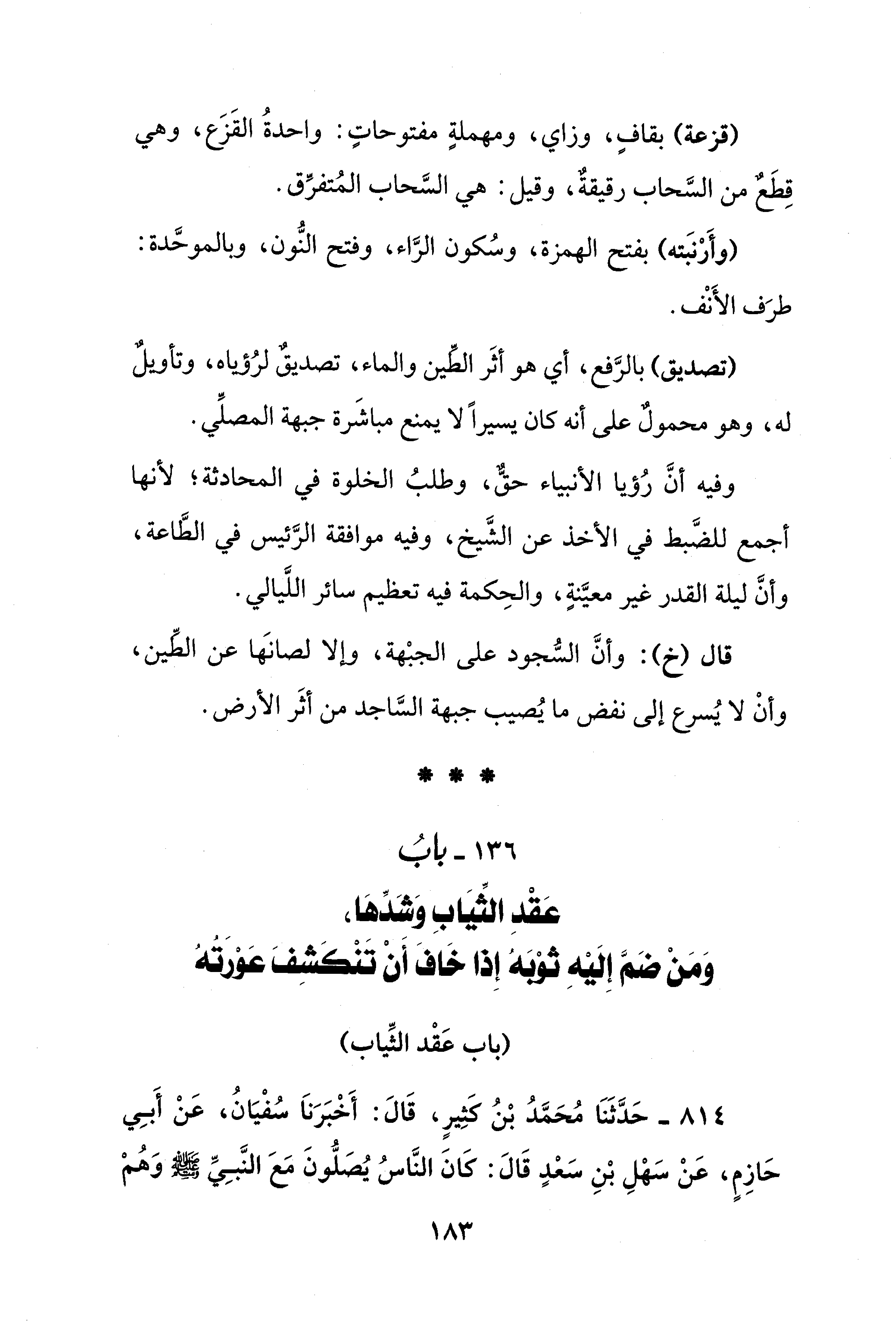 قال (خ): وأنَّ السُّجود على الجبْهة، وإلا لصانَها عن الطِّين، وأنْ لا يُسرع إلى نفض ما يُصيب جبهة السَّاجد من أثَر الأرض.